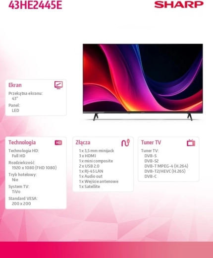 Stylowy 43" telewizor LED SHARP AQUOS zapewnia jasny i płynny obraz na dużej przekątnej, idealny do seriali, filmów i sportu. Cienkie ramki podkreślają nowoczesny wygląd i pozwalają wyeksponować sam obraz. Para szeroko rozstawionych nóżek gwarantuje stabilność na szafce RTV.