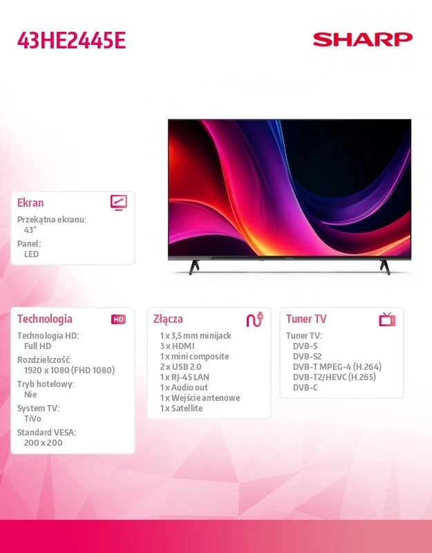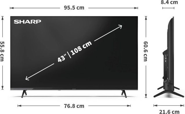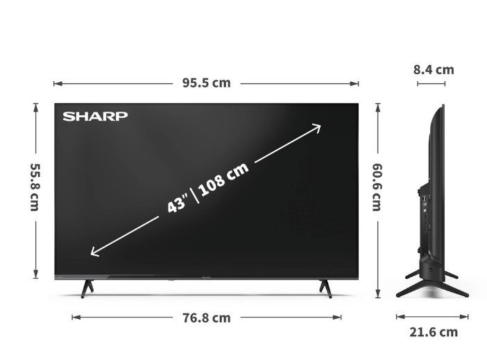 Ciesz się dużym obrazem i żywymi kolorami z 43" telewizorem LED SHARP AQUOS. Dzięki wąskiej ramce, nowoczesnemu wzornictwu i stabilnym nóżkom doskonale pasuje do każdego salonu. Szeroka gama złączy, w tym HDMI i USB, ułatwia podłączenie konsoli, odtwarzacza lub pendrive’a, a intuicyjny pilot z przyciskami Netflix, Prime Video i YouTube udostępnia ulubione aplikacje jednym naciśnięciem.