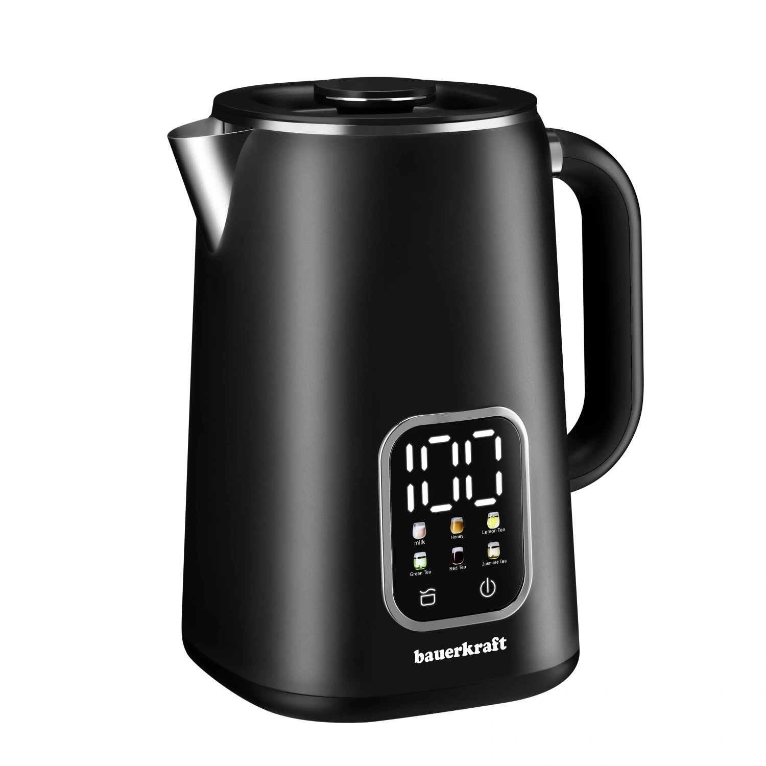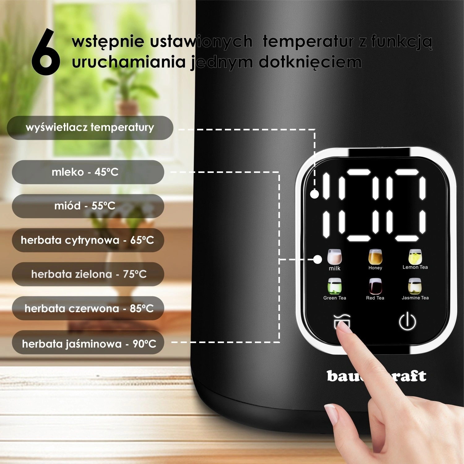 Nowoczesny czajnik elektryczny o pojemności 1,7 l do wygodnego przygotowywania kawy i herbat z precyzyjną regulacją temperatury. Oferuje 6 trybów podgrzewania, dotykowy panel sterowania, podwójne ścianki dla bezpieczeństwa i lepszego utrzymania ciepła, wewnętrzny wskaźnik poziomu wody, automatyczne wyłączanie, zabezpieczenie przed przegrzaniem/gotowaniem na sucho oraz 360° obrotową podstawę.