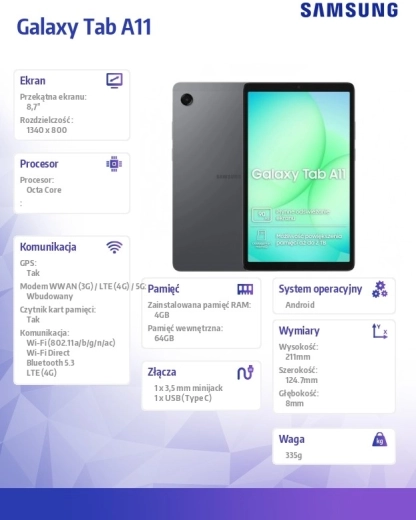 Galaxy Tab A11 w kompaktowym rozmiarze 8,7" oferuje perfekcyjną równowagę między mobilnością a komfortem oglądania wideo, czytania i przeglądania stron. Dzięki 4G/LTE pozostaniesz online nawet bez Wi‑Fi, a duża pamięć 8 GB RAM + 128 GB pamięci wewnętrznej zapewni miejsce na aplikacje, zdjęcia i treści offline.