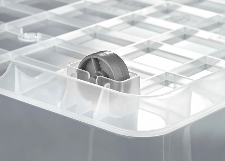 Zintegrowane kółka umożliwiają łatwe przestawianie nawet przy pełnym obciążeniu, więc bez trudu przeniesiesz pojemnik tam, gdzie jest potrzebny. Pokrywa z dwoma mocnymi klipsami gwarantuje pewne zamknięcie i ochronę przed kurzem oraz wilgocią.