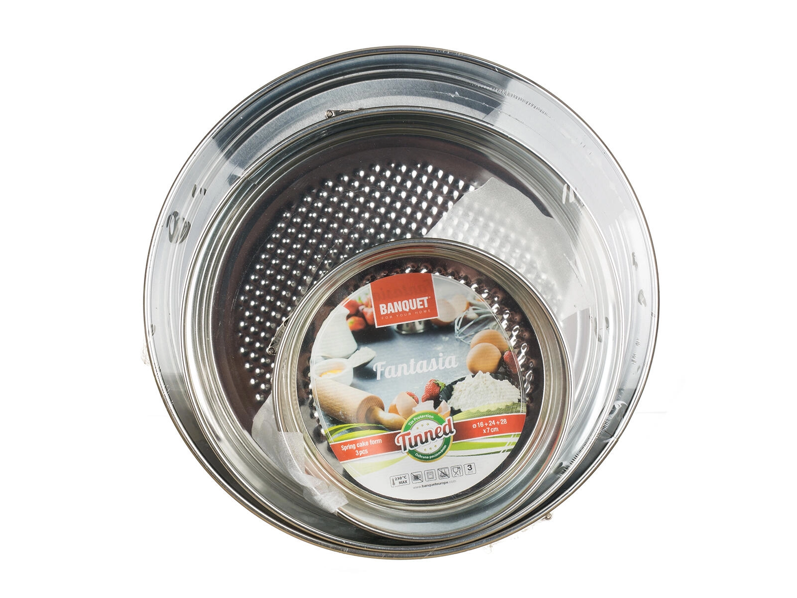 Zestaw obejmuje średnice 16 cm, 24 cm i 28 cm, wszystkie o wysokości 7 cm, więc zawsze dobierzesz idealny rozmiar. Formy nadają się do piekarników elektrycznych, gazowych i z termoobiegiem, nie są przeznaczone do zmywarki ani kuchenki mikrofalowej.