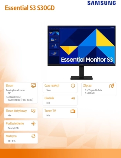 Samsung S30GD o przekątnej 27" łączy wysokiej jakości panel IPS z pełną rozdzielczością Full HD, zapewniając ostry tekst i żywe kolory. Częstotliwość odświeżania 100 Hz gwarantuje płynniejszy obraz w wideo i grach niż standardowe 60 Hz, a czas reakcji 5 ms minimalizuje rozmycia.