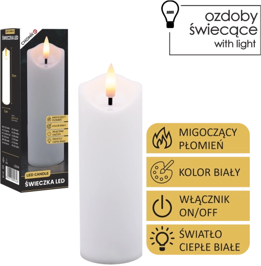 Bezpieczna i praktyczna świeca LED w eleganckim białym kolorze daje przyjemne, ciepłe światło z efektem prawdziwego płomienia. Idealna do salonu, sypialni oraz jako subtelna dekoracja świetlna na stole lub półce. Można jej używać także jako zamiennika klasycznego wkładu do lampionu/znicza.