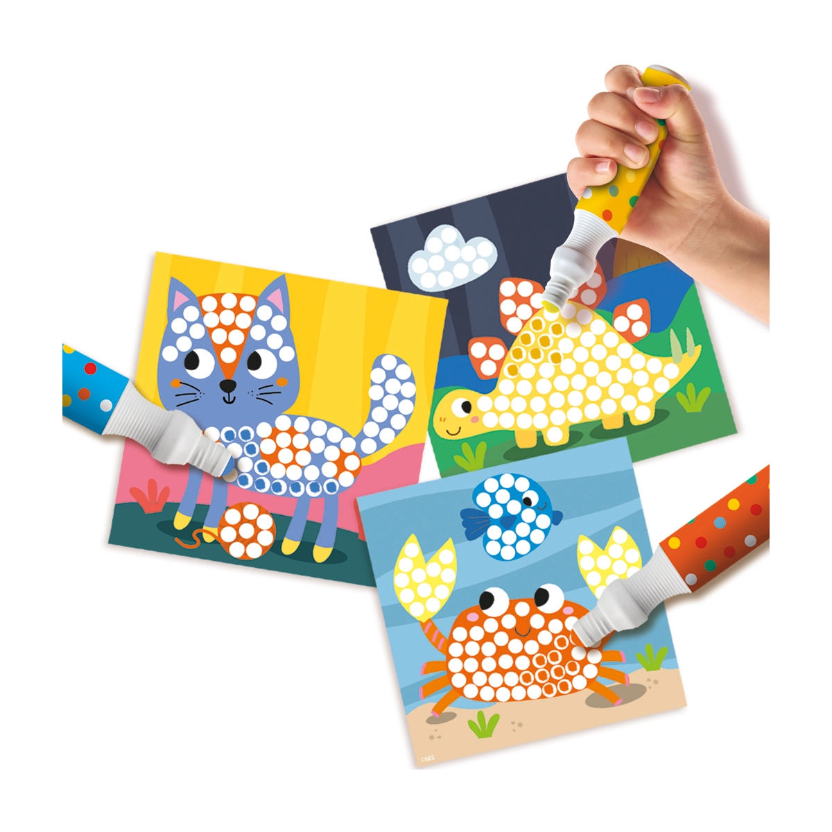 3× kropkujący flamaster XXL (żółty, pomarańczowy, niebieski), 6× karta aktywności z szablonami