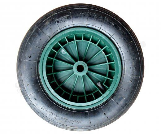 Uniwersalne pompowane koło w zielonym kolorze do taczek LIVEX zapewnia niezawodną i wygodną pracę. Dzięki średnicy 390 mm i szerokości opony 90 mm oferuje płynną jazdę, dobre tłumienie nierówności oraz długą żywotność podczas pracy w ogrodzie i na budowie.