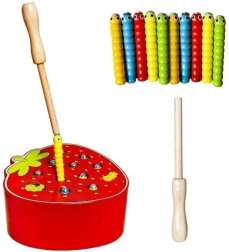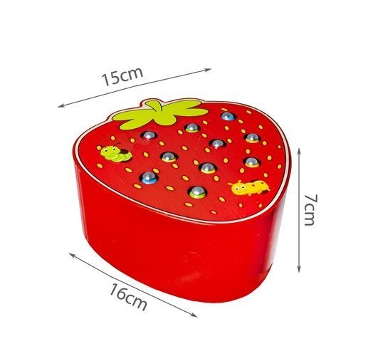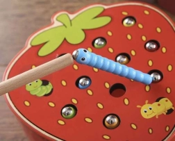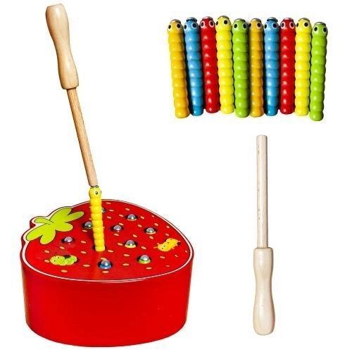 - Kompletny zestaw: drewniana truskawka, magnetyczna pałeczka i 10 robaczków/gąsienic