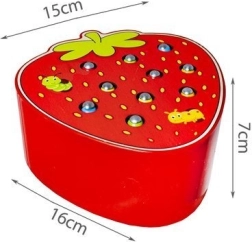 Zabawna drewniana gra w kształcie apetycznej truskawki rozwija małą motorykę i koncentrację. Dzieci za pomocą magnetycznej pałeczki wyciągają i wkładają robaczki do otworów. Gra jest wykonana z bezpiecznych materiałów i ma żywe kolory, które motywują dzieci do zabawy i nauki. Świetny wybór dla rozwoju koordynacji oko–ręka, kreatywności i cierpliwości.