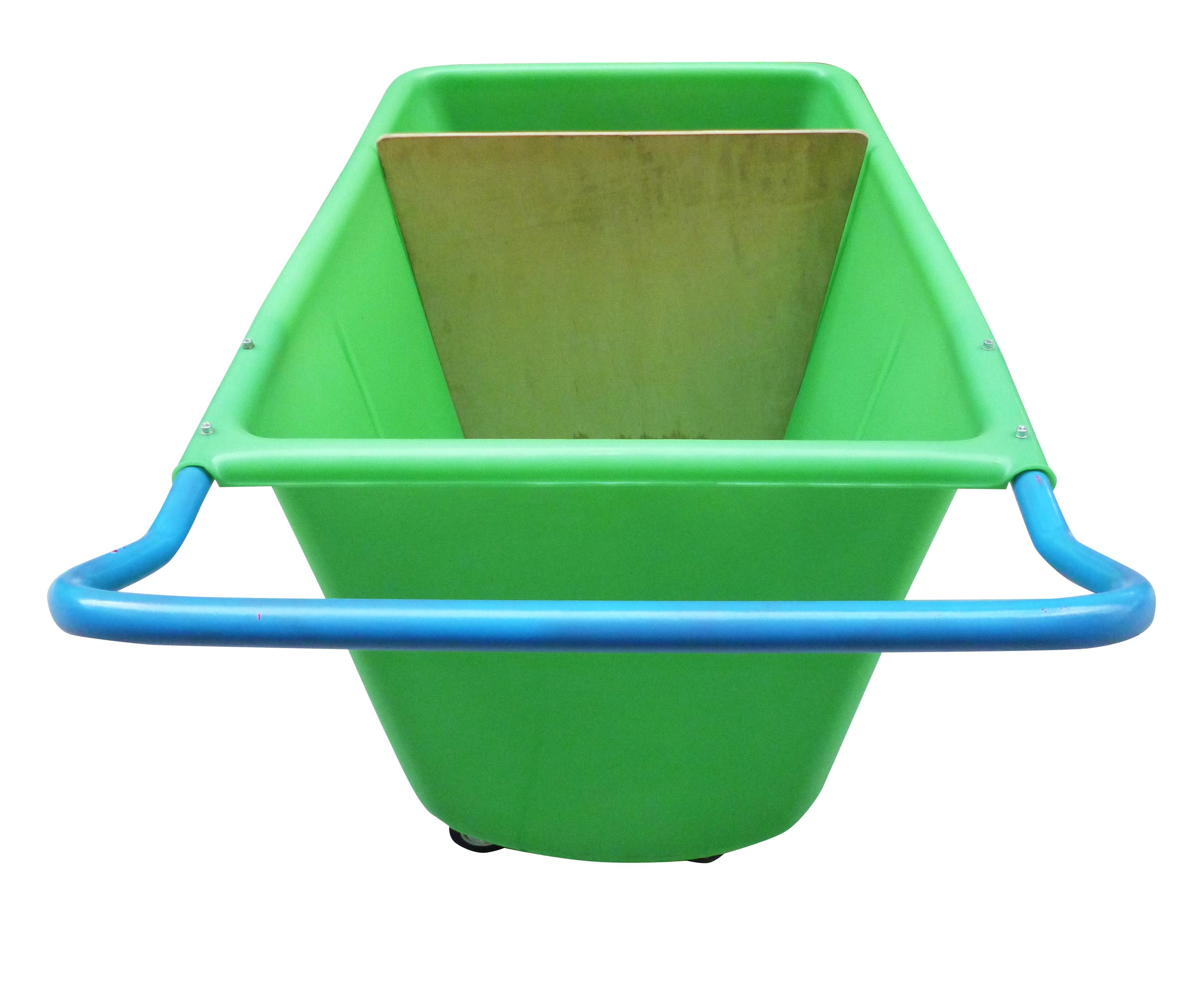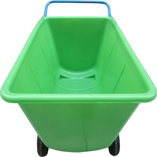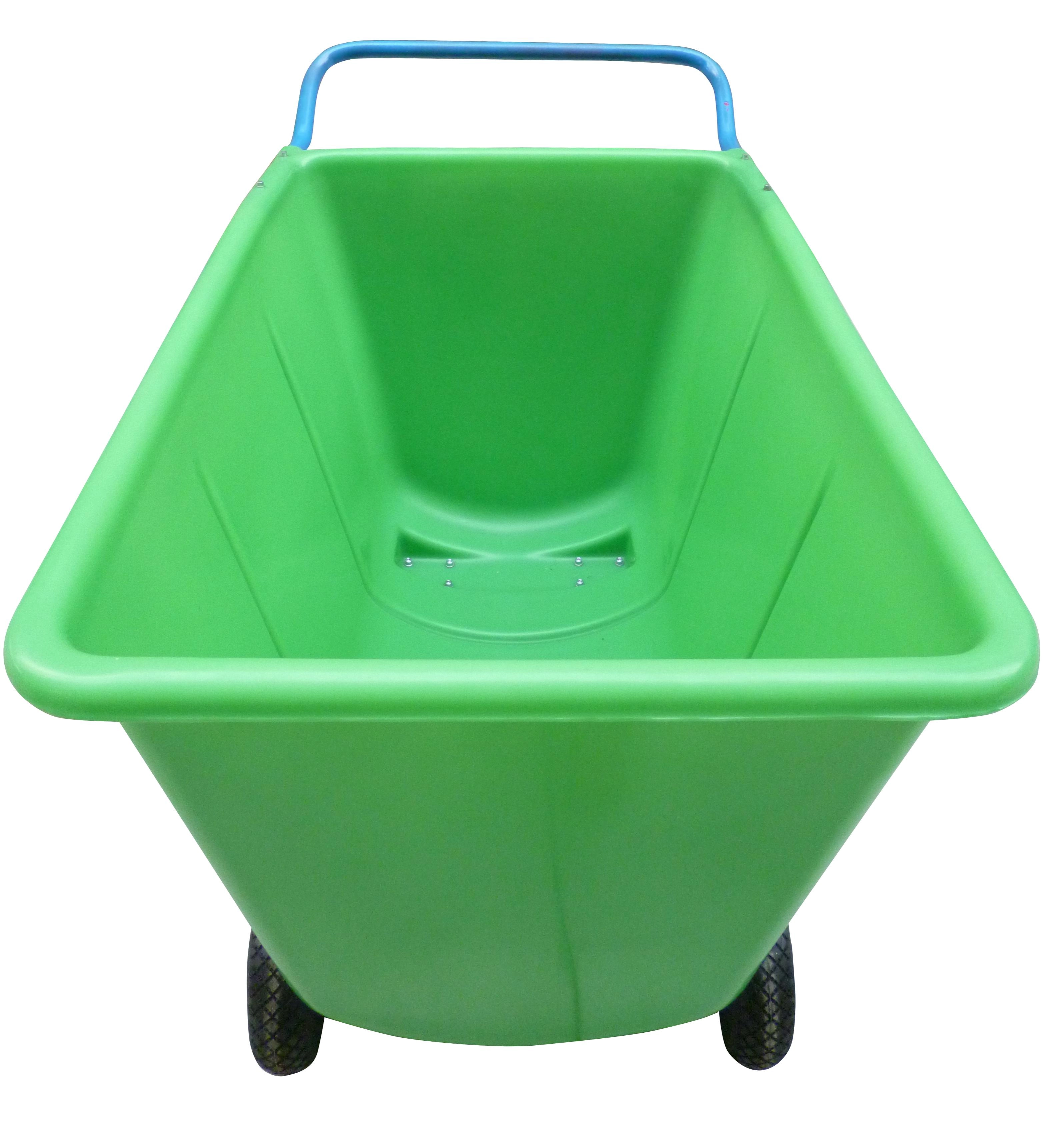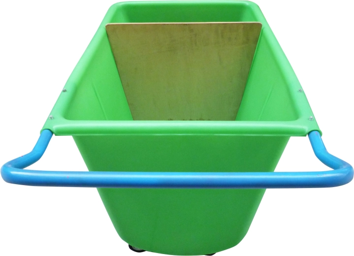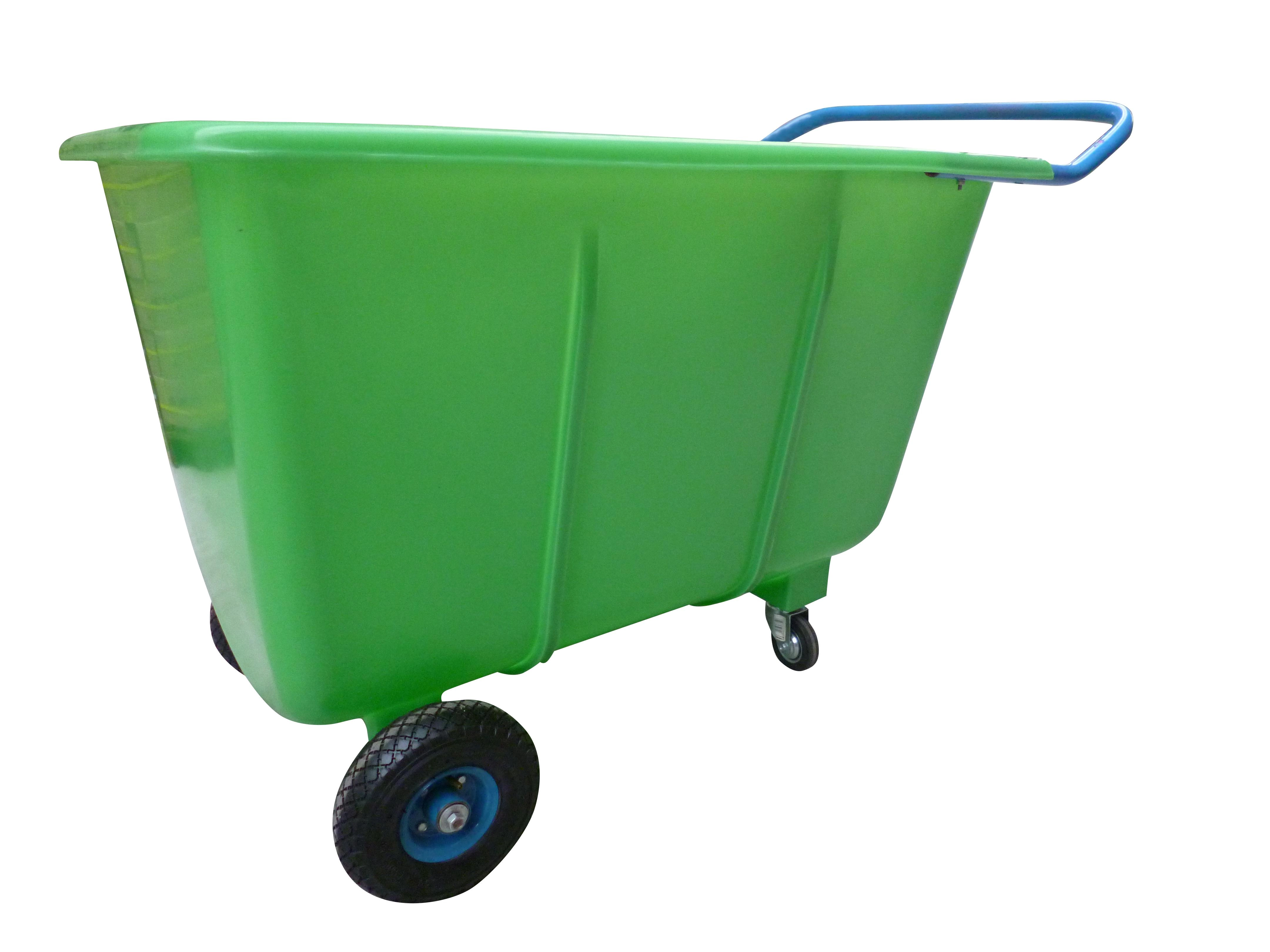 Solidny wózek transportowy ze skrzynią o pojemności 400 l jest przeznaczony do codziennej pracy w wymagających warunkach. Wytrzymała plastikowa wanna łatwo się czyści, stalowa rama z lakierem proszkowym zapewnia długą żywotność, a przednie pompowane koła 260 mm radzą sobie z nierównym podłożem. Tylne obrotowe kółka 100 mm ułatwiają manewrowanie w wąskich alejkach i przy regałach.
