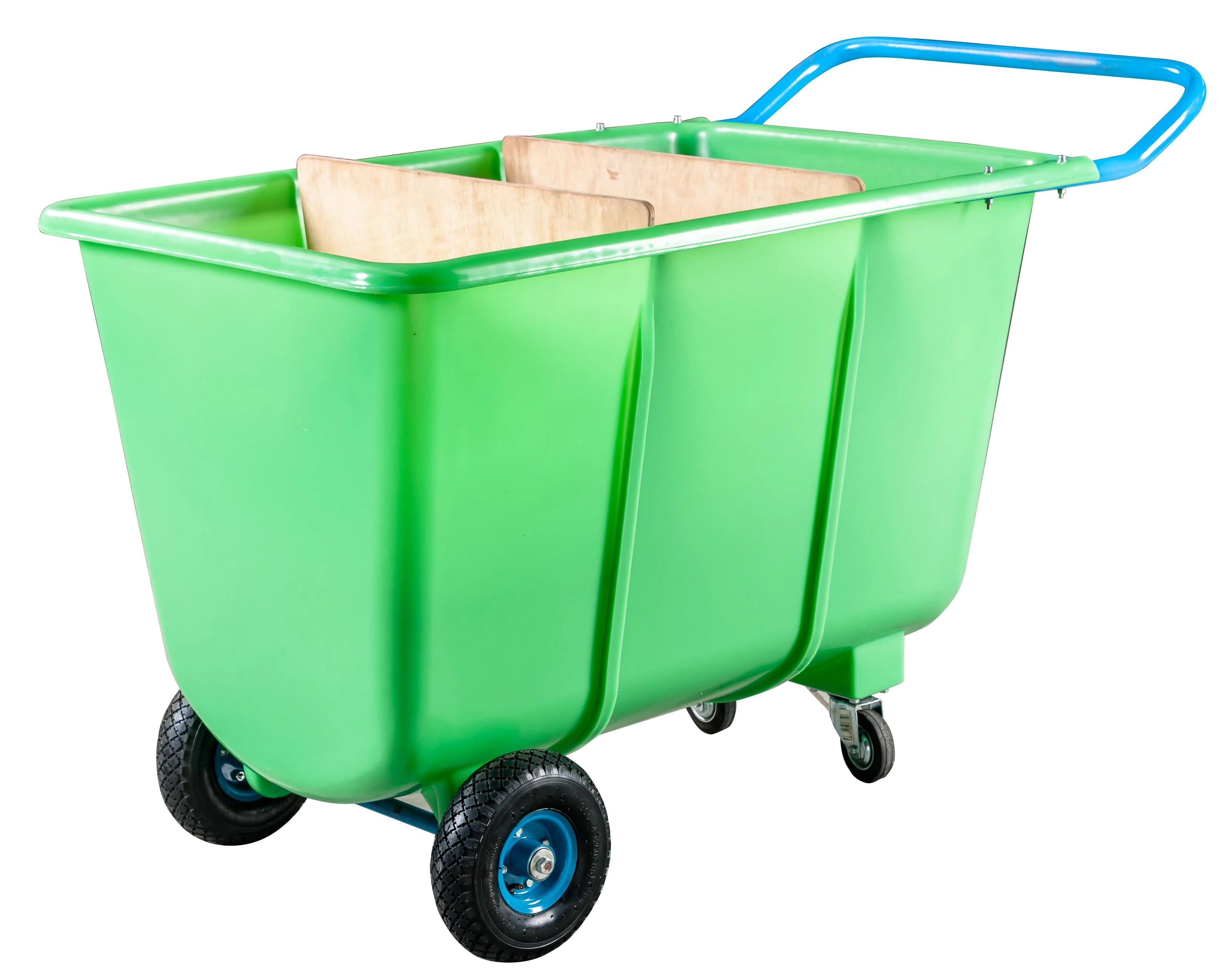 Uniwersalny czterokołowy wózek o pojemności 400 l do warsztatów, magazynów, zakładów, ogrodnictwa oraz usług porządkowych. Łączy wytrzymałą plastikową skrzynię z stalową ramą i ergonomicznym uchwytem dla łatwej obsługi nawet przy wyższym obciążeniu. Dzięki pompowanym przednim kołom i obrotowym tylnym kółkom oferuje doskonałą manewrowość, a dwie drewniane przegrody poprawiają stabilność i przejrzysty podział ładunku.