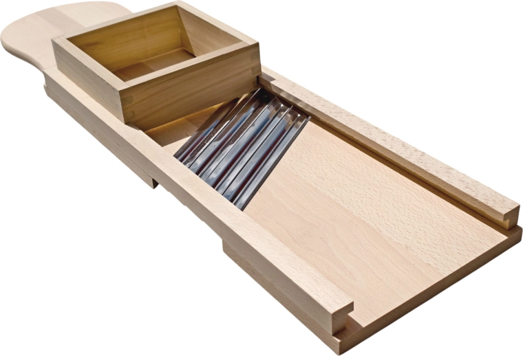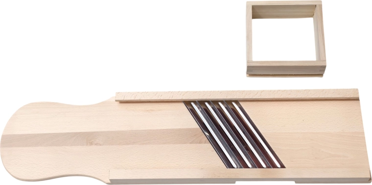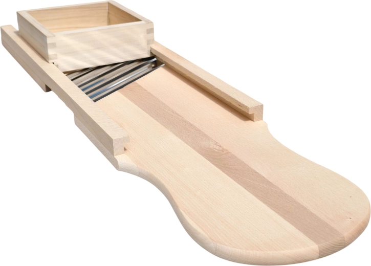 Naturalne lite drewno jest wytrzymałe, stabilne i higieniczne. Szatkownica nadaje się do użytku domowego i mniejszych zakładów.