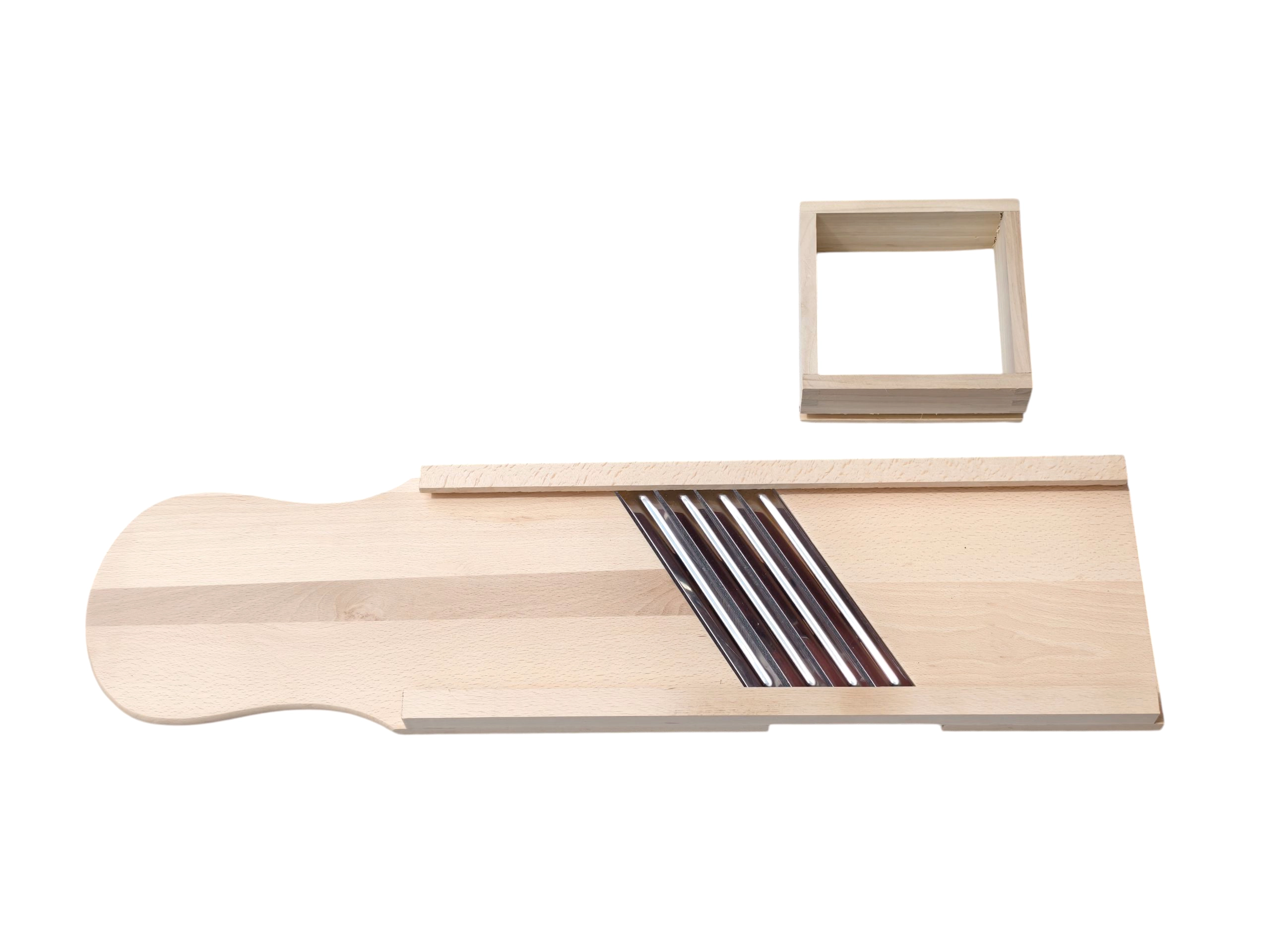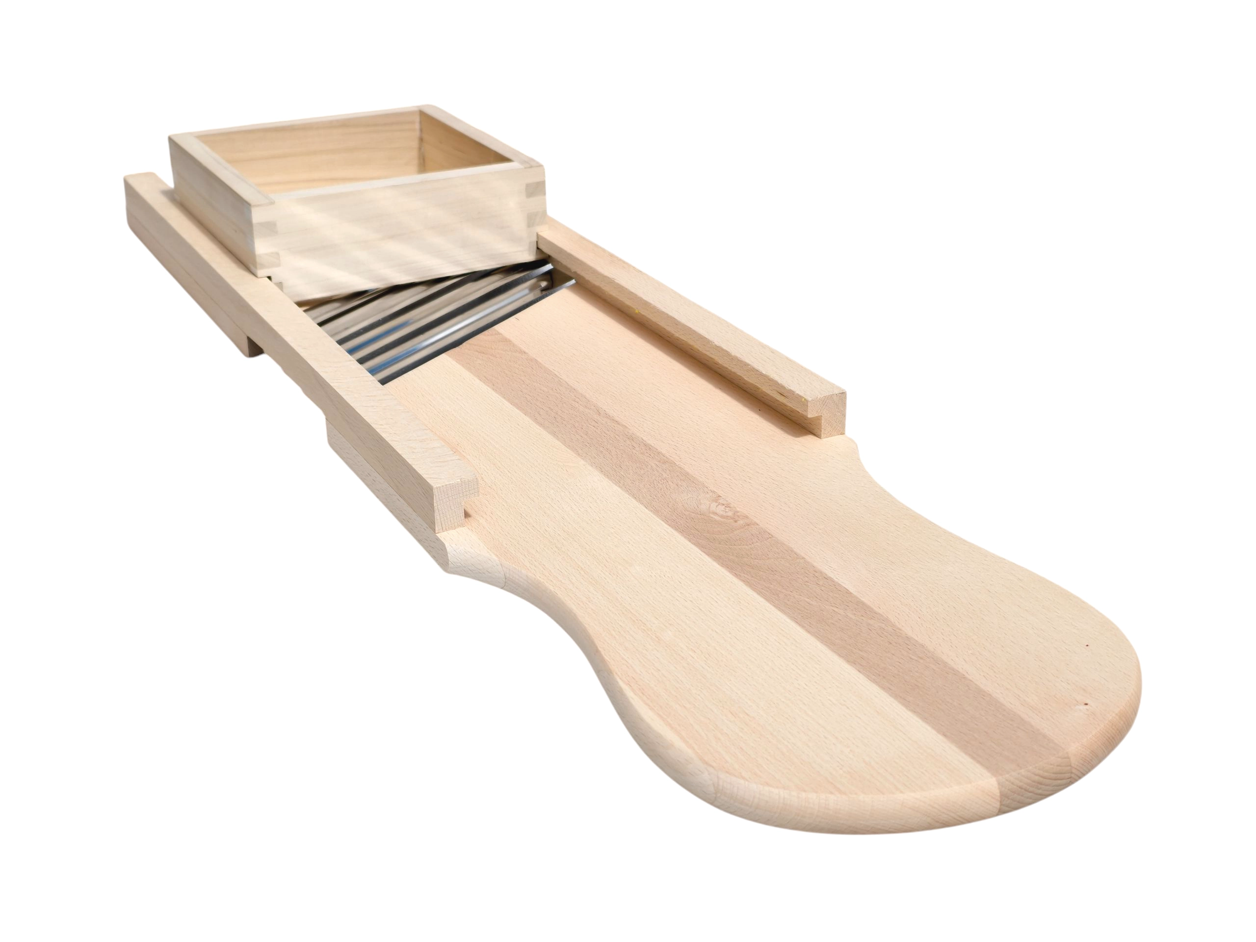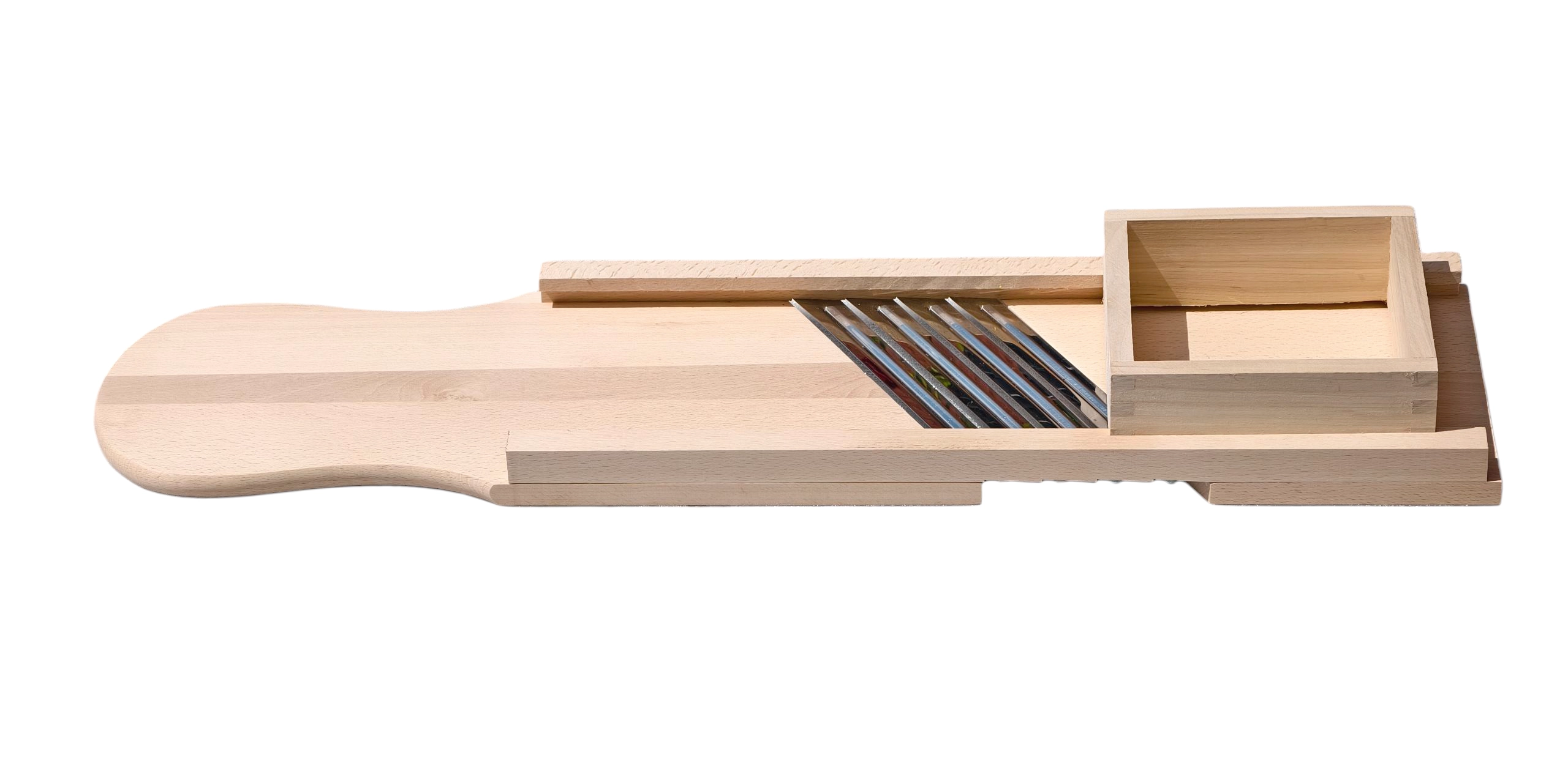 Tradycyjna drewniana szatkownica do kapusty o wymiarach 92 × 23 cm z szufladką do wygodnego prowadzenia produktu oferuje szybkie, precyzyjne i równomierne szatkowanie. Dzięki solidnemu naturalnemu drewnu oraz ostrzym nożom ze stali nierdzewnej (4 szt.) jest idealna do domu i mniejszych zakładów. Łatwa obsługa i prosta pielęgnacja czynią z niej niezawodnego pomocnika do codziennej obróbki warzyw.