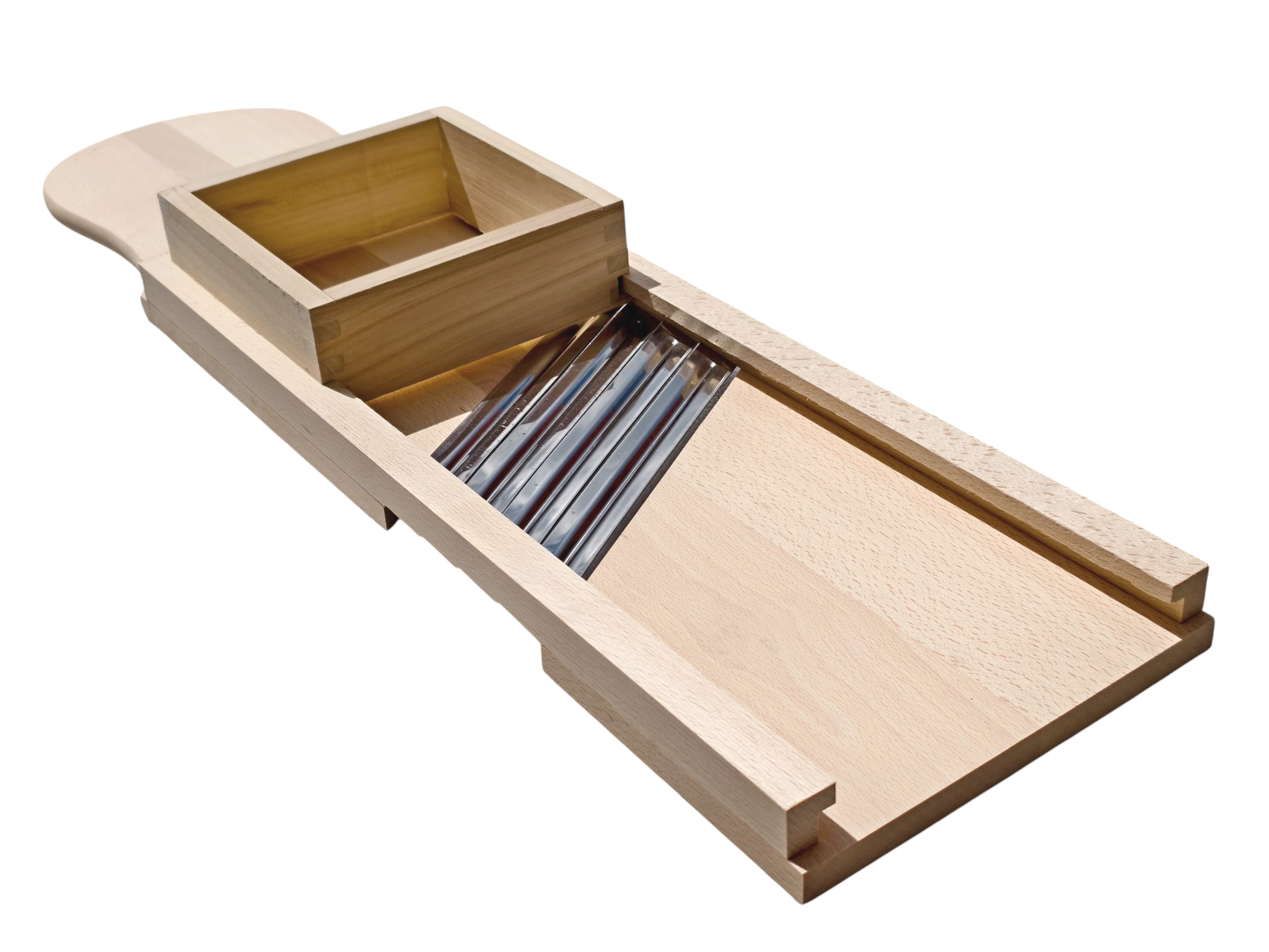 Odkryj sprawdzone rozwiązanie do przygotowywania domowej kapusty, sałatek i kiszonek. Ta duża drewniana szatkownica wykonana jest z litego, naturalnego drewna, które jest higieniczne i wyjątkowo mocne. Cztery ostre noże ze stali nierdzewnej zapewniają płynne i precyzyjne szatkowanie z równomiernymi plastrami, a zintegrowana szufladka/kierujący box bezpiecznie prowadzi składniki i chroni palce podczas pracy.
