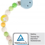 Wykonany z wysokiej jakości drewna o gładkiej powierzchni i bezpiecznych, nietoksycznych farbach. Odporność na ślinę i solidne wykonanie zapewniają długą żywotność. Uniwersalna pętelka pasuje do większości smoczków z kółkiem.