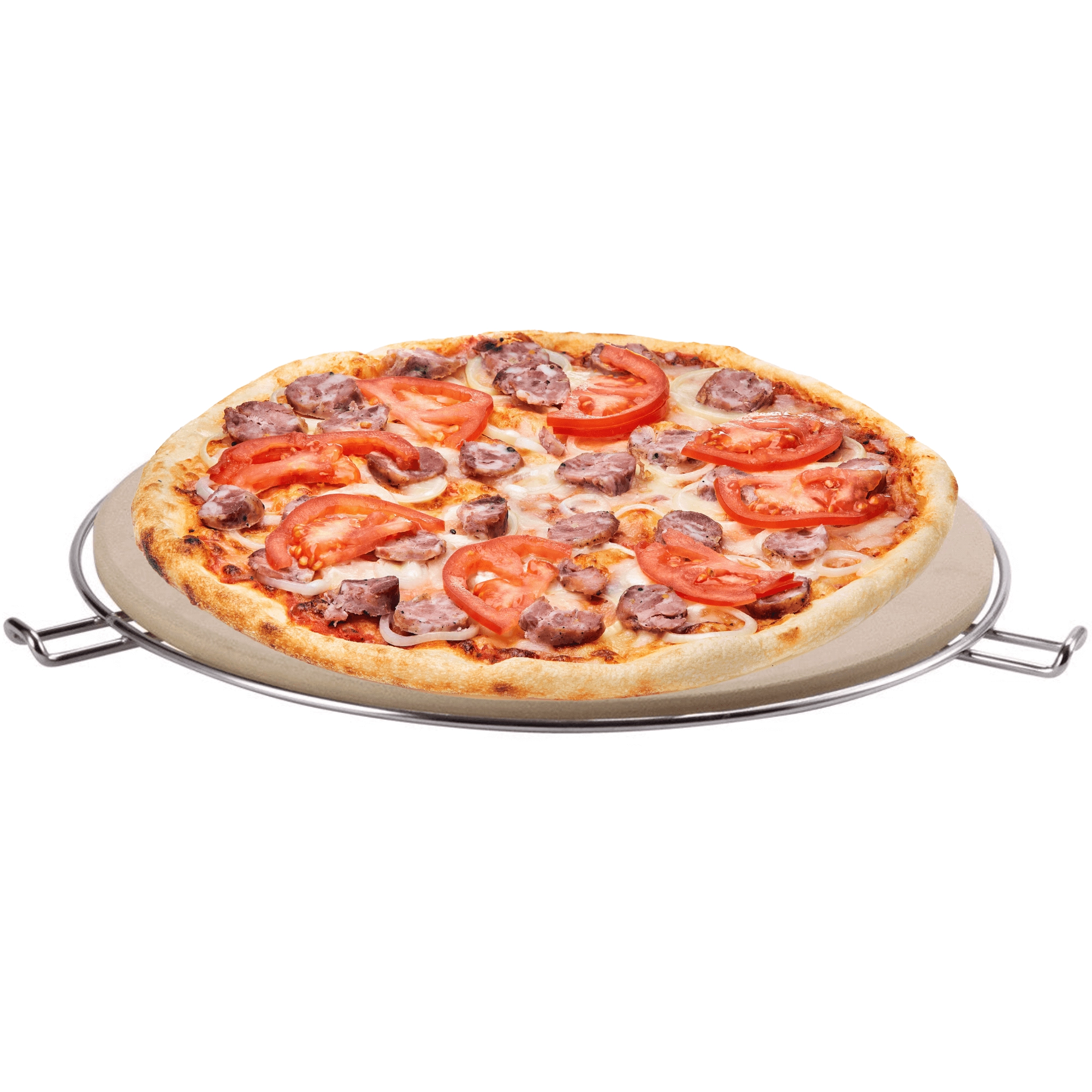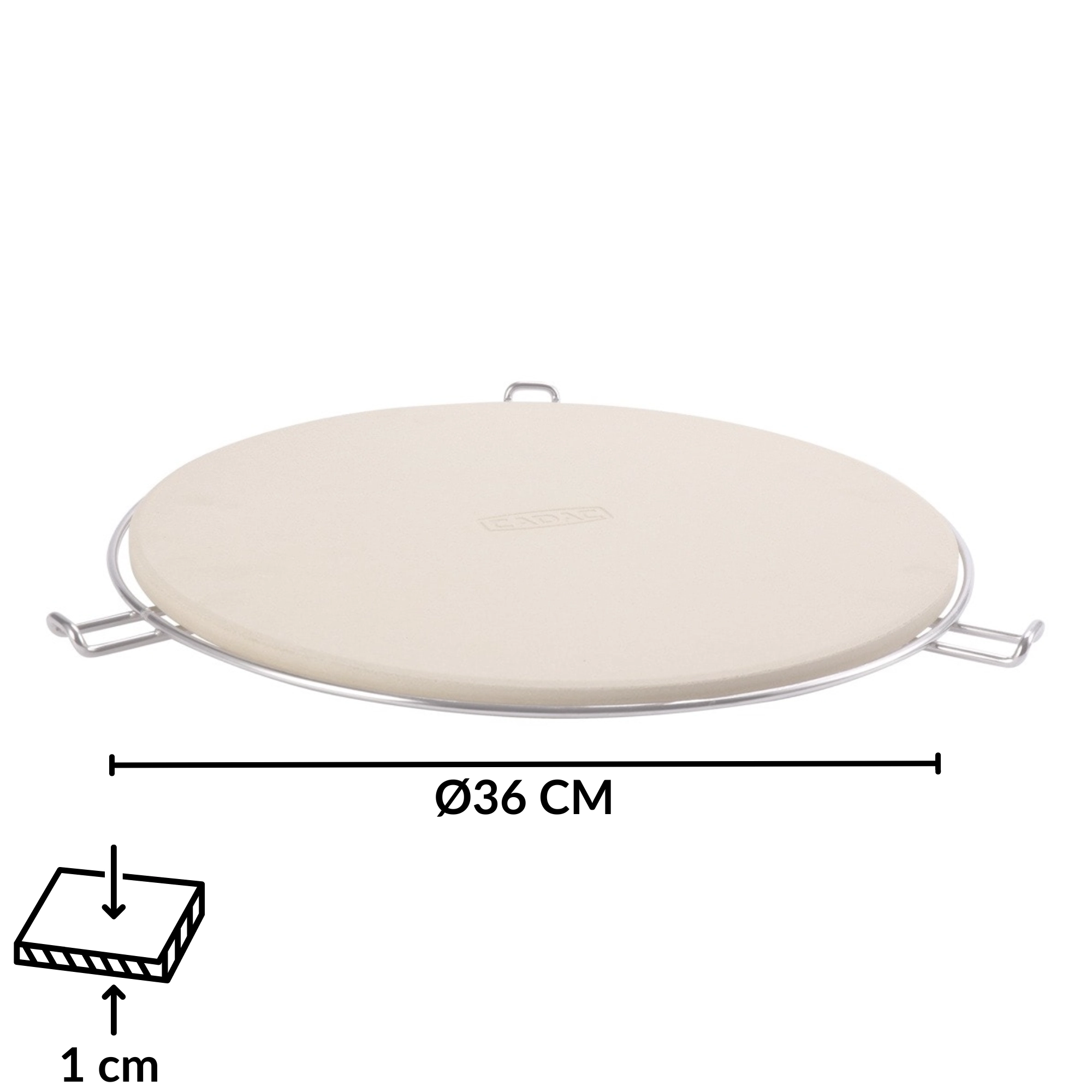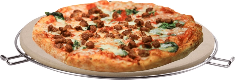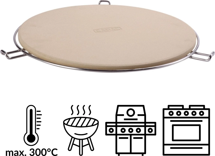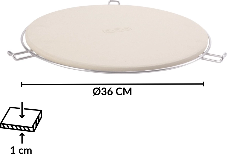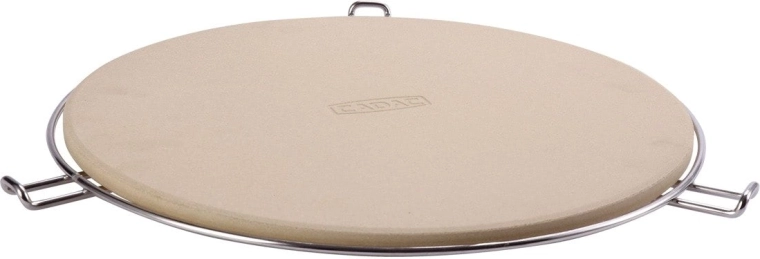 W zestawie znajduje się chromowany stojak z bocznymi uchwytami, który ułatwia przenoszenie rozgrzanego kamienia z grilla lub piekarnika na stół. Dzięki odporności do 300 °C i uniwersalnemu, okrągłemu kształtowi jest perfekcyjny do pizzy, focaccii i chleba.