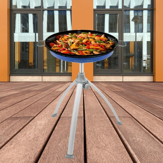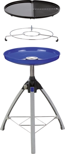 Stabilny, a jednocześnie lekki składany trójnóg z anodowanego aluminium łatwo się pakuje i sprawdzi się na kempingu, działce i w ogrodzie. Grill ma precyzyjną regulację płomienia, dużą powierzchnię 45 cm i zdejmowaną półkę na przyprawy. Zasilanie z wielokrotnie napełnianej butli gazowej z wężem i reduktorem (brak w zestawie).