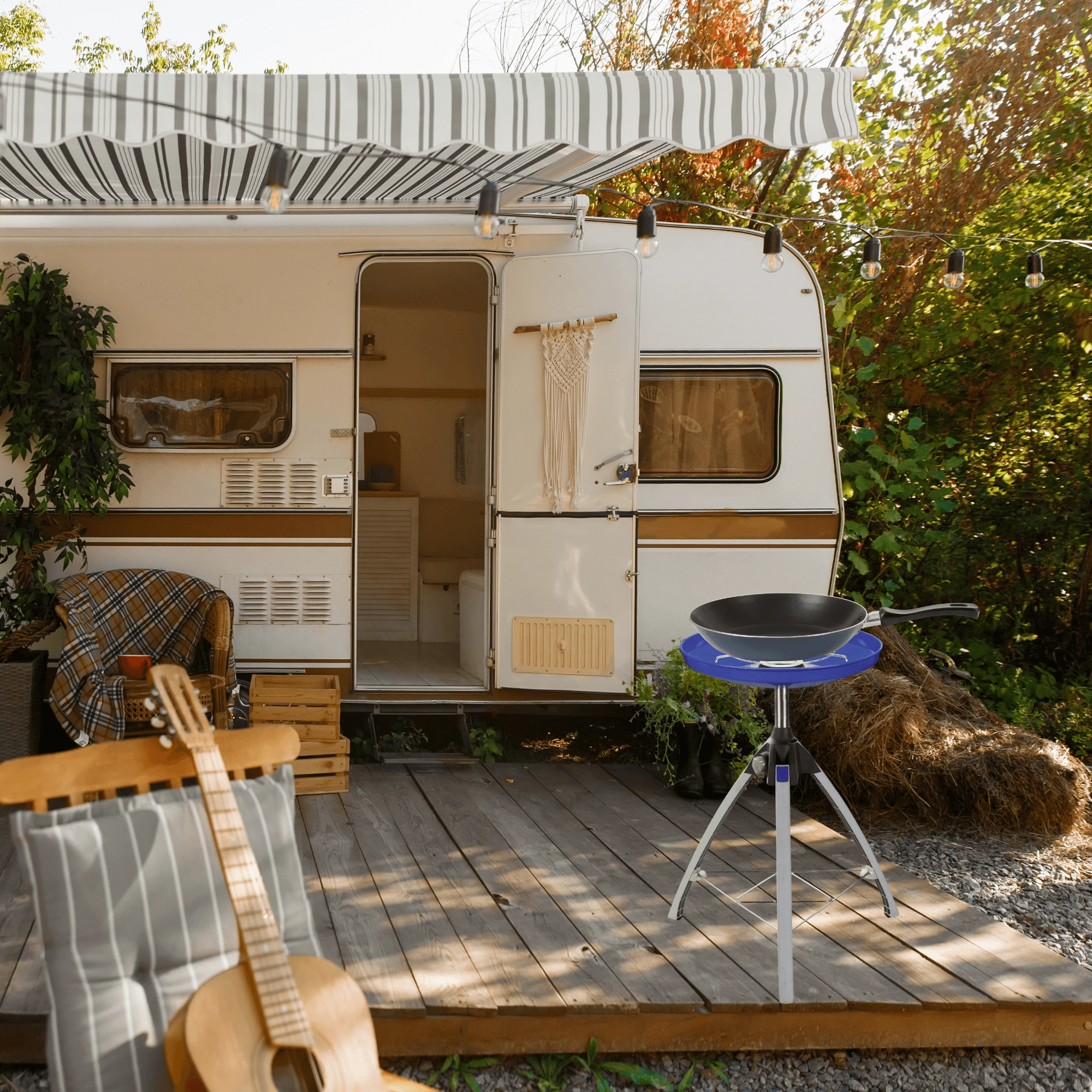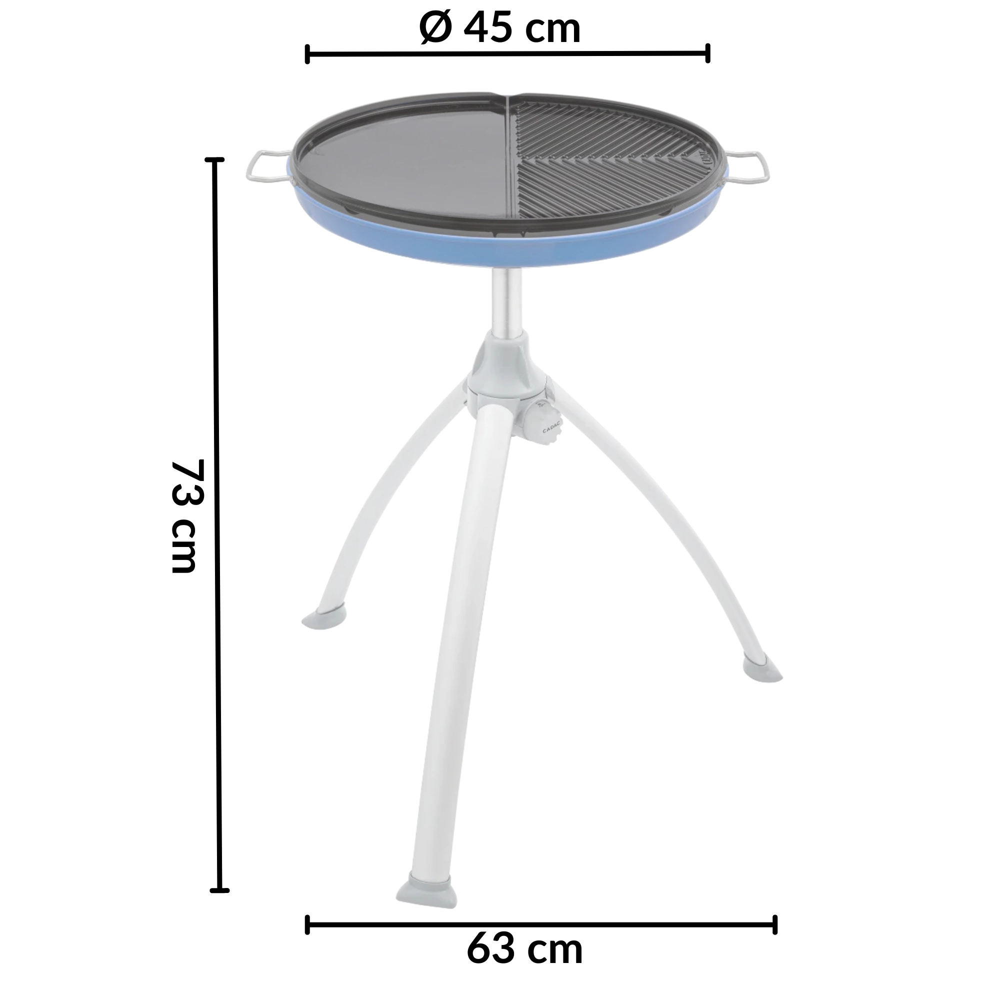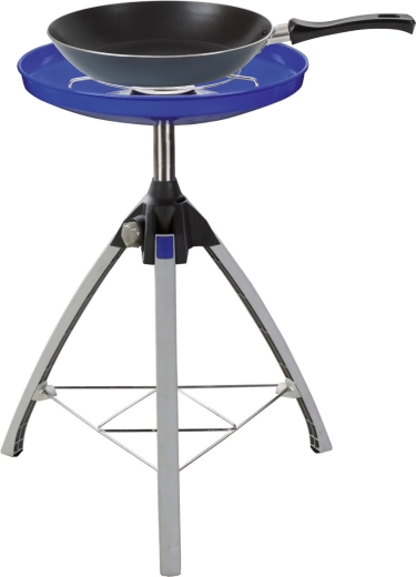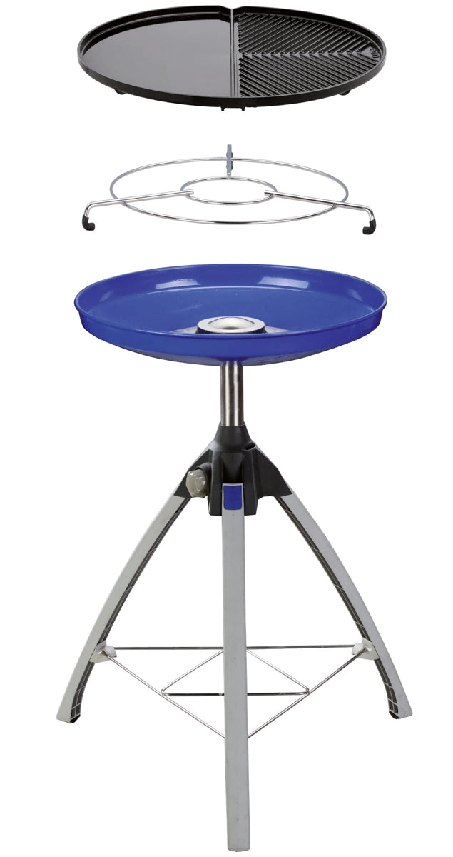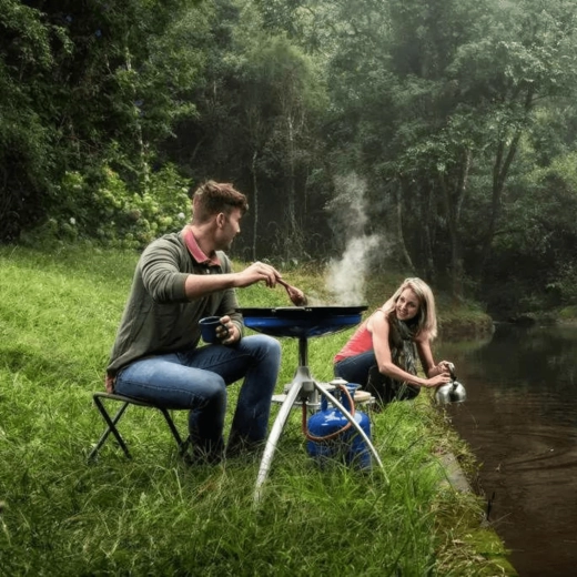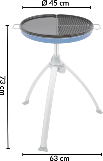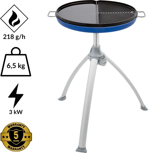 Uniwersalna kuchenka i grill w jednym – na kemping i do ogrodu. Dzięki dwustronnej nieprzywierającej płycie z połową gładką i połową żebrowaną przygotujesz jednocześnie mięso, ryby, warzywa i naleśniki. Lekki składany trójnóg, podstawka pod garnek oraz praktyczna torba w zestawie. Precyzyjna regulacja płomienia, duża powierzchnia 45 cm i zasilanie z butli gazowej.