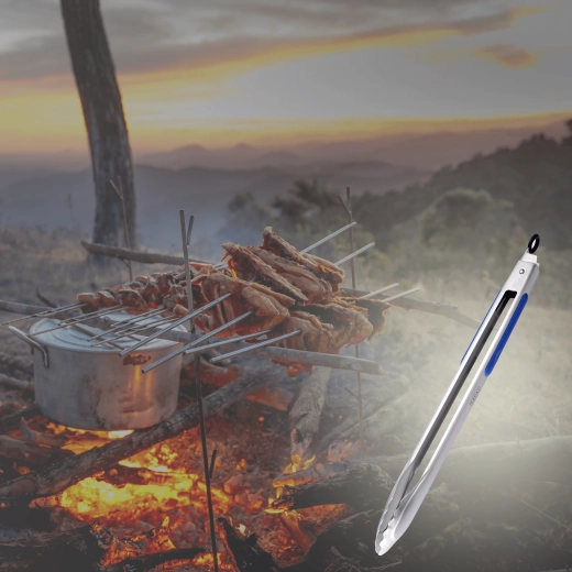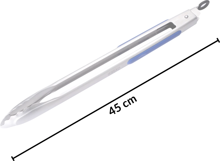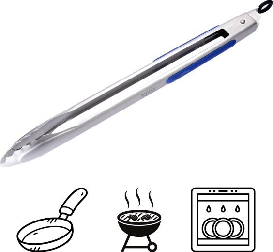 Praktyczne i wytrzymałe nierdzewne szczypce BBQ z antypoślizgową silikonową rączką dla pewnego chwytu. Dzięki długości 45 cm trzymają dłonie z dala od żaru, zamek do przechowywania oszczędza miejsce, a zmywarka ułatwia czyszczenie – idealne do grilla, patelni i na kemping.