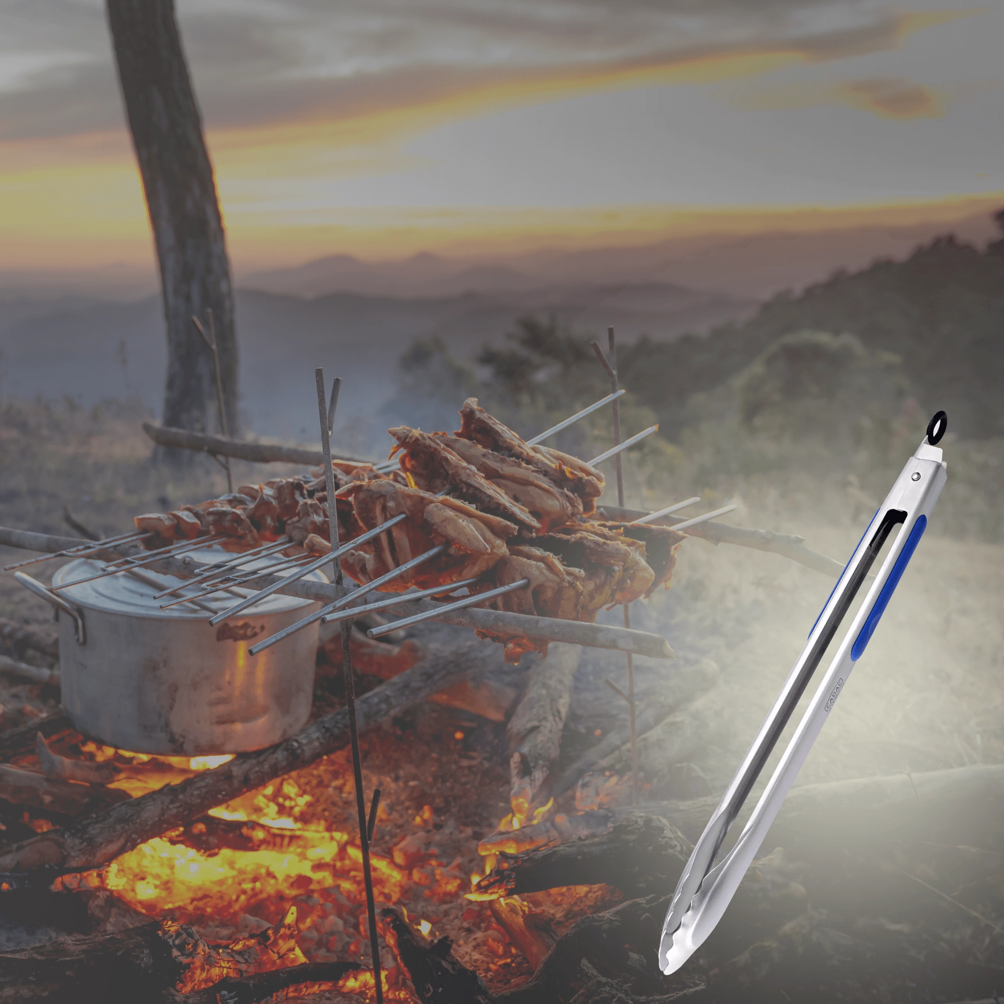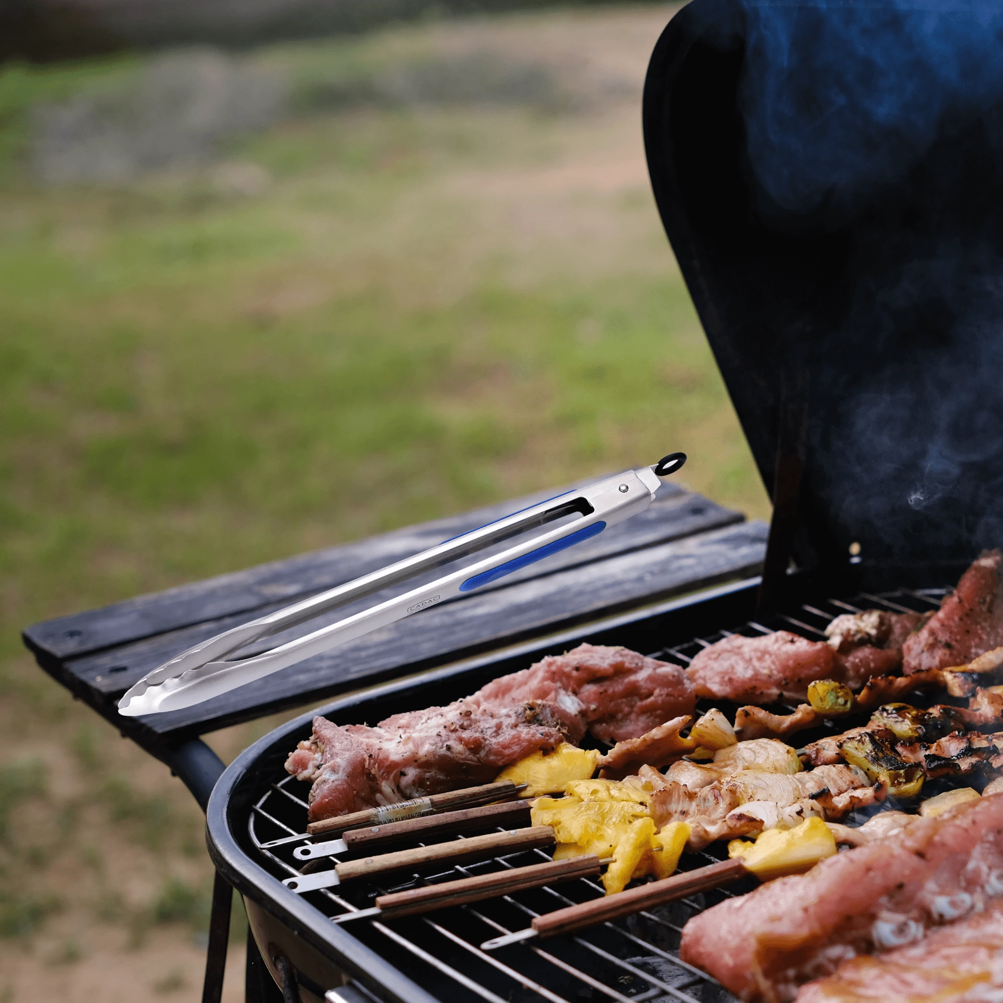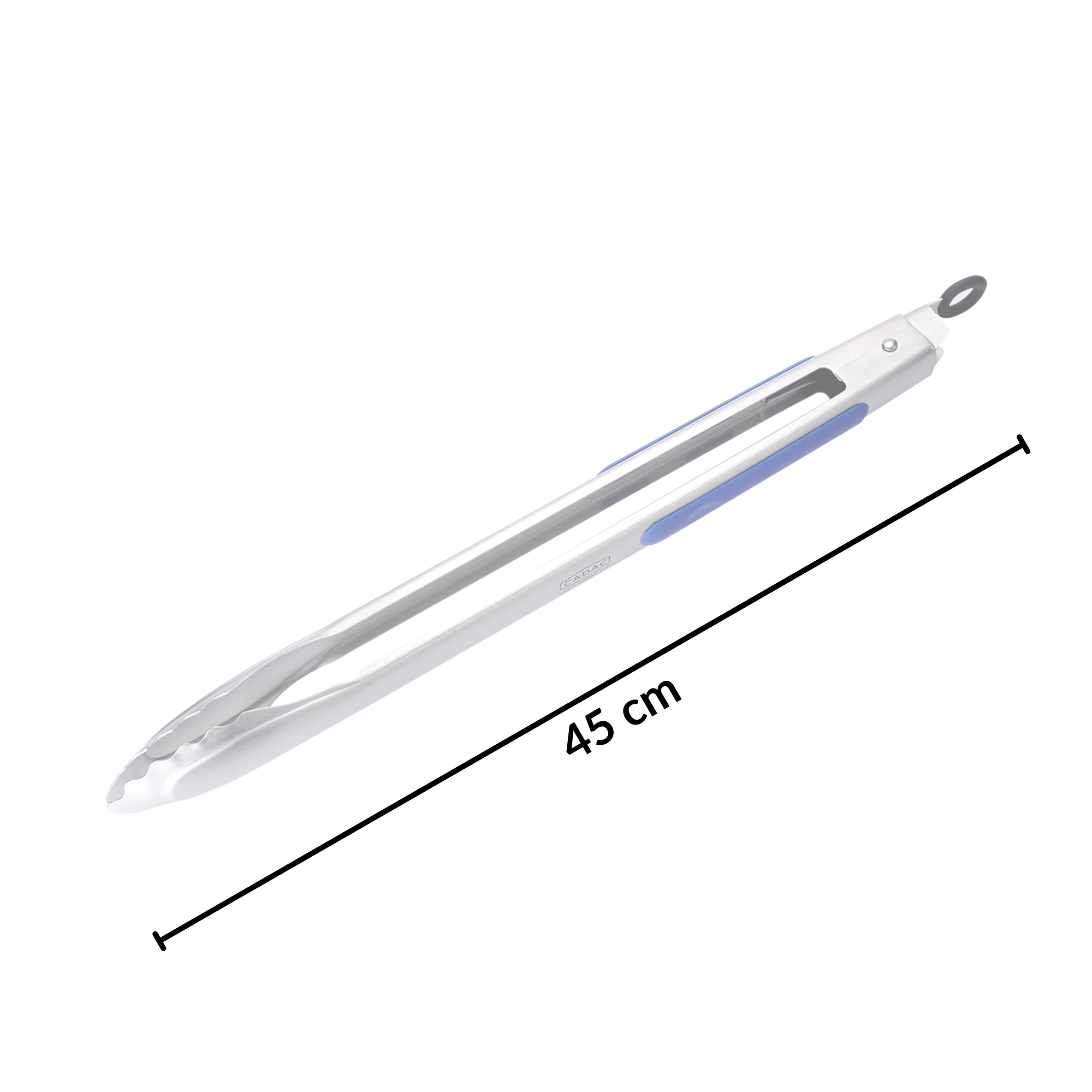 Długie, 45‑centymetrowe szczypce trzymają dłonie z dala od żaru, a silikonowe wstawki zapewniają antypoślizgowy i wygodny chwyt.
