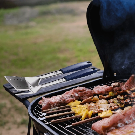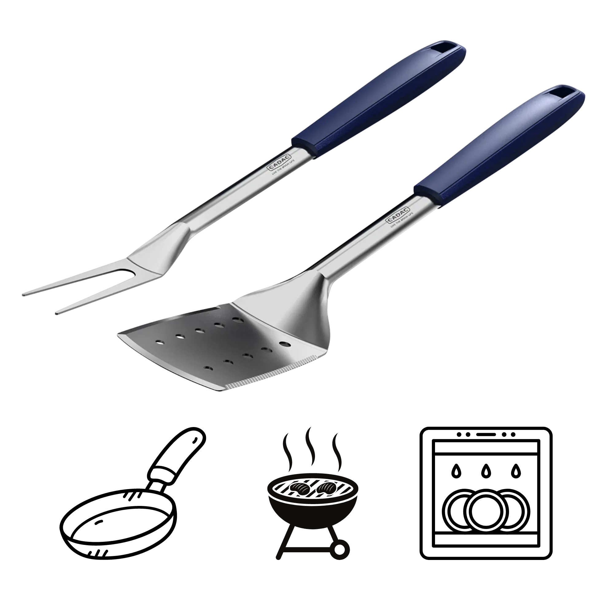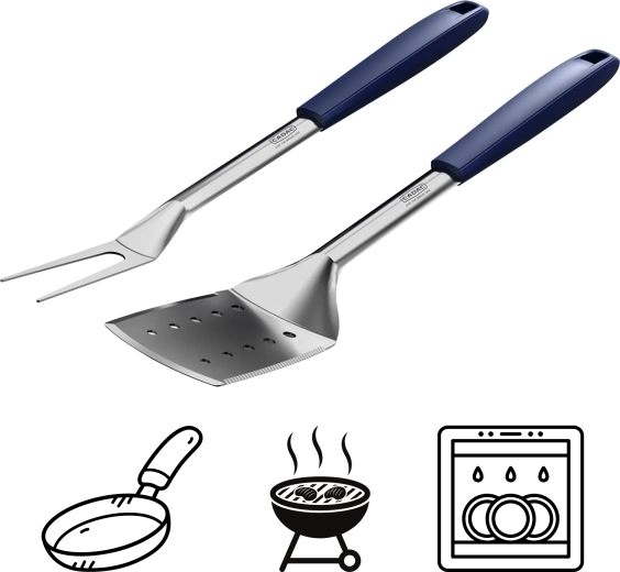 Łopatka z szerszą głowicą idealnie nadaje się do przewracania steków, ryb czy burgerów, a widelec ułatwia nakłuwanie i przenoszenie mięsa. Dzięki wytrzymałej konstrukcji i przemyślanej ergonomii ten zestaw to doskonały wybór do grillowania w ogrodzie i codziennego gotowania.