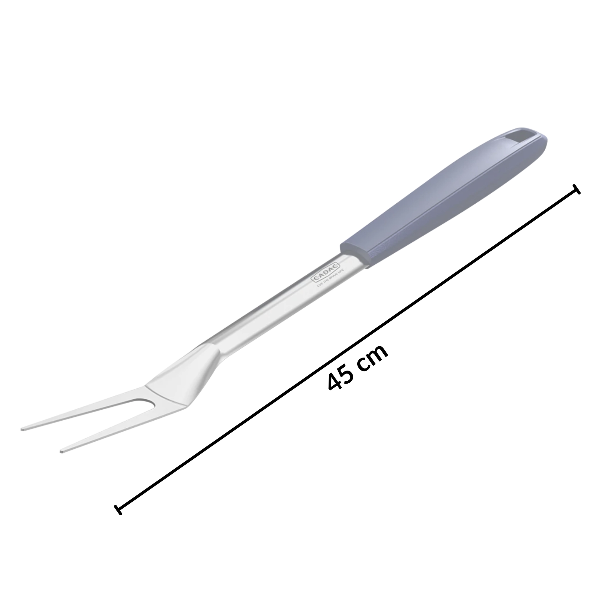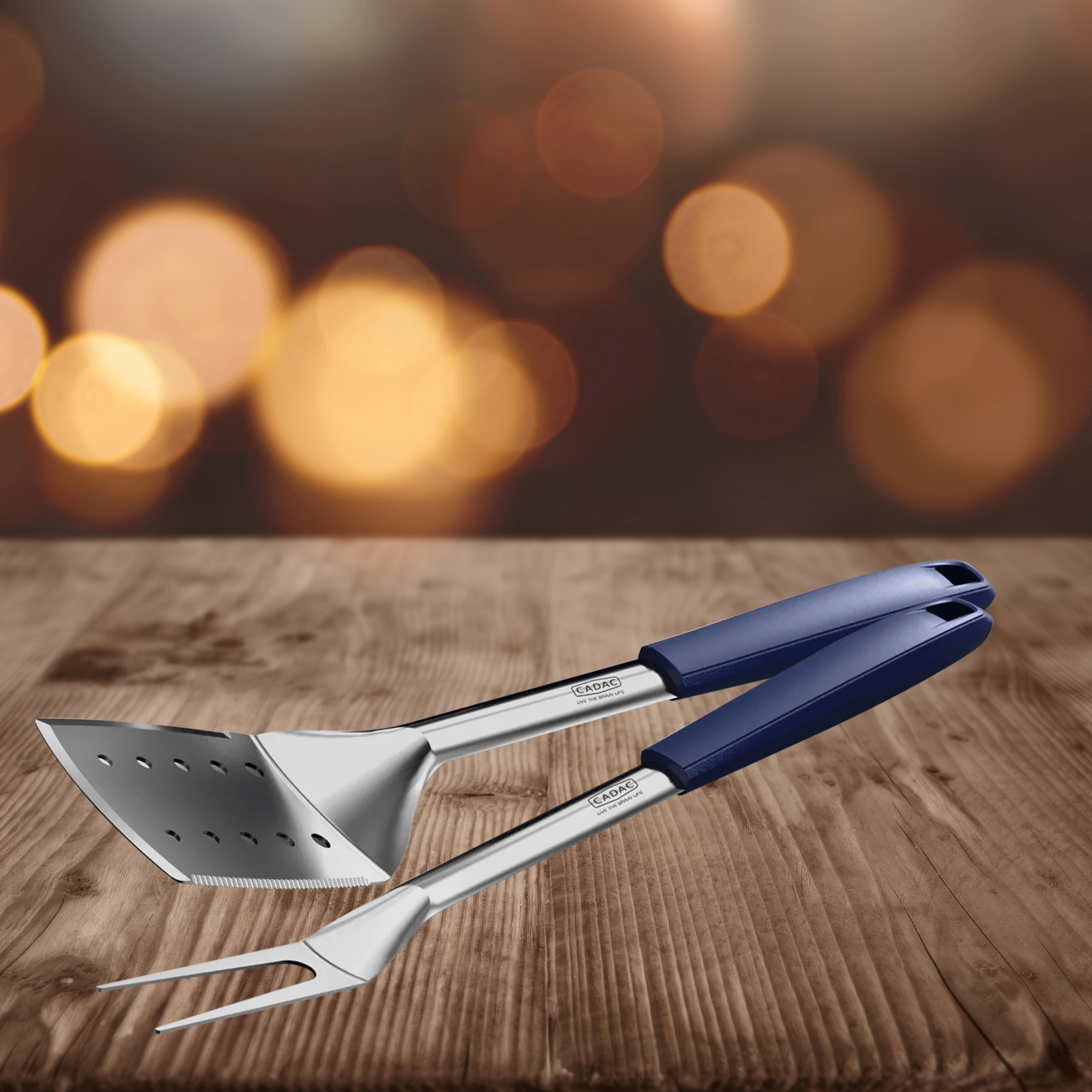 Zestaw CADAC łączy stal nierdzewną w częściach roboczych z odpornym na ciepło tworzywem sztucznym w rękojeściach. Długie narzędzia (45 cm) zapewniają pewność i odpowiedni dystans od żaru, a magnetyczne końcówki umożliwiają szybkie odkładanie na metalową powierzchnię (z wyjątkiem stali nierdzewnej). Zintegrowane podpórki utrzymują końcówki nad blatem roboczym i zapobiegają kontaktowi z zabrudzeniami.