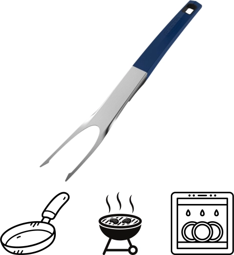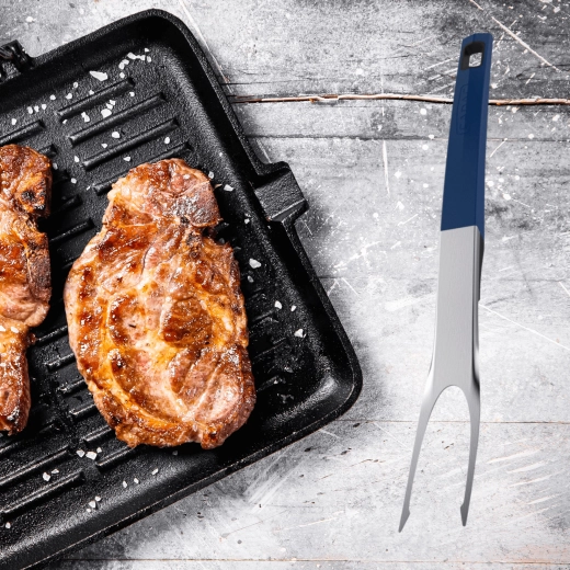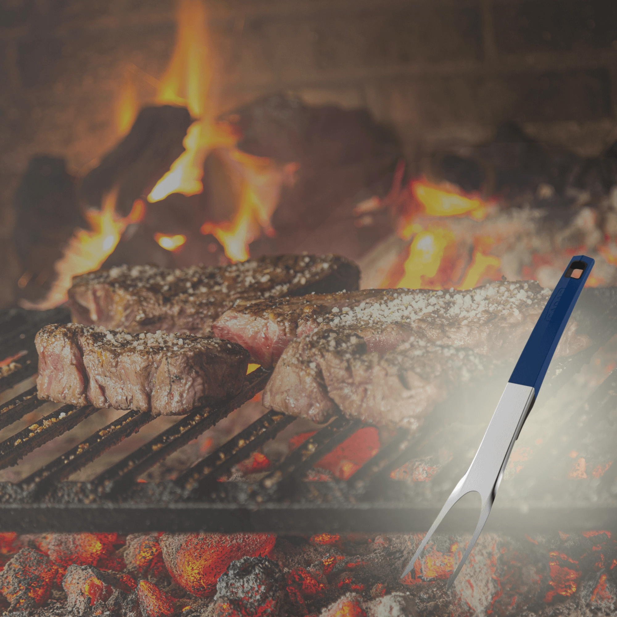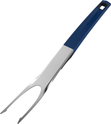 Praktyczny widelec do grillowania CADAC z matowej stali nierdzewnej z ergonomicznym silikonowym uchwytem w niebieskim kolorze zapewnia pewny chwyt i bezpieczne manewrowanie mięsem. Dzięki długiemu 42‑centymetrowemu trzonkowi dłonie pozostają dalej od żaru, duże oczko umożliwia wygodne zawieszenie, a materiał jest odpowiedni do zmywarki.