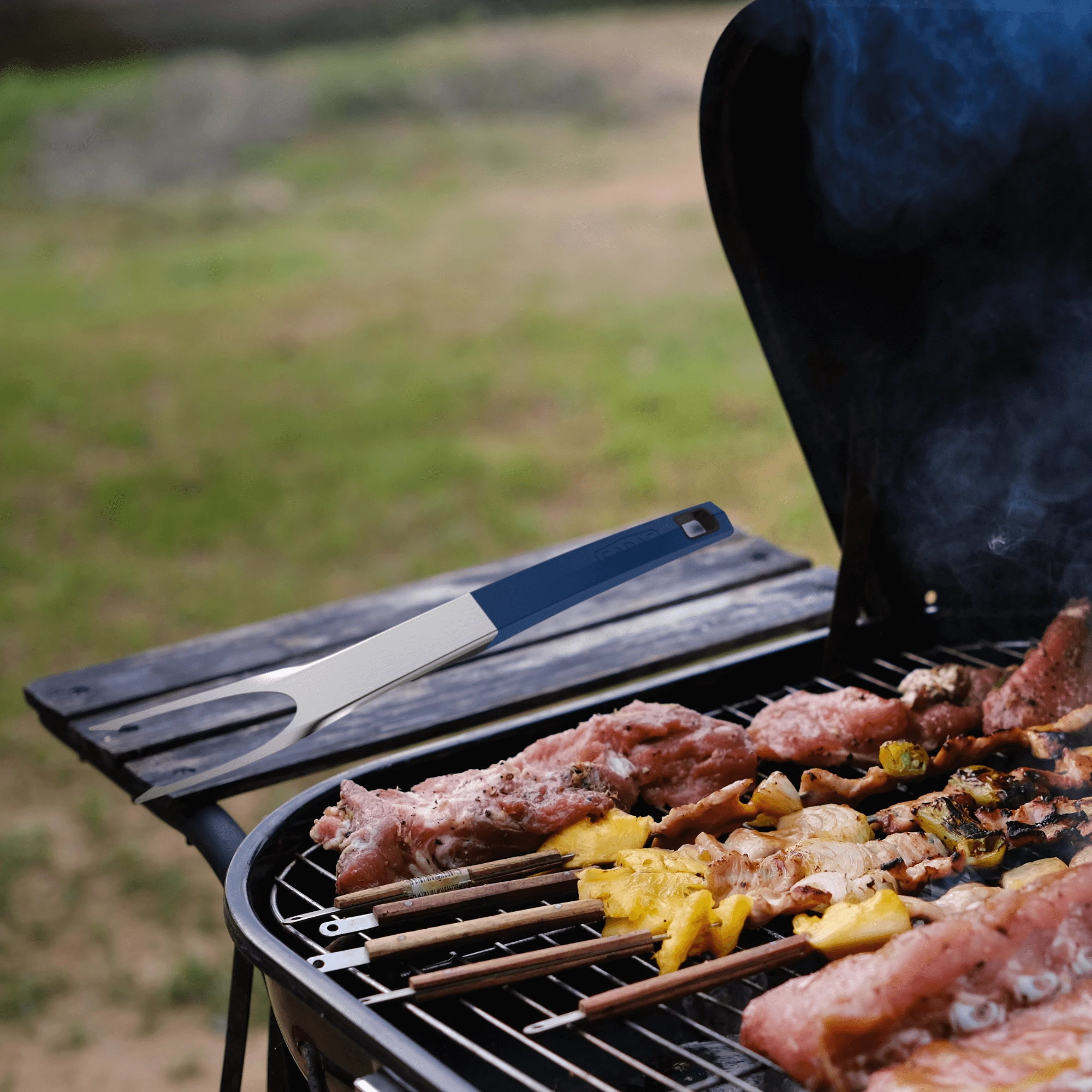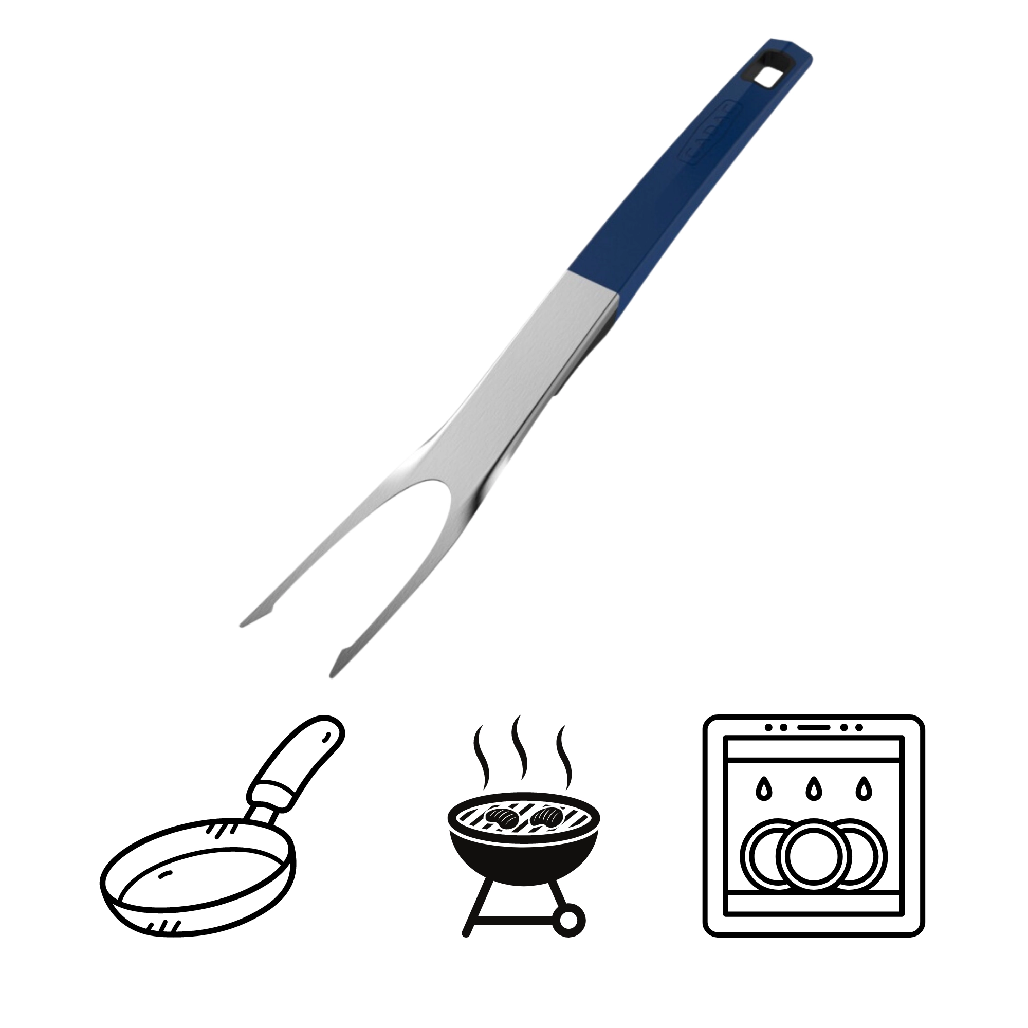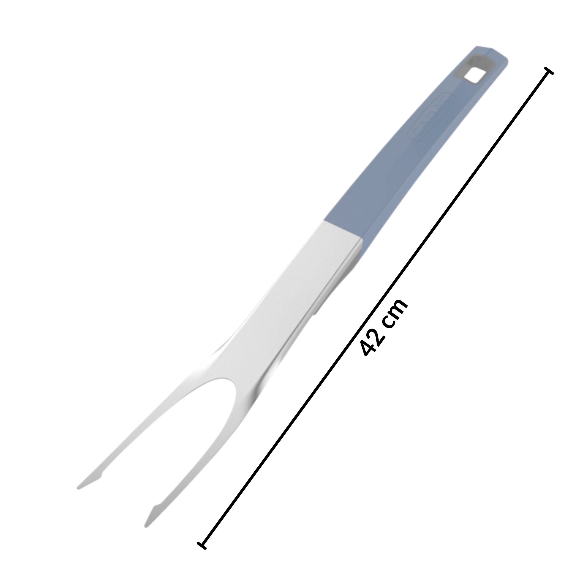 Odkryj niezawodnego pomocnika do grilla i kuchni. Dwuzębny widelec do grillowania CADAC wykonano z wytrzymałej, matowo szczotkowanej stali nierdzewnej, odpornej na wysokie temperatury i częste użytkowanie. Antypoślizgowy silikonowy uchwyt w niebieskim kolorze zapewnia wygodne i bezpieczne trzymanie podczas obracania, nabijania i serwowania.