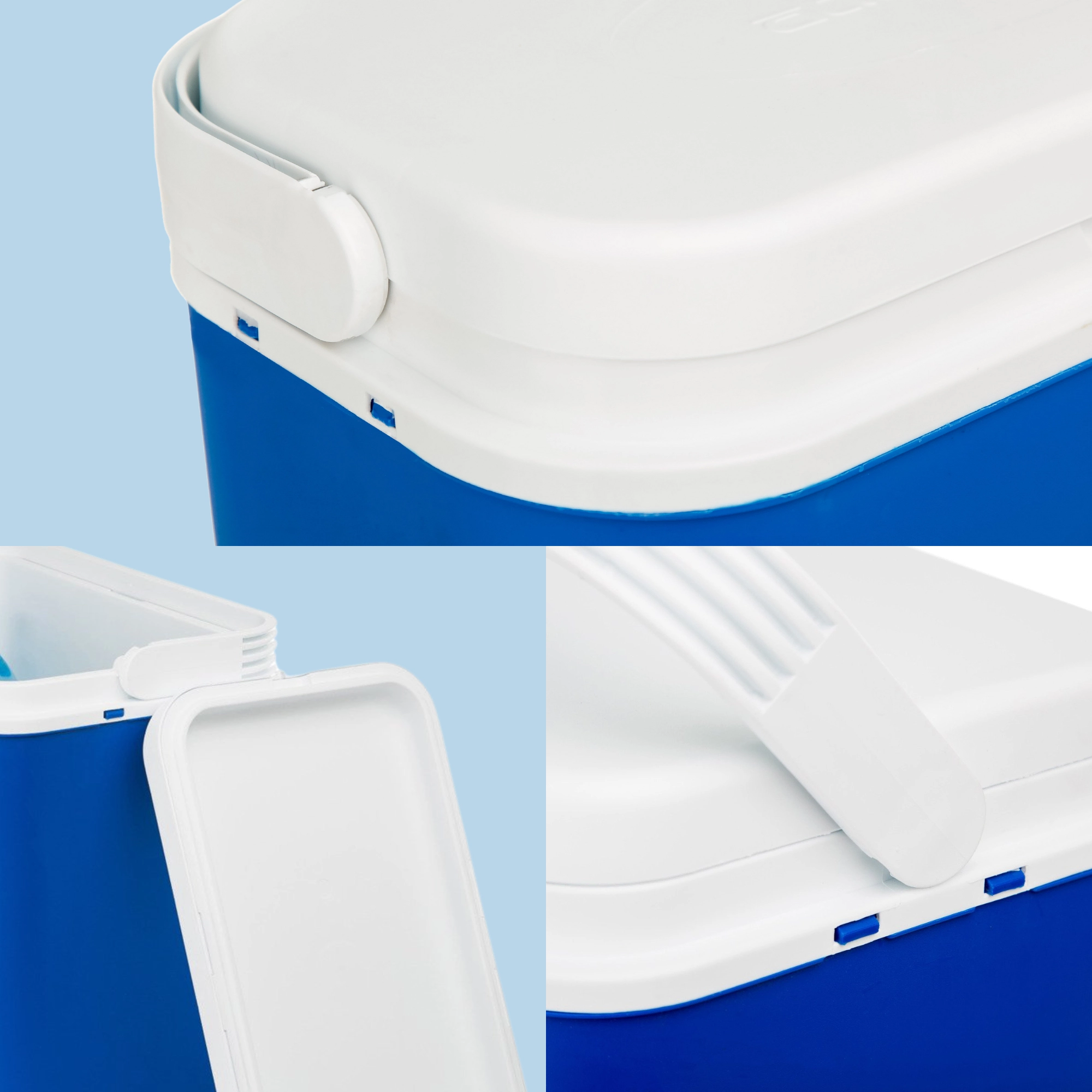 Składane rączki bezpiecznie blokują pokrywę podczas transportu. Wytrzymały polipropylen jest odporny na uderzenia i łatwy w czyszczeniu.