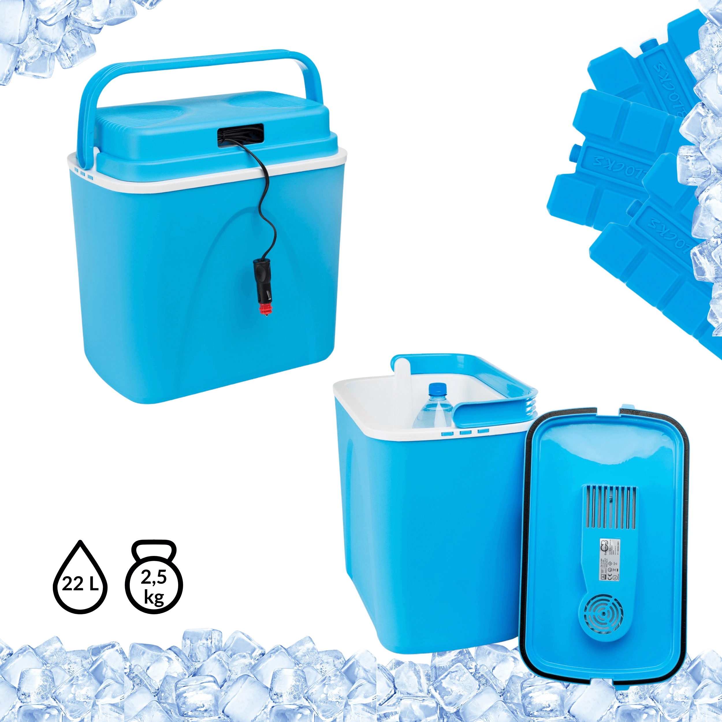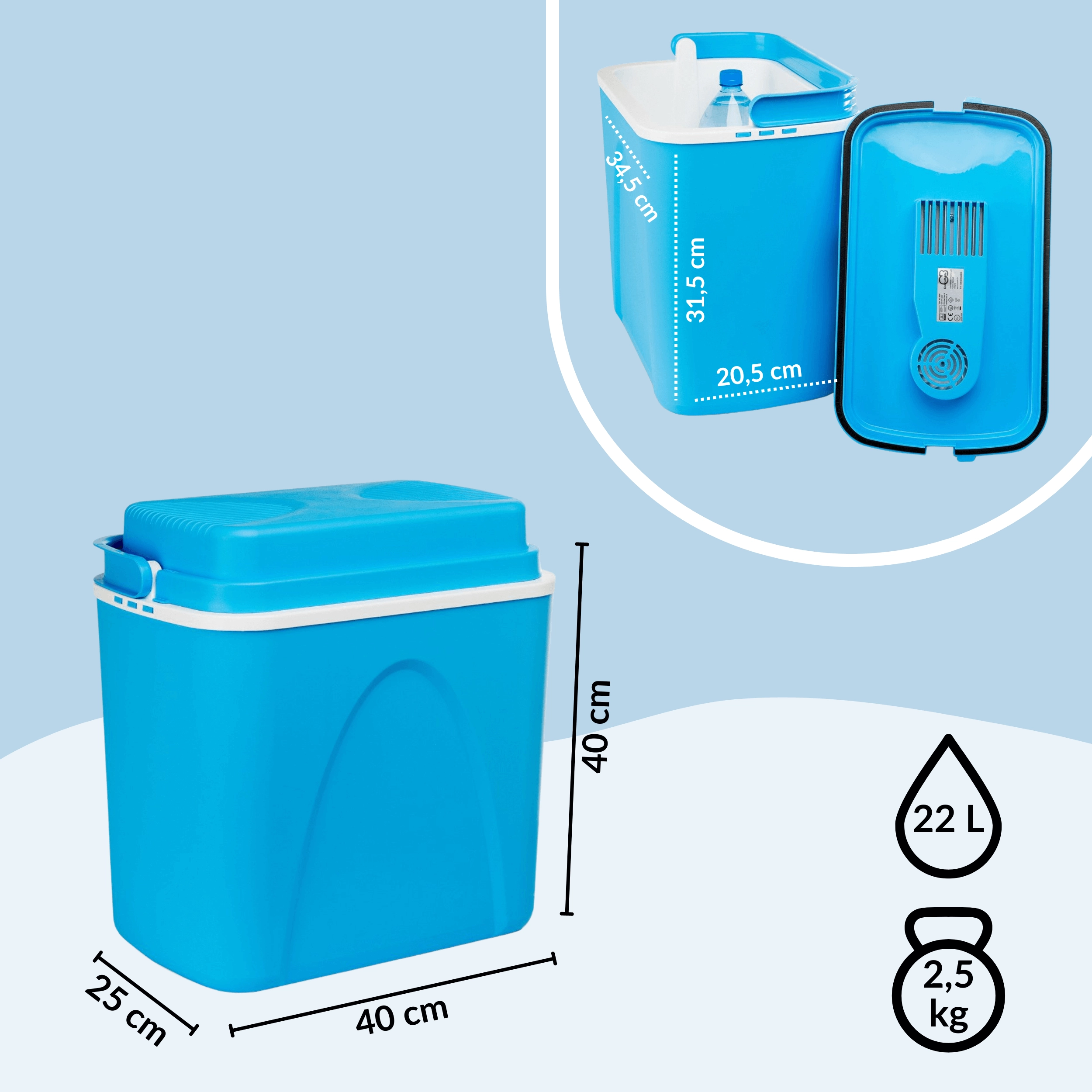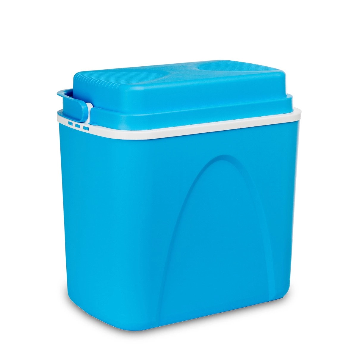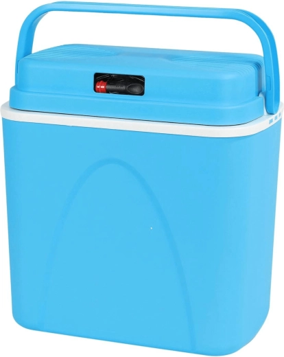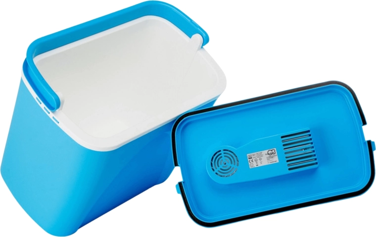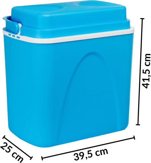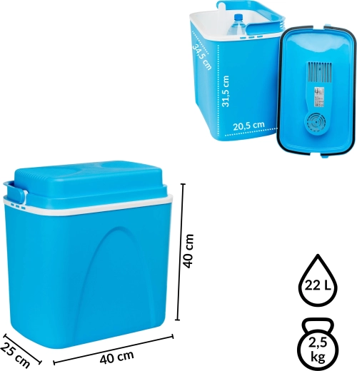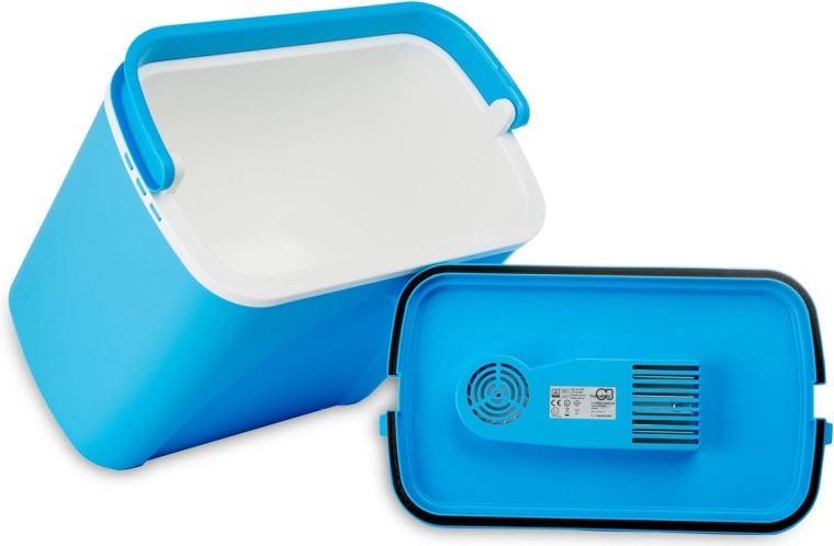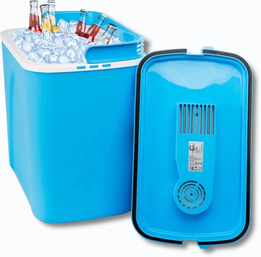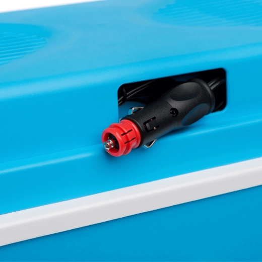 Przemyślane wymiary pozwalają ustawić butelki 1,5 l pionowo i wygodnie rozmieścić przekąski oraz napoje. Lekka, a jednocześnie solidna skorupa z polipropylenu jest trwała i łatwa w czyszczeniu. Stylowy niebieski design świetnie sprawdzi się na plaży, na kempingu i w bagażniku auta.
