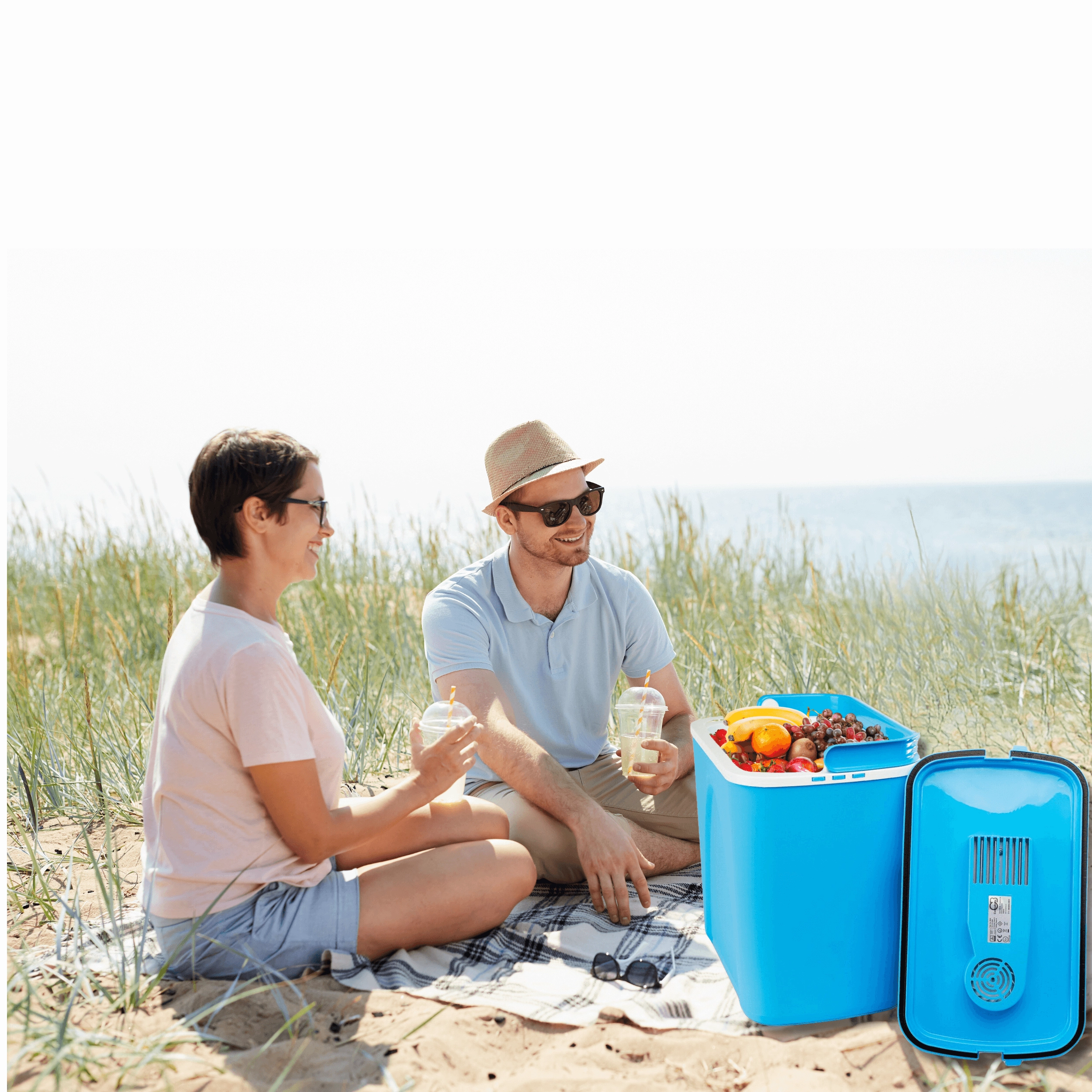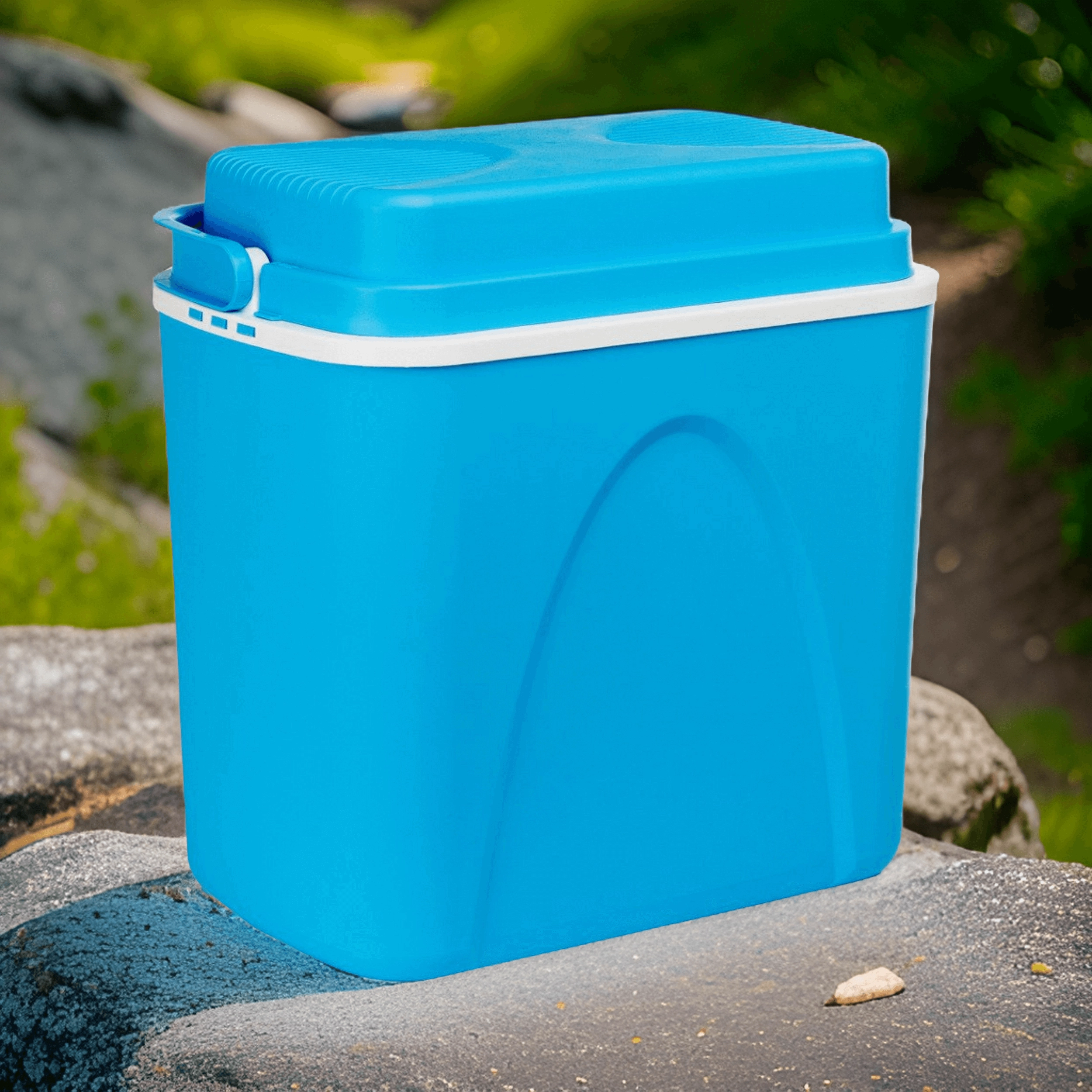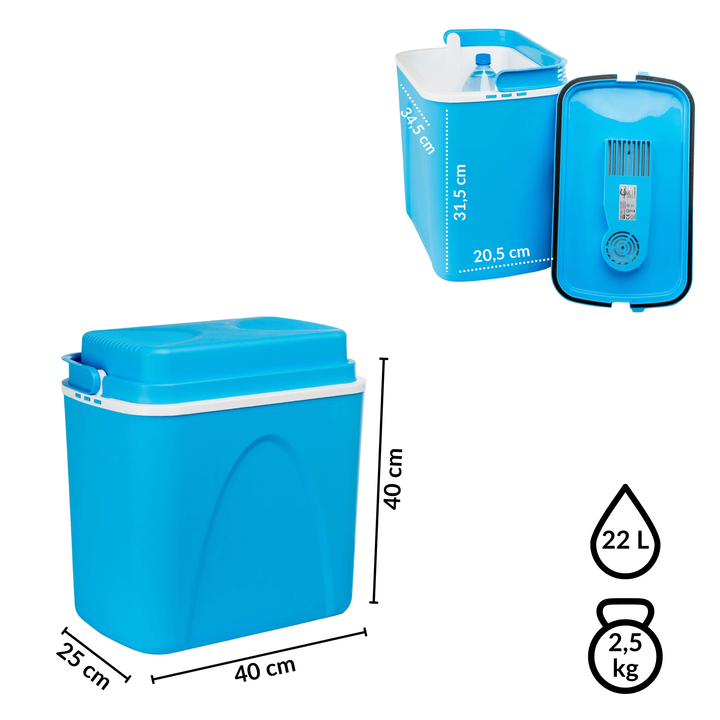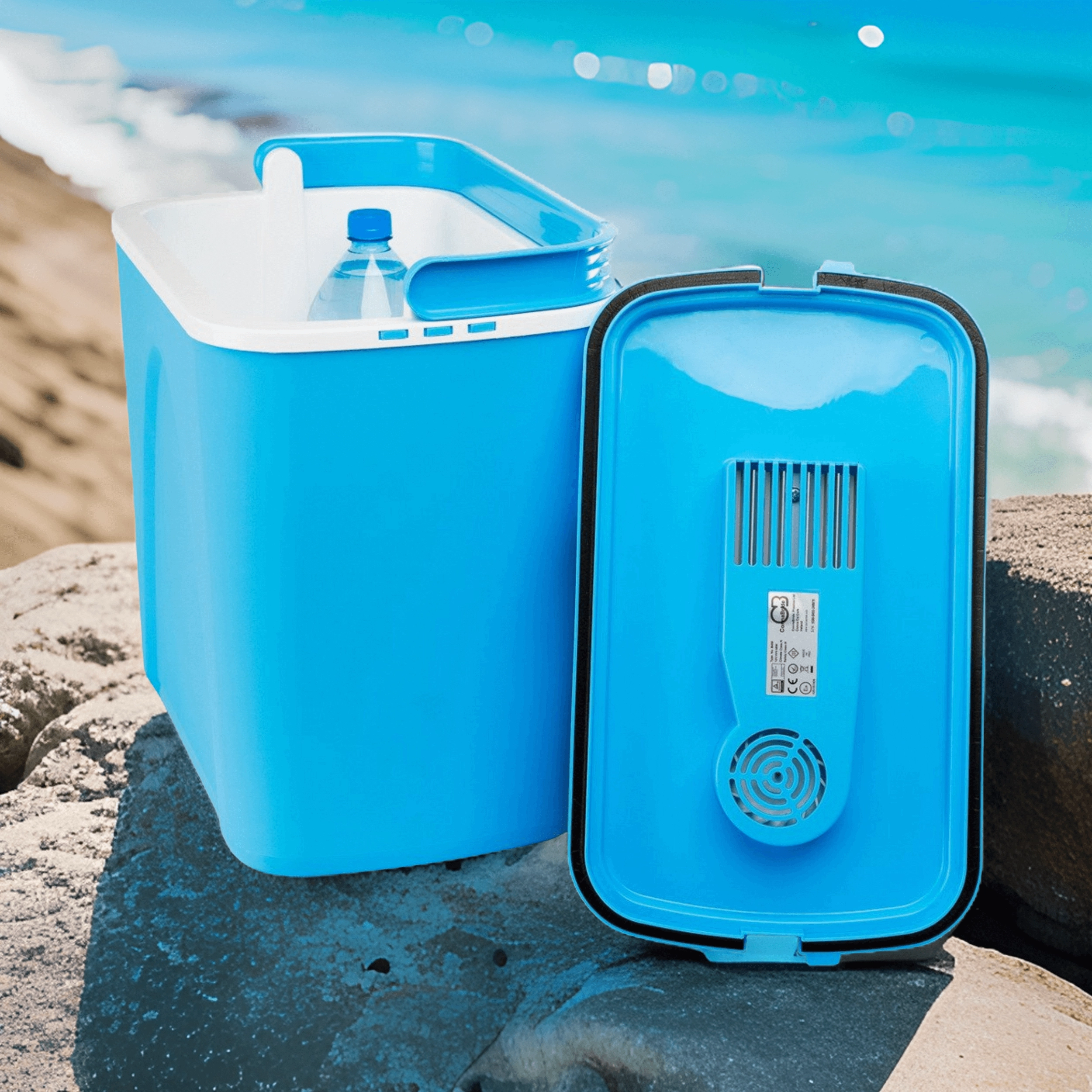 Przemyślane wymiary pozwalają ustawić butelki 1,5 l pionowo i wygodnie rozmieścić przekąski oraz napoje. Lekka, a jednocześnie solidna skorupa z polipropylenu jest trwała i łatwa w czyszczeniu. Stylowy niebieski design świetnie sprawdzi się na plaży, na kempingu i w bagażniku auta.