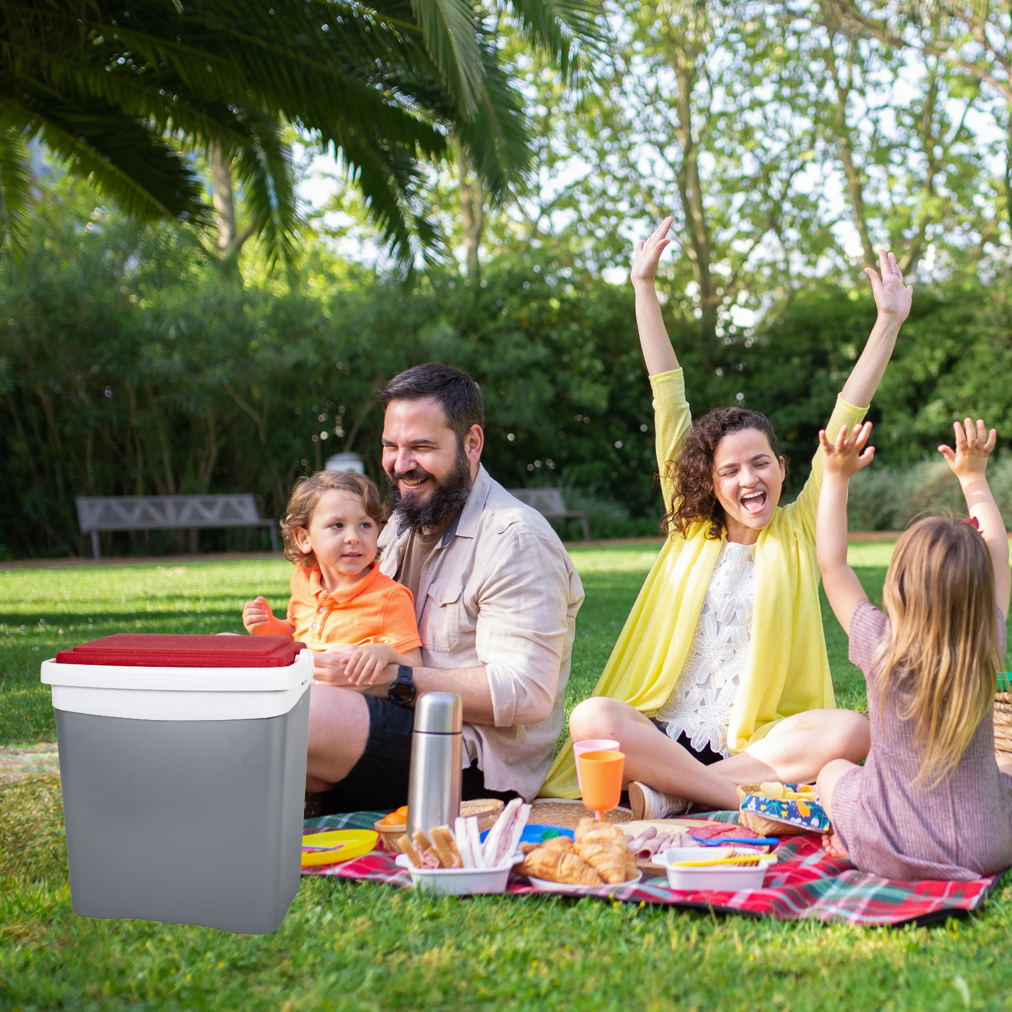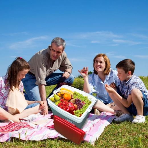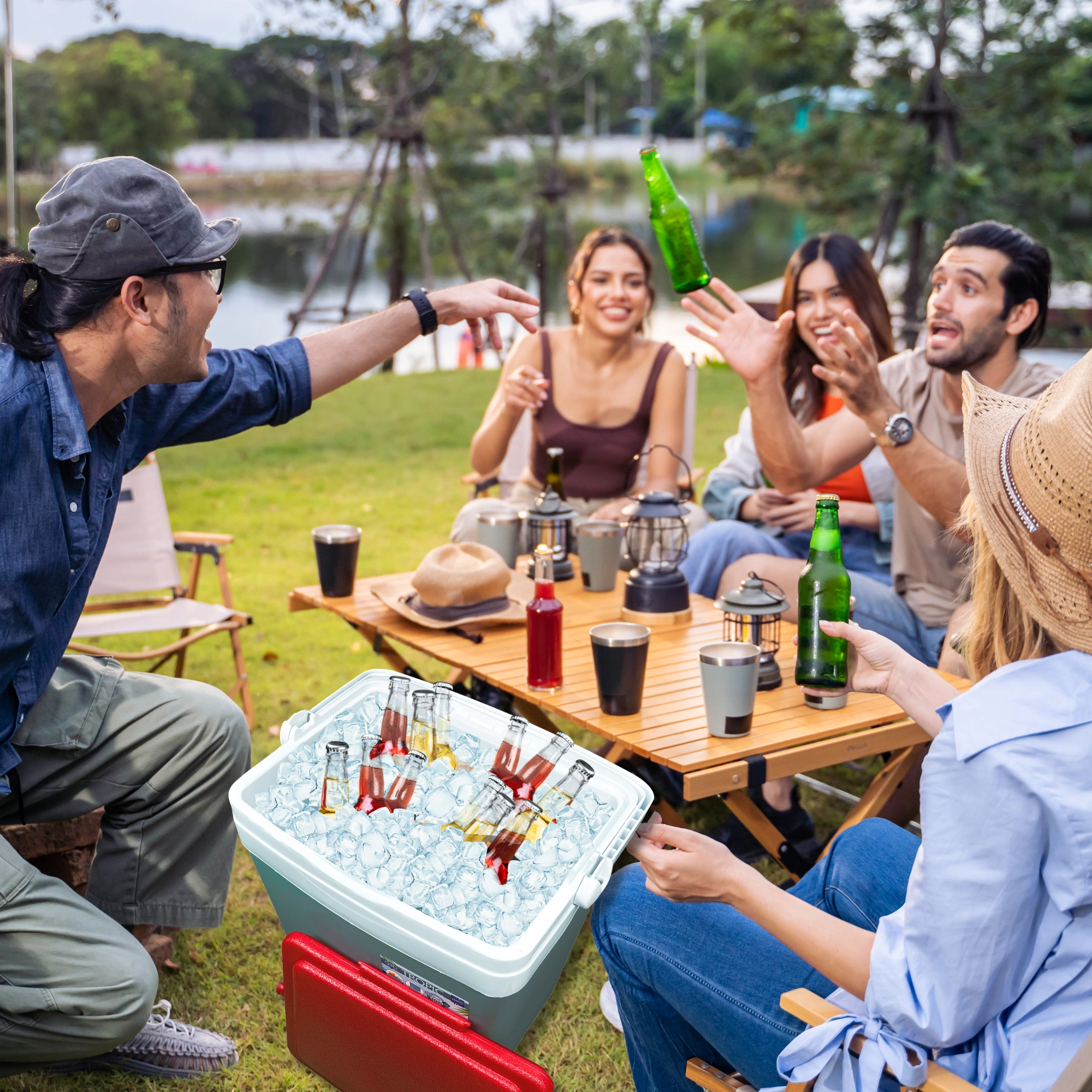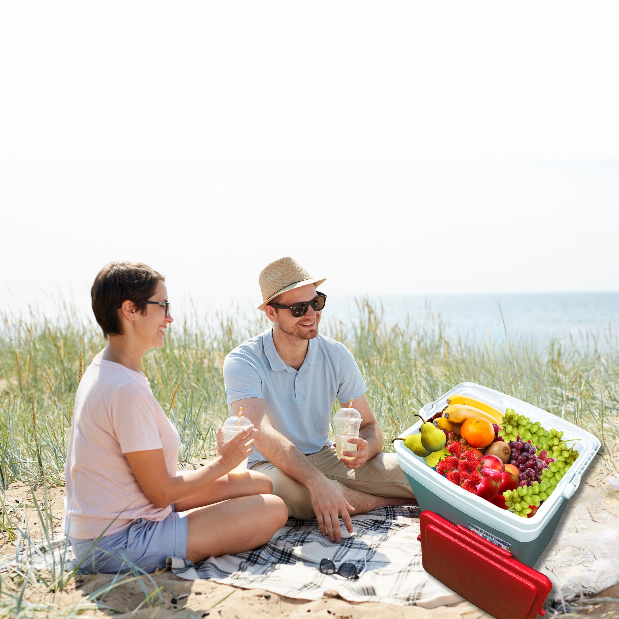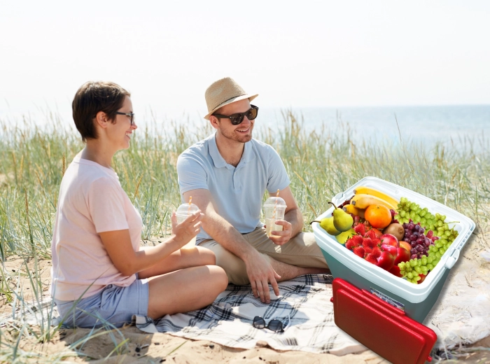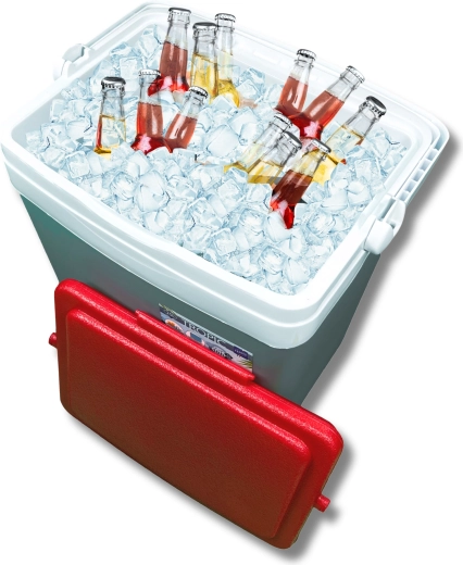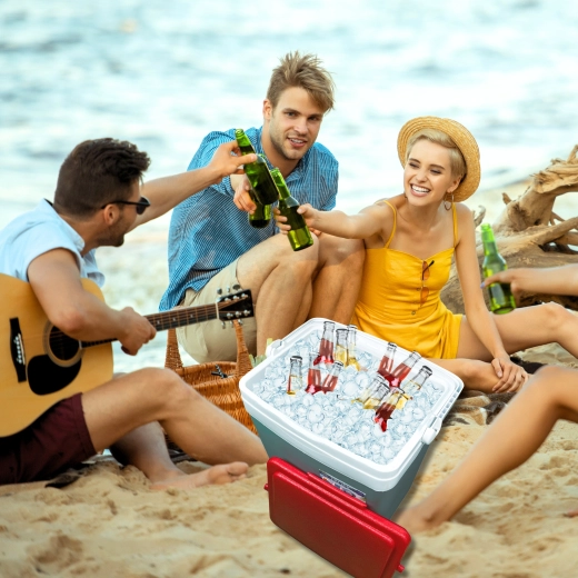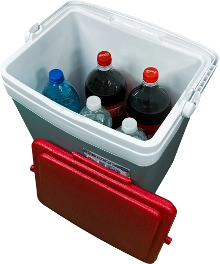 Profilowana pokrywa oferuje cztery stabilne miejsca na kubki lub puszki – idealna na relaks na plaży i piknik w parku.