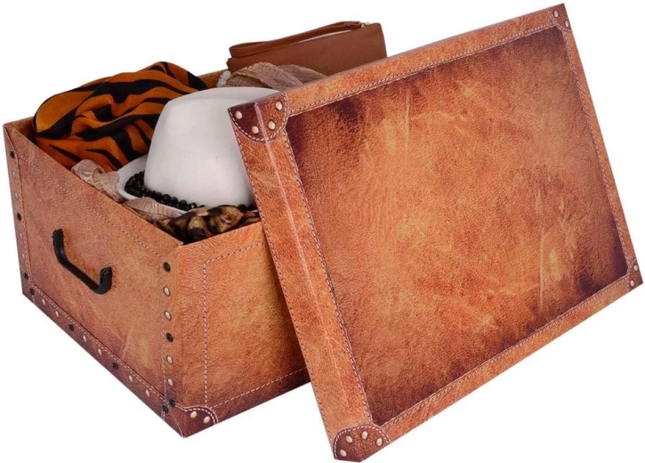 Elegancki kartonowy box MAXI w wzorze skóry w jasnobrązowym odcieniu łączy luksusowy design i praktyczne przechowywanie. Wykonany z kartonu w 100% z recyklingu, o solidnej konstrukcji, łatwym składaniu bez narzędzi oraz certyfikatach FSC i PEFC. Idealny do domu, biura i garderoby.