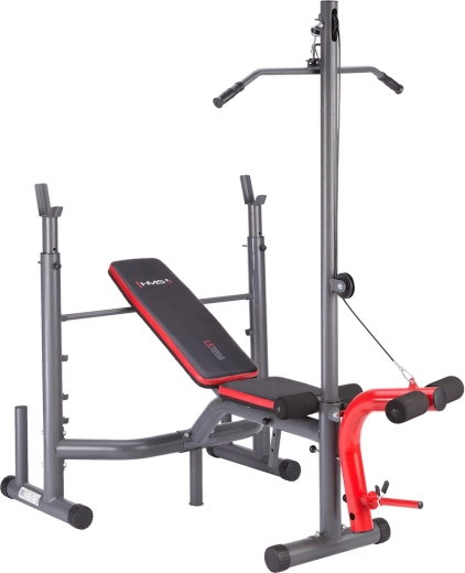 Ławka, stojak na sztangę, górny wyciąg, modlitewnik i przystawka na nogi – wszystko do kompleksowego treningu górnych i dolnych partii ciała bez kompromisów.