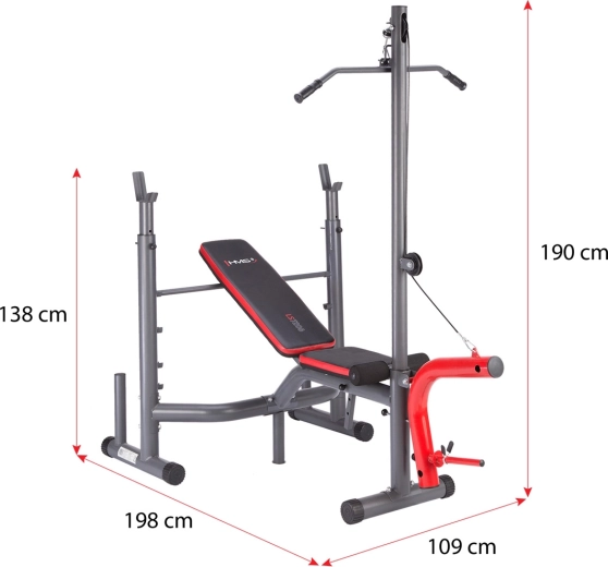 HMS LS7206 to uniwersalna ławka treningowa do efektywnego treningu siłowego w domu. Dzięki regulowanemu oparciu i siedzisku, stojakom z regulacją wysokości, modlitewnikowi oraz zintegrowanemu górnemu wyciągowi łatwo przećwiczysz klatkę piersiową, plecy, barki, bicepsy, tricepsy, brzuch i nogi. Solidna konstrukcja ze stalowych profili 7,5 cm oraz miękkie tapicerowanie z ekoskóry zapewniają stabilność i komfort nawet przy większym obciążeniu.