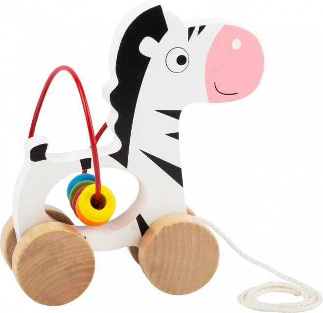 Zebra oferuje zabawną formę na kółkach z możliwością poruszania się dzięki sznurkowi. Dzięki torowi koralikowemu dzieci mogą rozwijać umiejętności motoryczne.
