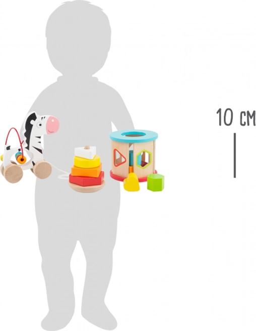 Ten zestaw zabawowy został zaprojektowany dla najmłodszych dzieci i oferuje różnorodne aktywności, które wspierają rozwój motoryczny. Każda zabawka w zestawie jest starannie wykonana z drewna i ma atrakcyjny kolorowy design, który zachęca dzieci do zabawy:
