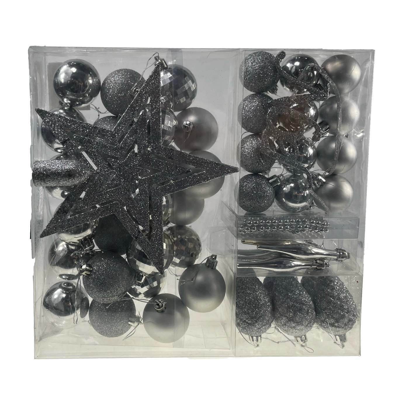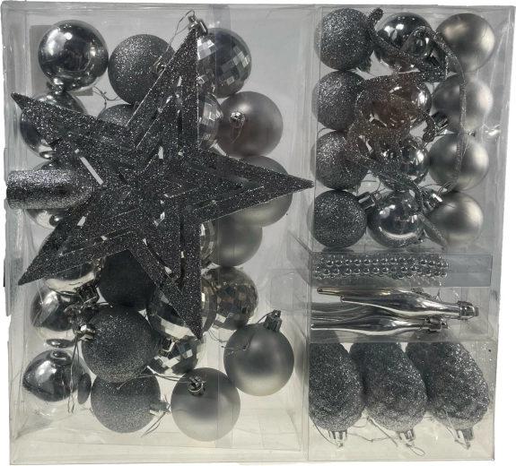 Podaruj swojej choince perfekcyjnie dopasowaną dekorację. Ten rozbudowany zestaw w ponadczasowym srebrnym kolorze łączy blask i elegancję, pasując zarówno do nowoczesnych, jak i tradycyjnych wnętrz. Dzięki lekkiej i wytrzymałej plastikowej konstrukcji ozdoby są bezpieczne, łatwe do zawieszenia i mniej podatne na uszkodzenia podczas użytkowania.