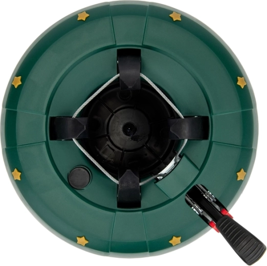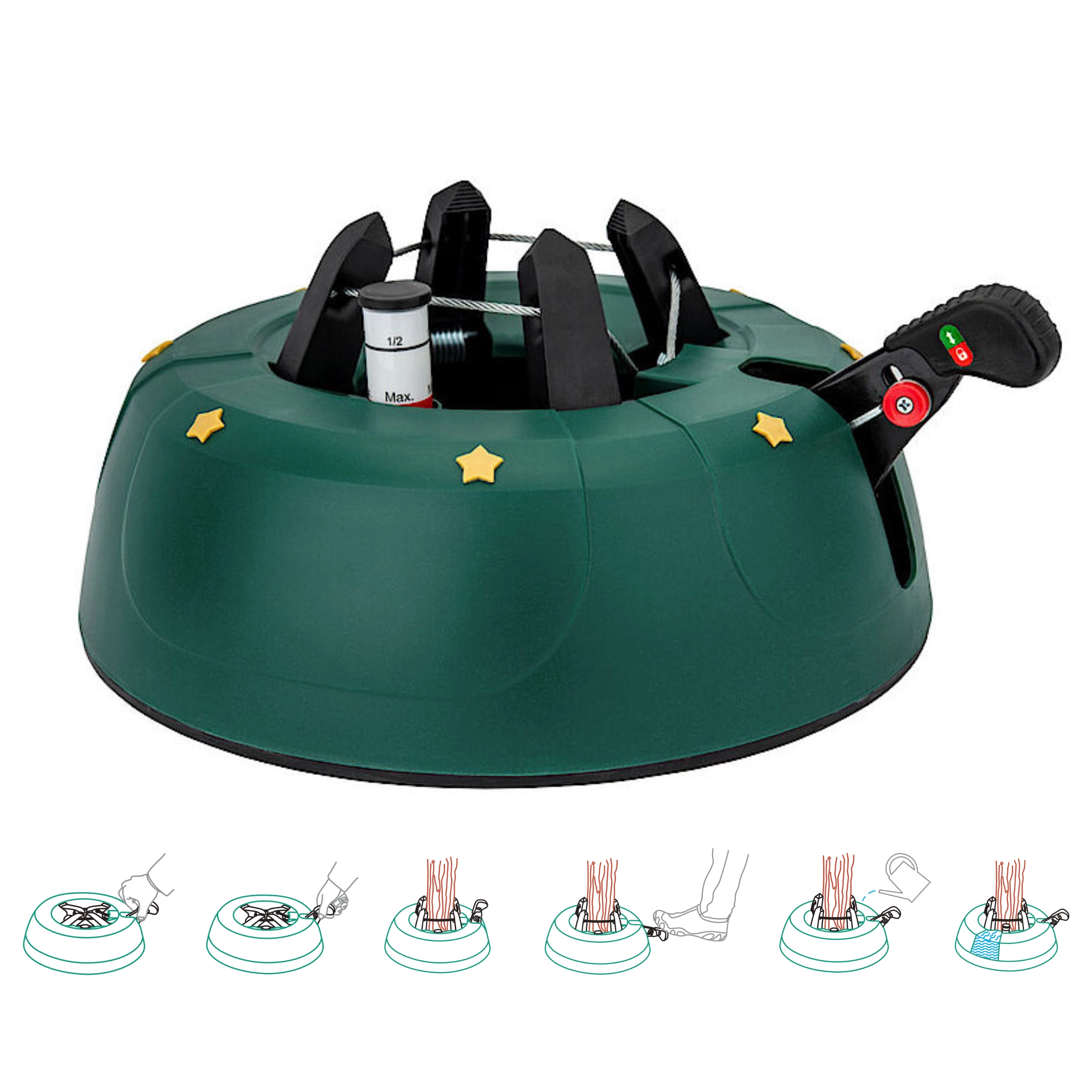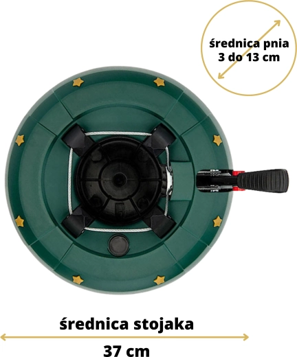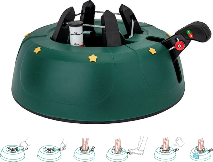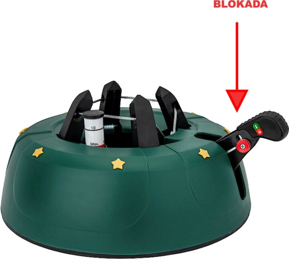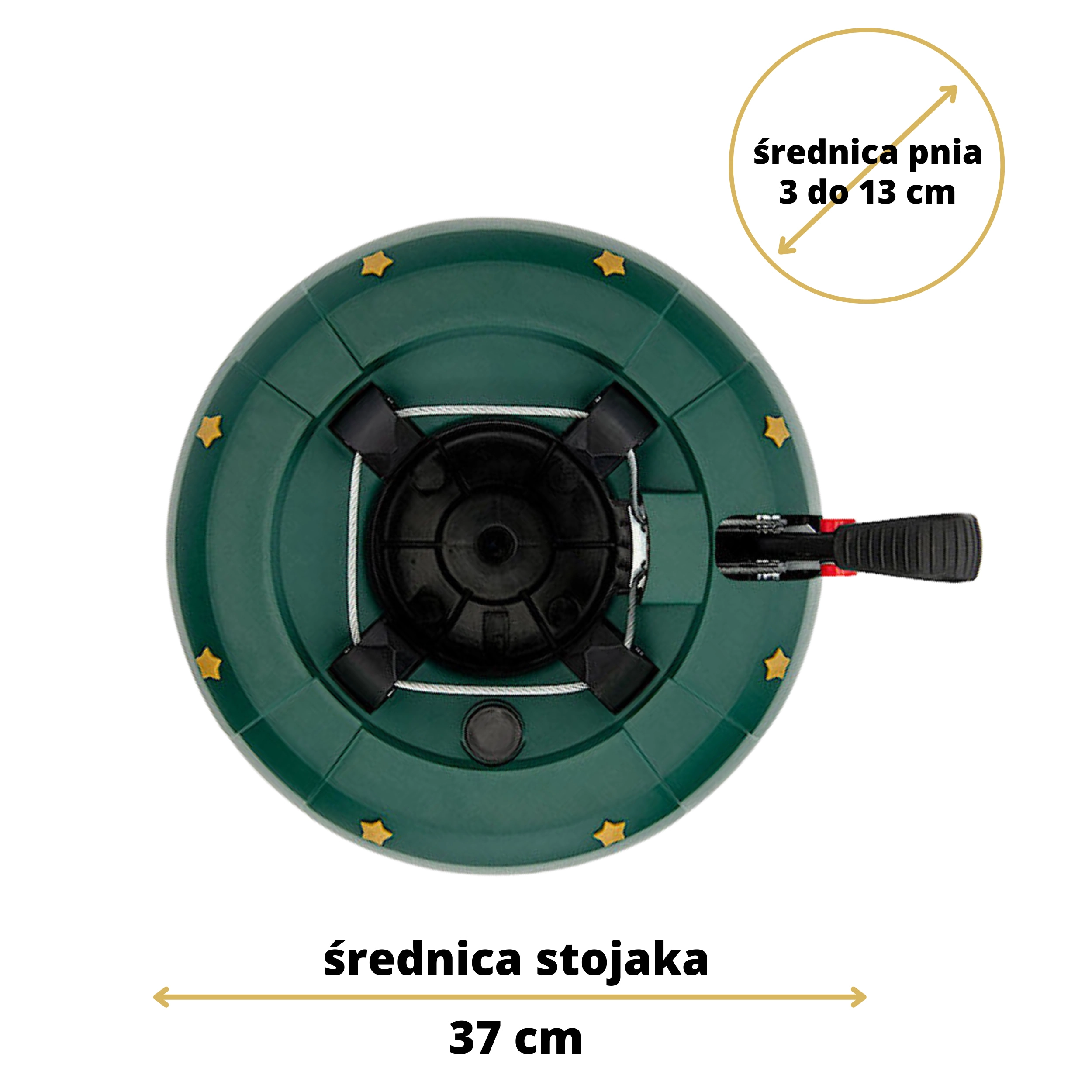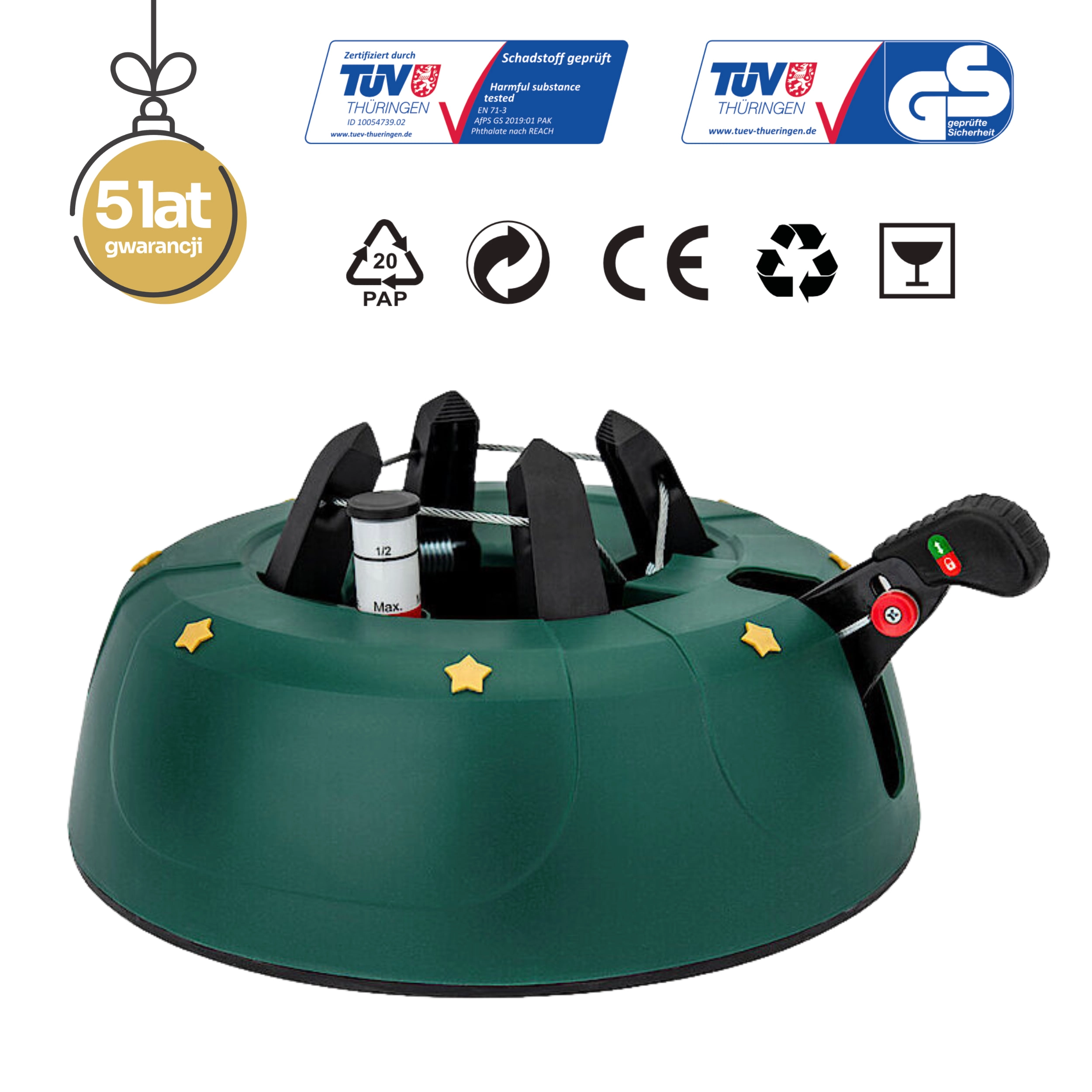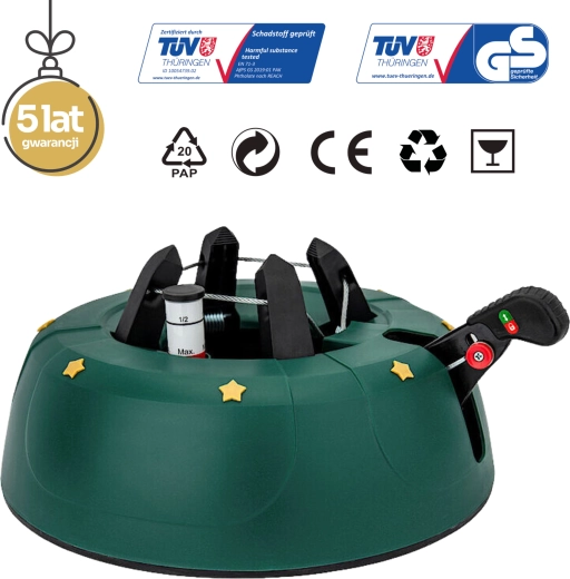 Obsługa jest intuicyjna: ustawiasz drzewko na centralnym stalowym kolcu, kilkukrotnie naciskasz dźwignię, aby dociągnąć szczęki, a następnie aktywujesz bezpieczną blokadę dźwigni przeciw przypadkowemu poluzowaniu. Dekor w postaci złotych gwiazdek i kolor świąteczna zieleń pasują do domów, hoteli, sklepów i przestrzeni publicznych.