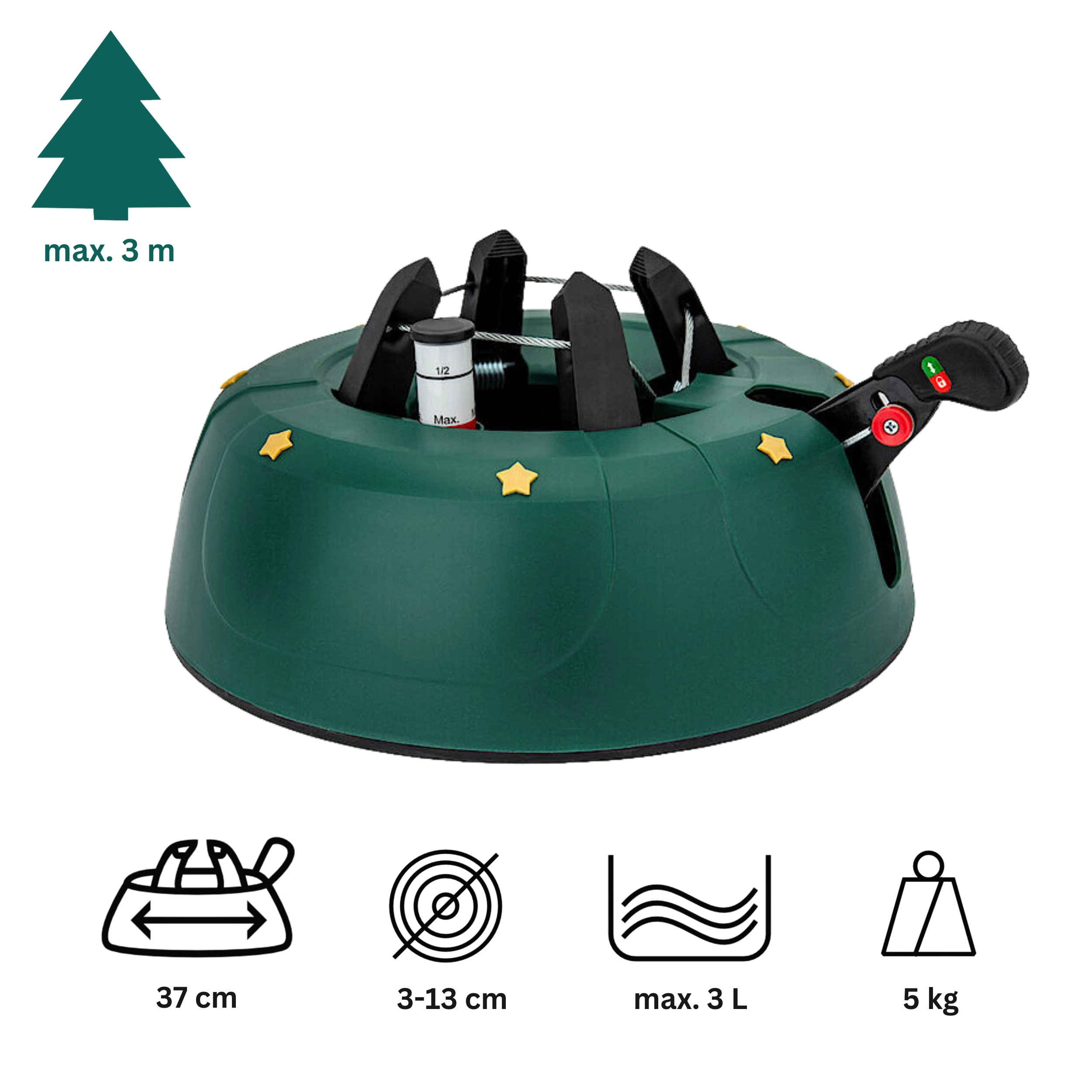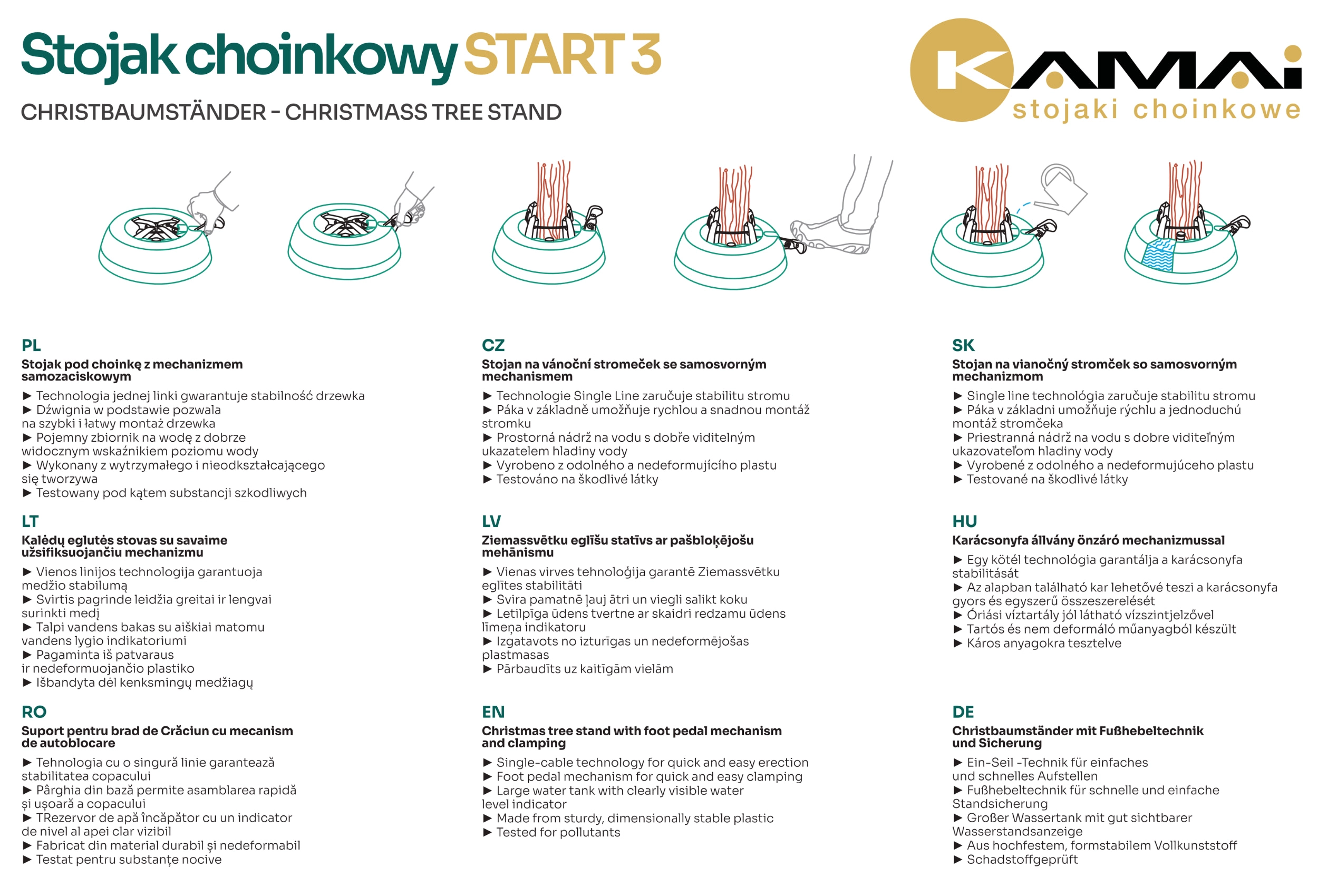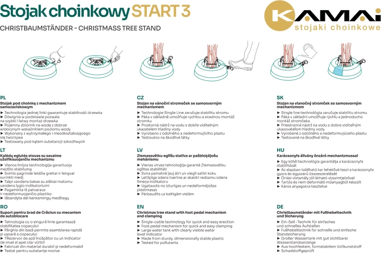 Solidny stojak na żywą choinkę Kamai Start 3 zapewnia maksymalną stabilność i łatwy montaż bez wysiłku. Dzięki automatycznym szczękom z stalową linką, zbiornikowi na wodę 3 l z wskaźnikiem poziomu oraz bezpiecznemu zatrzaskowi dźwigni utrzymuje drzewko prosto i świeżo przez całe święta.