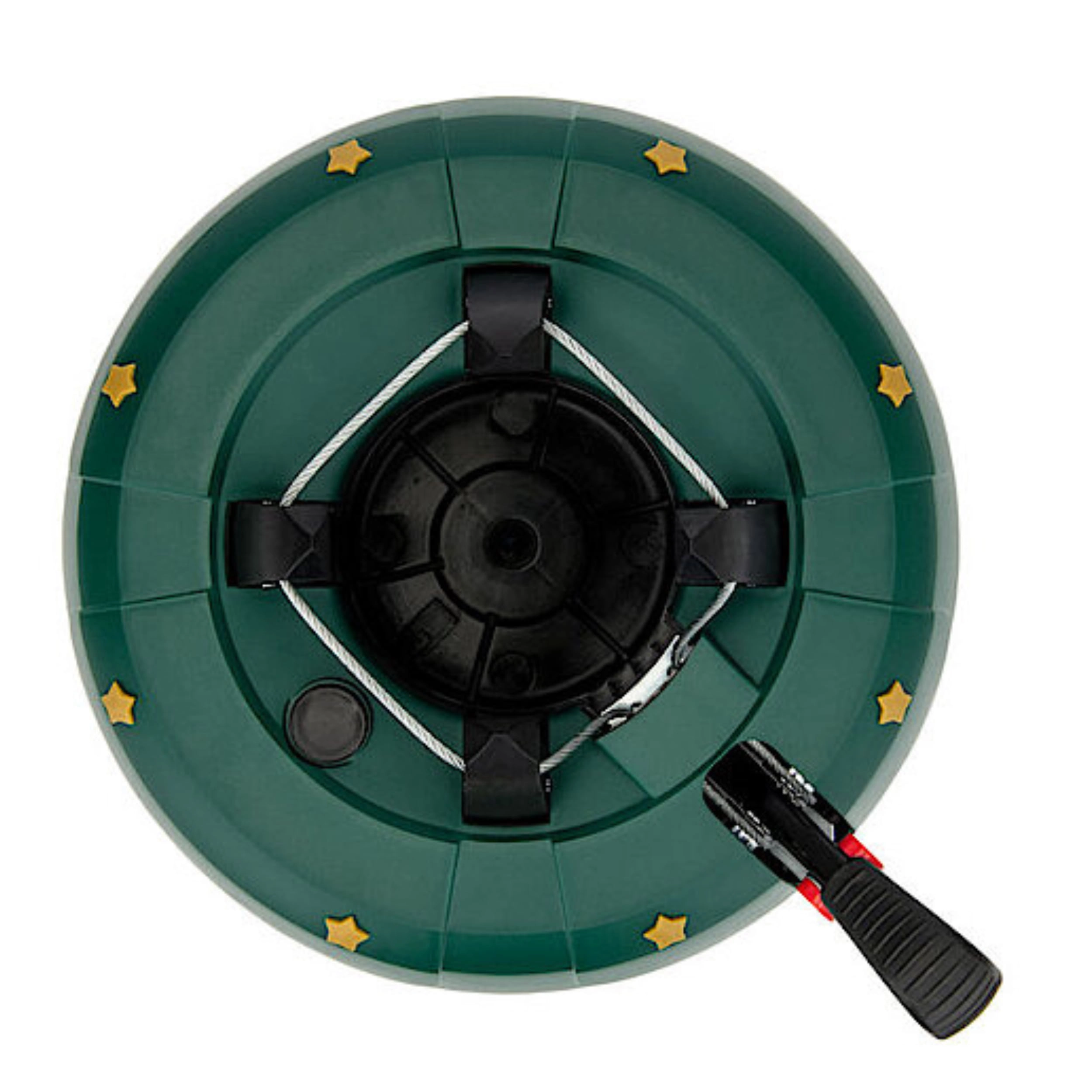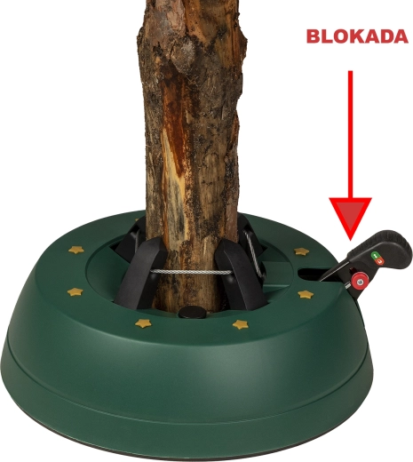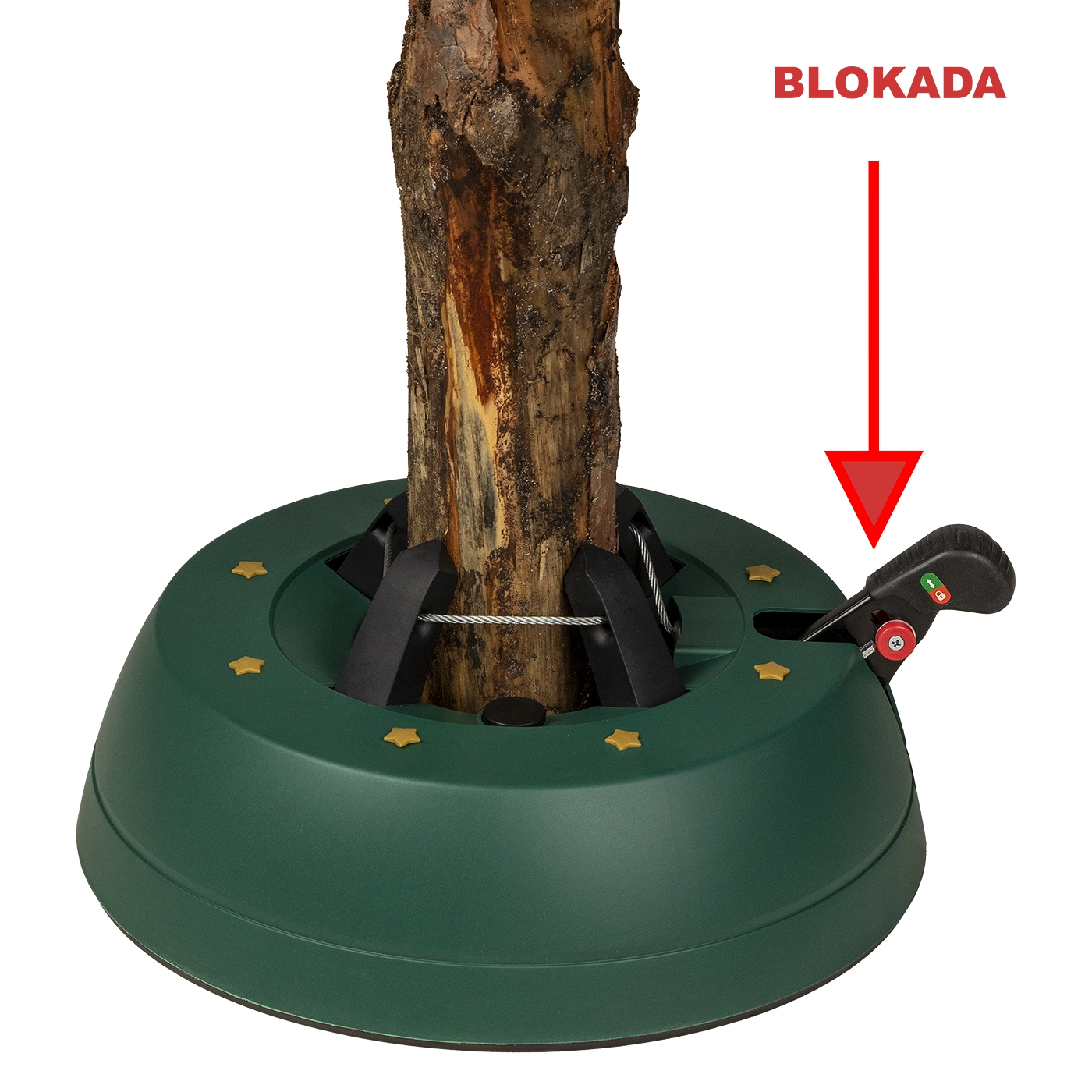 Cztery solidne szczęki ze stalową linką po naciśnięciu dźwigni automatycznie zaciskają się wokół pnia (3–11 cm) i utrzymują drzewko idealnie w pozycji pionowej.