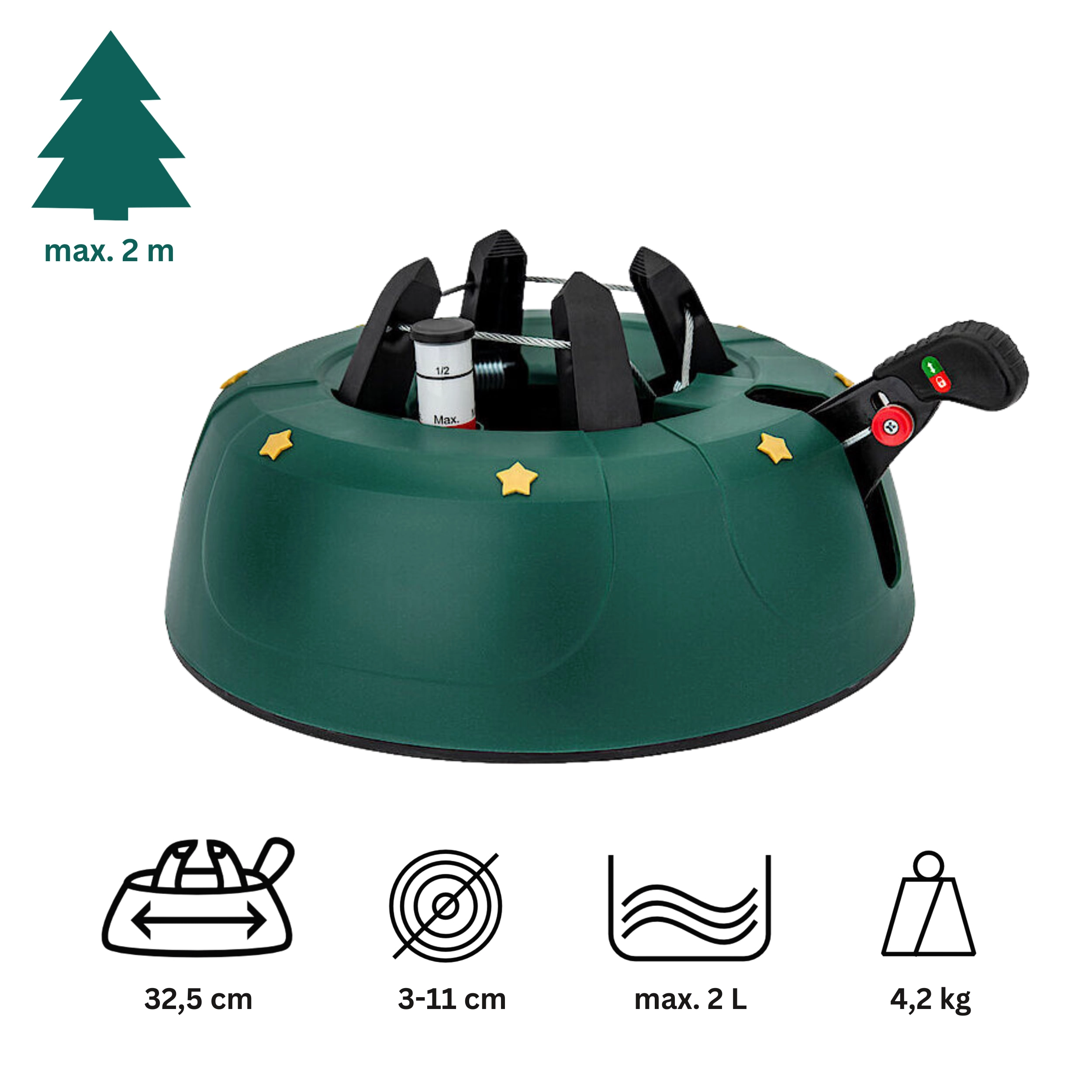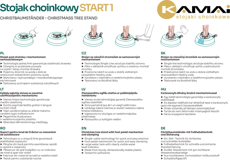 Solidny stojak na choinkę Kamai Start 1 zapewnia maksymalną stabilność i bezpieczne mocowanie żywego drzewka do wysokości 2 m. Dzięki zbiornikowi na wodę 2 l z wskaźnikiem poziomu choinka dłużej pozostaje świeża, a automatyczny 4‑punktowy system zaciskowy z linką stalową i zabezpieczeniem dźwigni mocno ściska pień w kilka sekund.