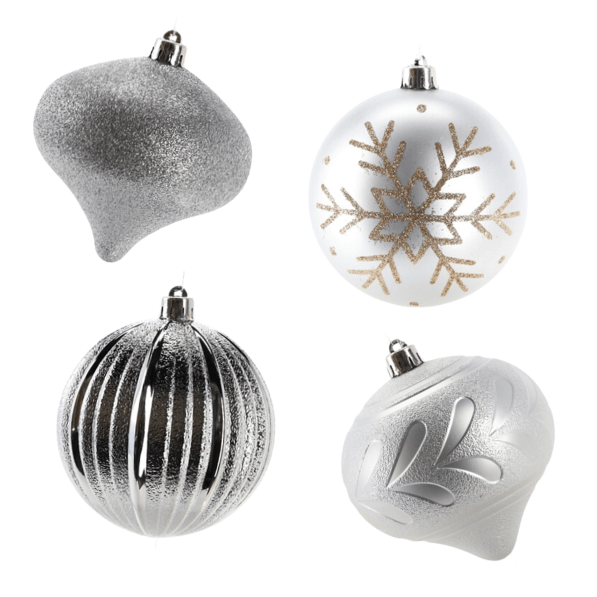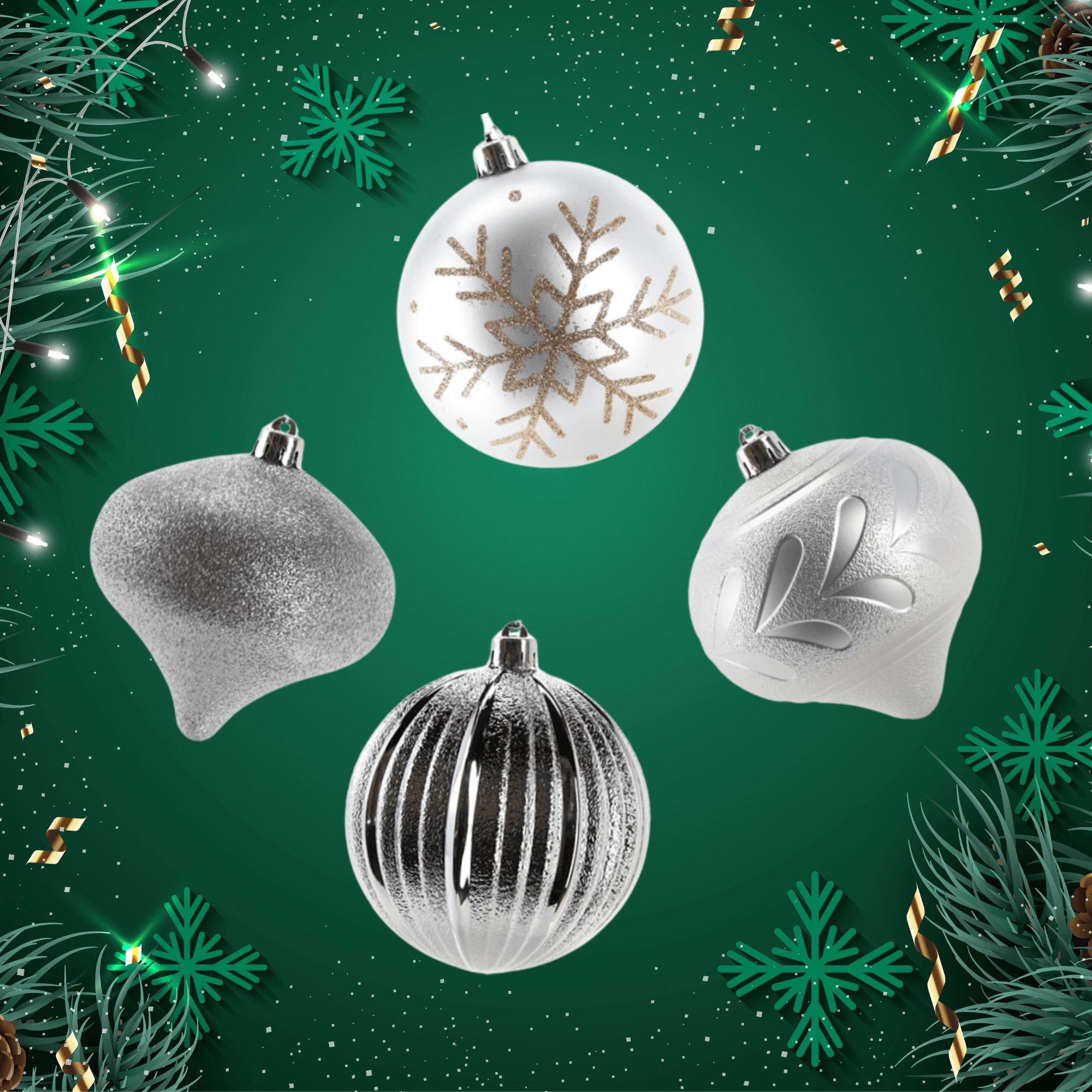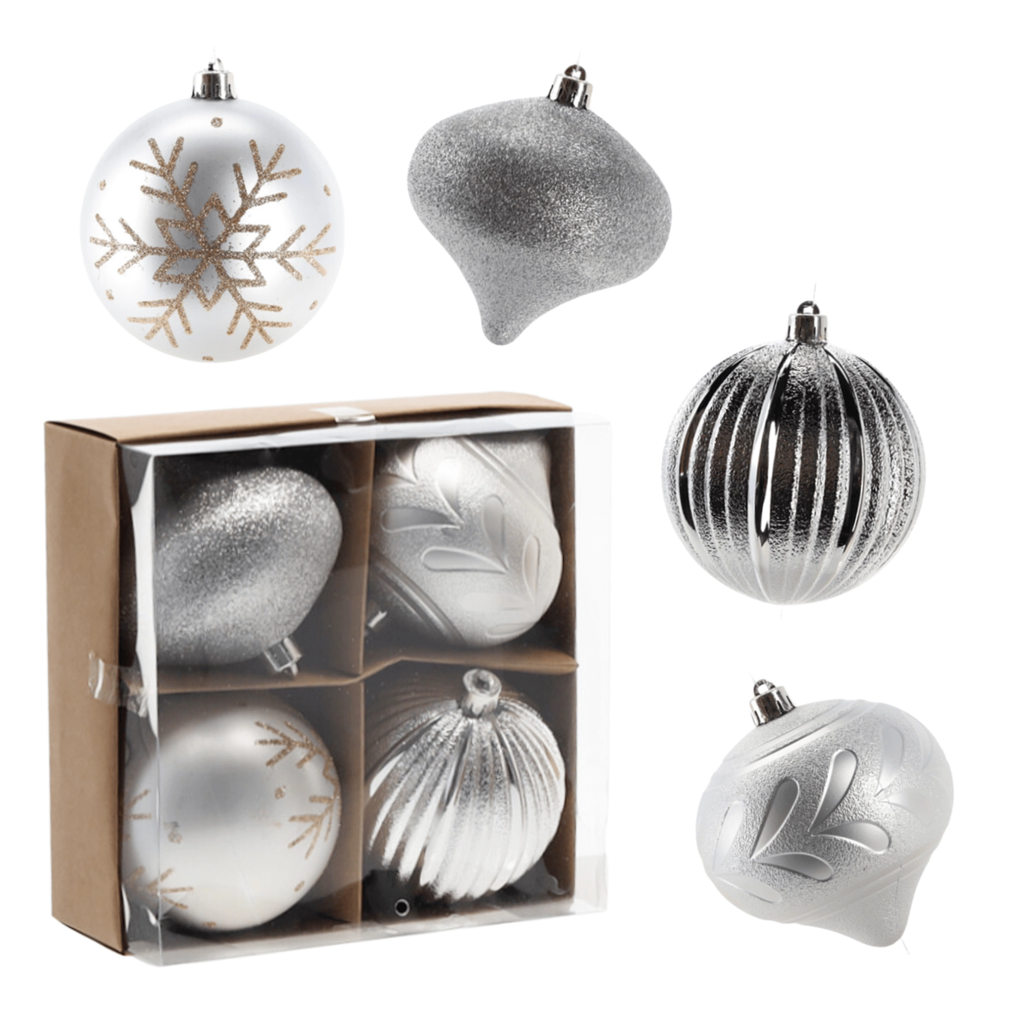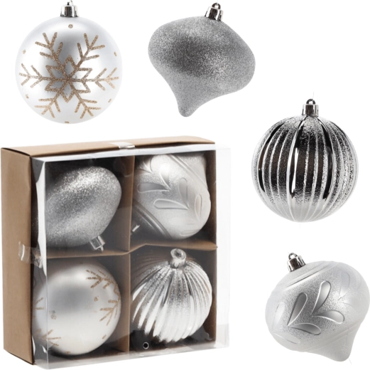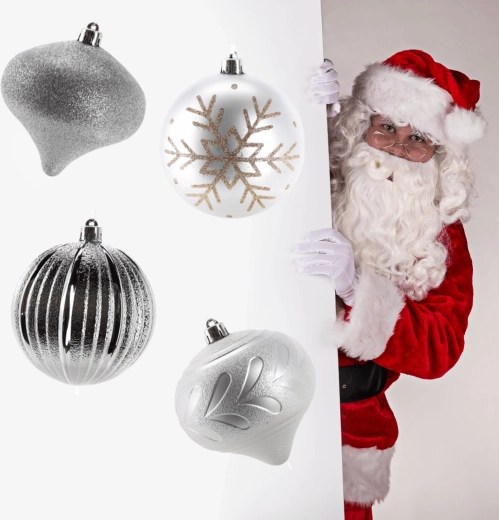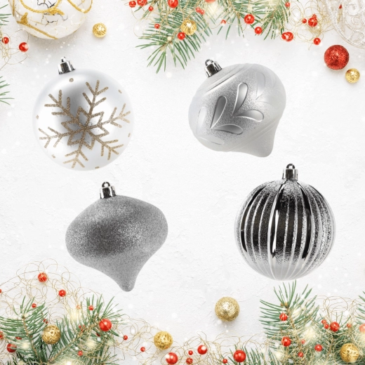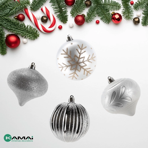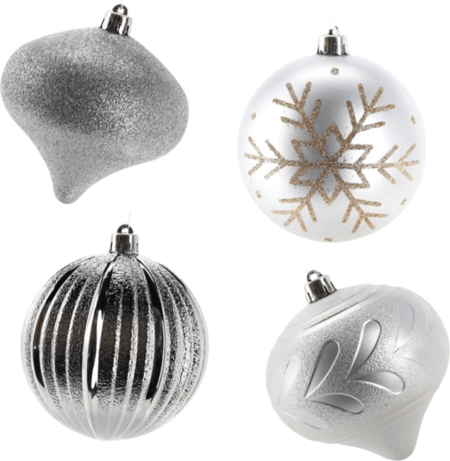 Stylowy zestaw srebrnych bombek wprowadzi do Twojego domu szyk i harmonię. Połączenie matowych, żłobkowanych i brokatowych wykończeń pięknie odbija światło, dzięki czemu Twoja choinka zachwyca z każdego kąta. Dzięki wytrzymałemu materiałowi ozdoby sprawdzą się także w domach z dziećmi lub zwierzętami.