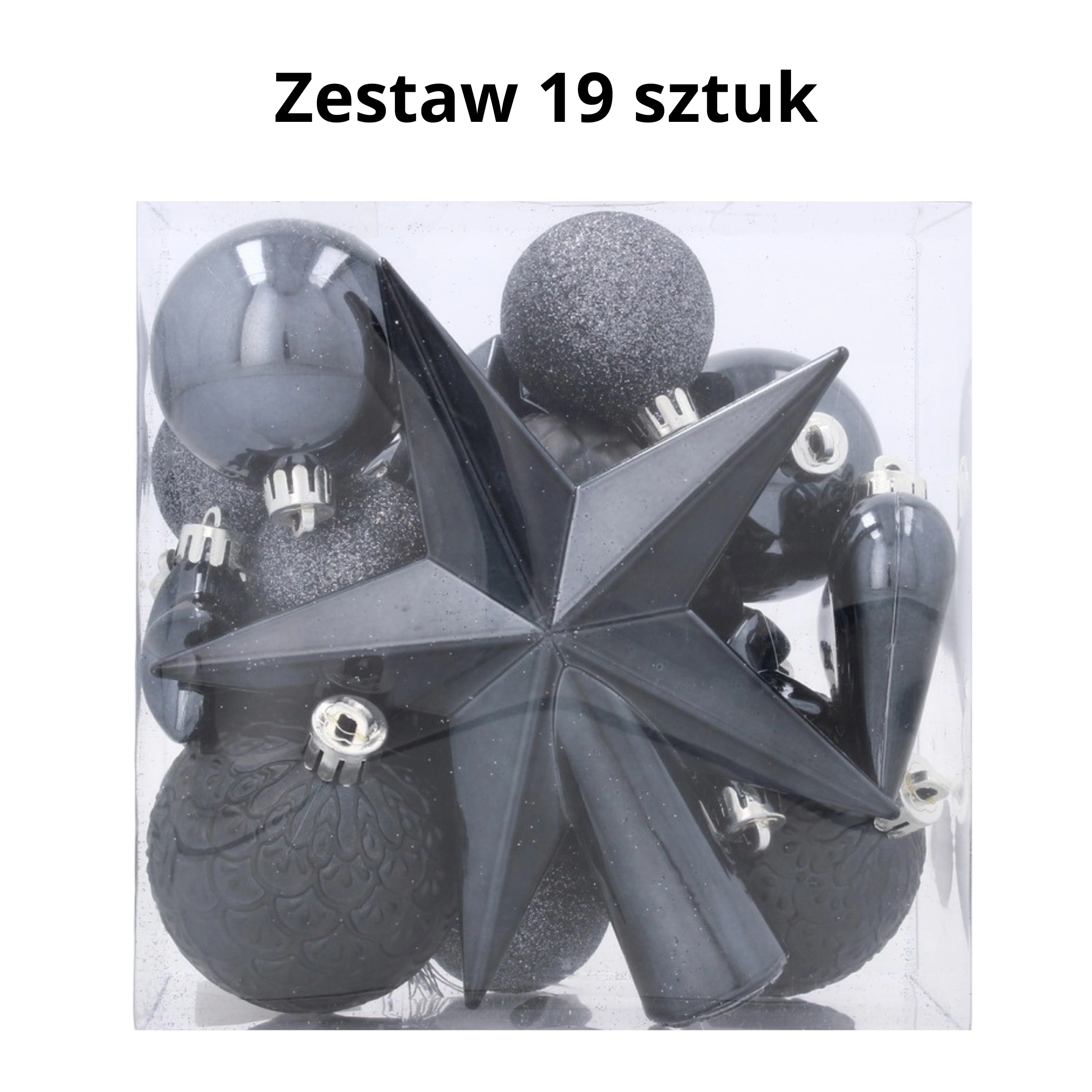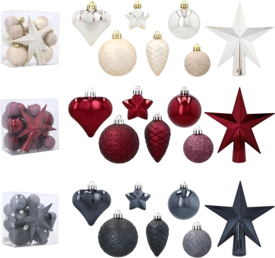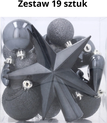 - Kompletny zestaw – 19 ozdób + gwiazda na czubek