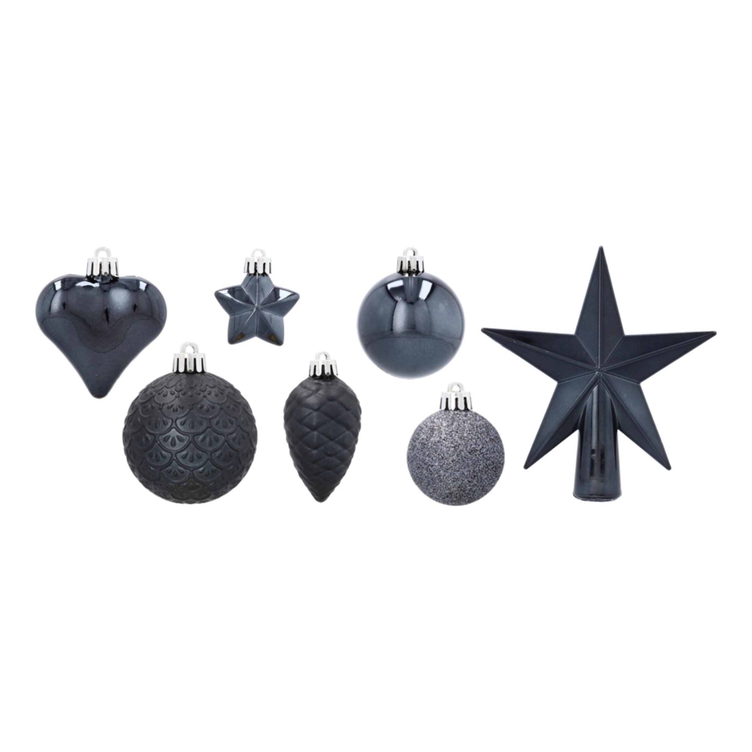 Ten designerski zestaw w modnym odcieniu antracytu łączy matowe, błyszczące i fakturowane wykończenia dla perfekcyjnie zrównoważonego wyglądu. Duża gwiazda na czubek tworzy wyrazisty punkt centralny i dopełnia kompozycję Twojej choinki.
