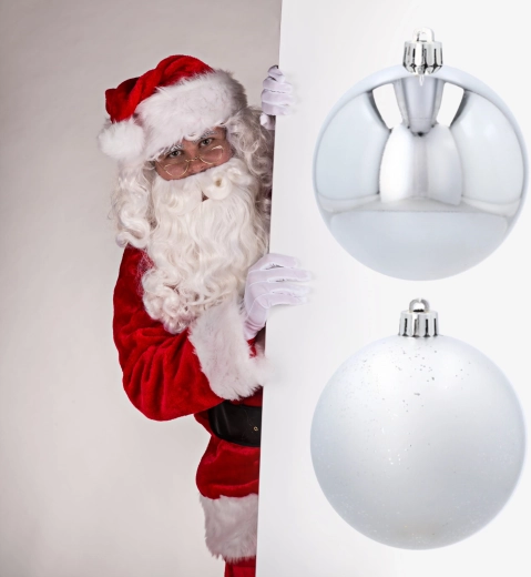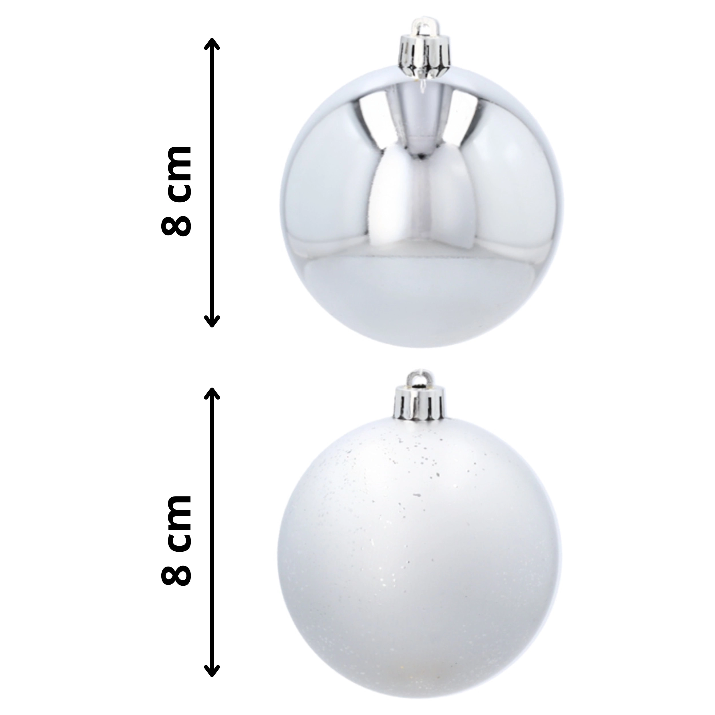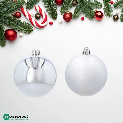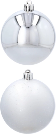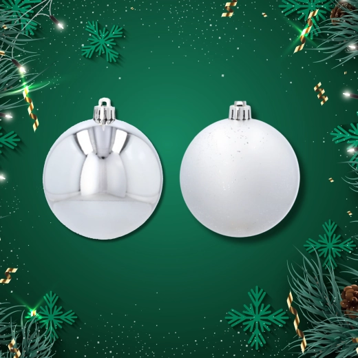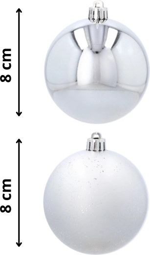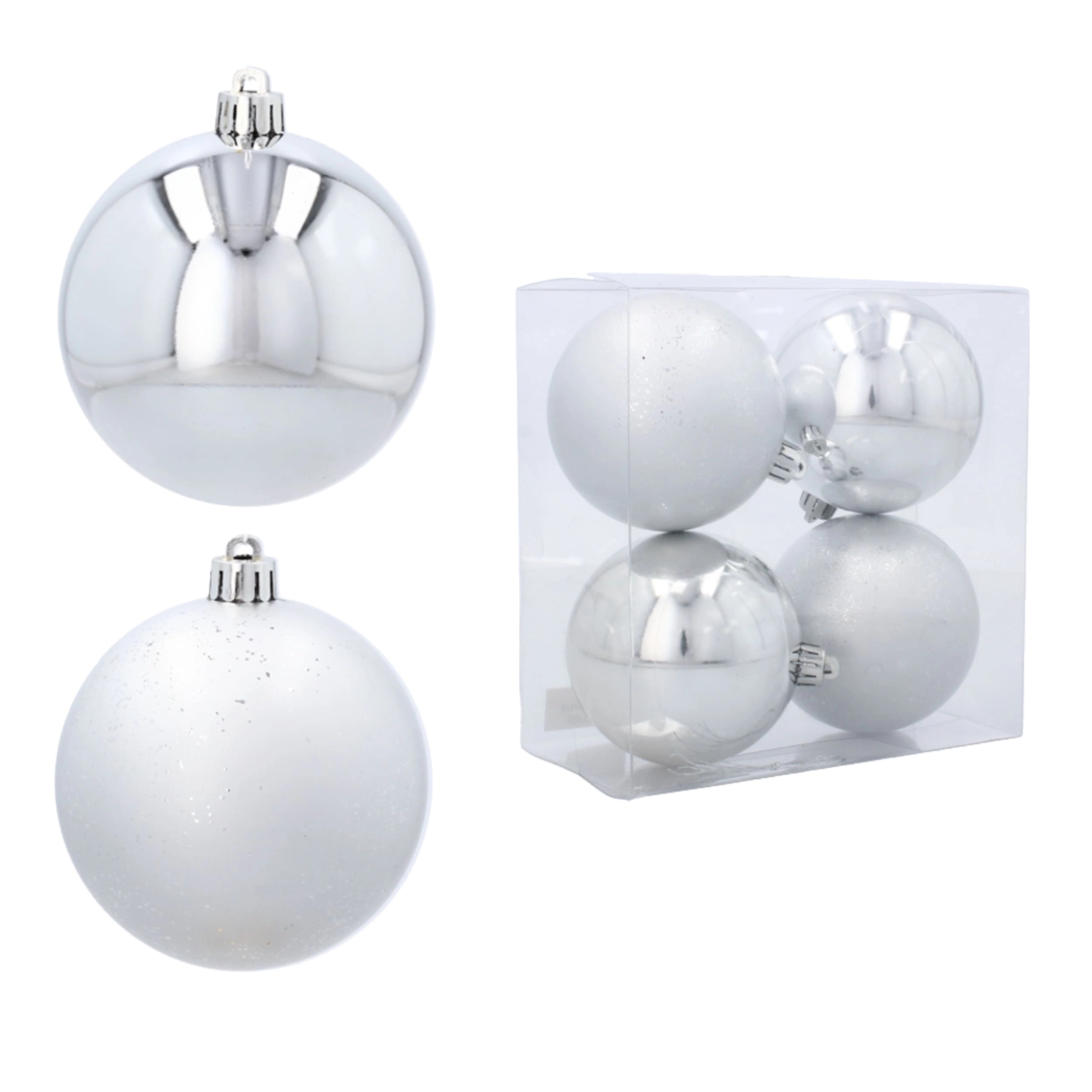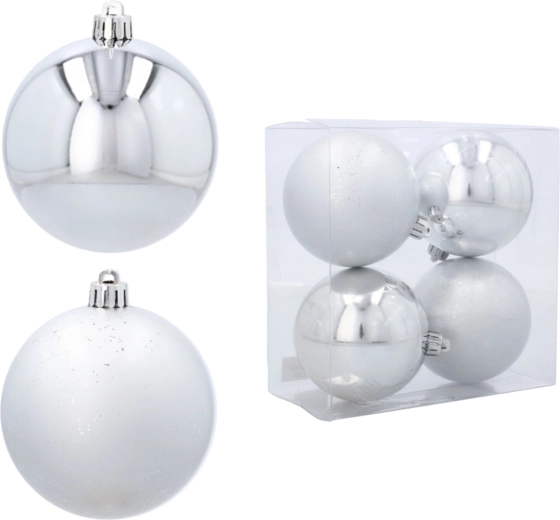 Stwórz magiczną, świąteczną atmosferę z zestawem czterech srebrnych bombek choinkowych o średnicy 8 cm. Dwie sztuki mają gładką, błyszczącą powierzchnię, a dwie delikatnie ziarnistą, matową dla zrównoważonego wyglądu bez przesycenia jednym stylem. Bombki wykonane są z nietłukącego się materiału i wyposażone w srebrne sznureczki do łatwego zawieszenia.