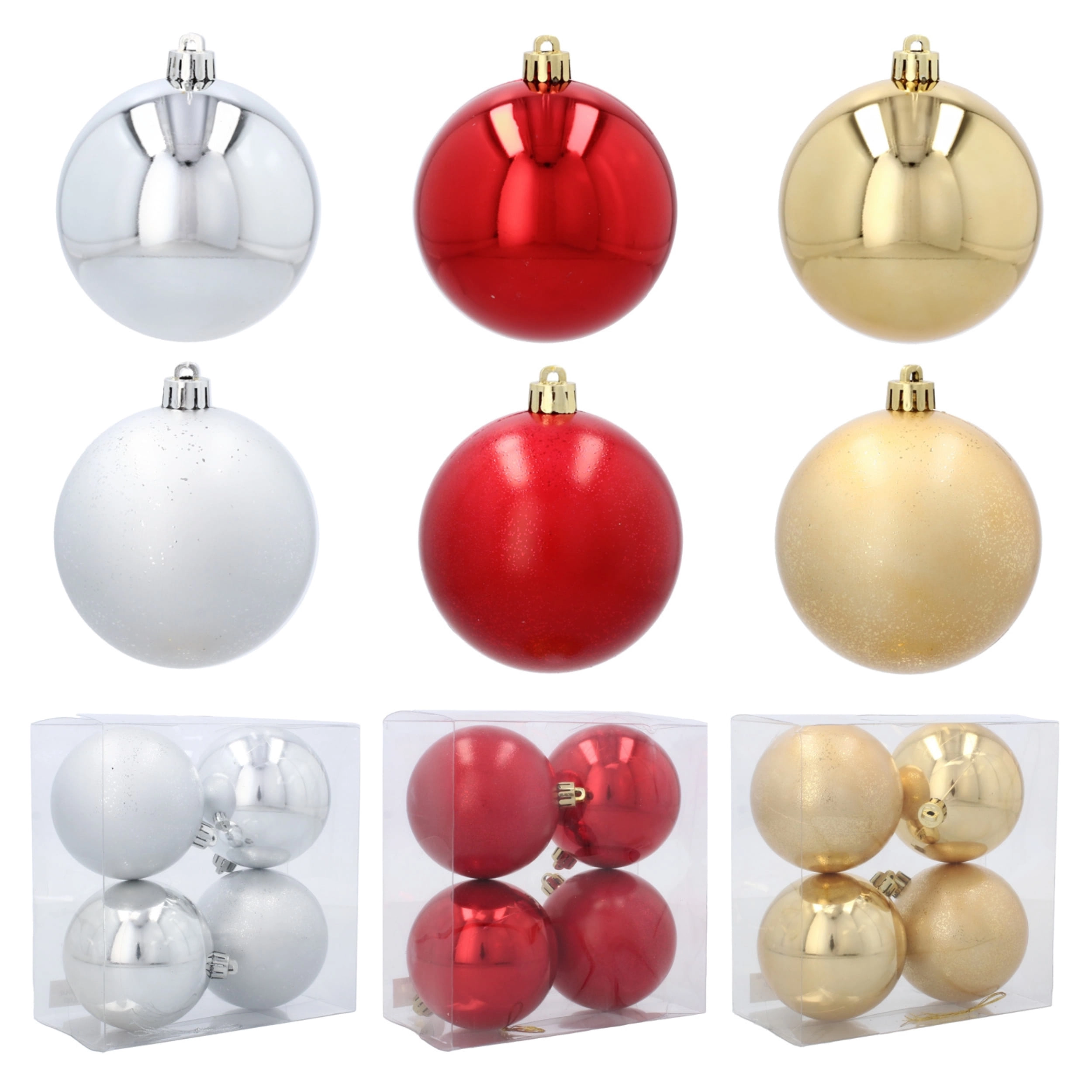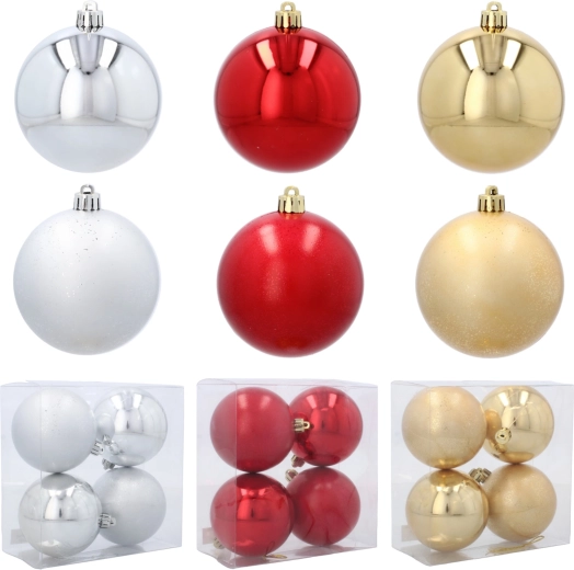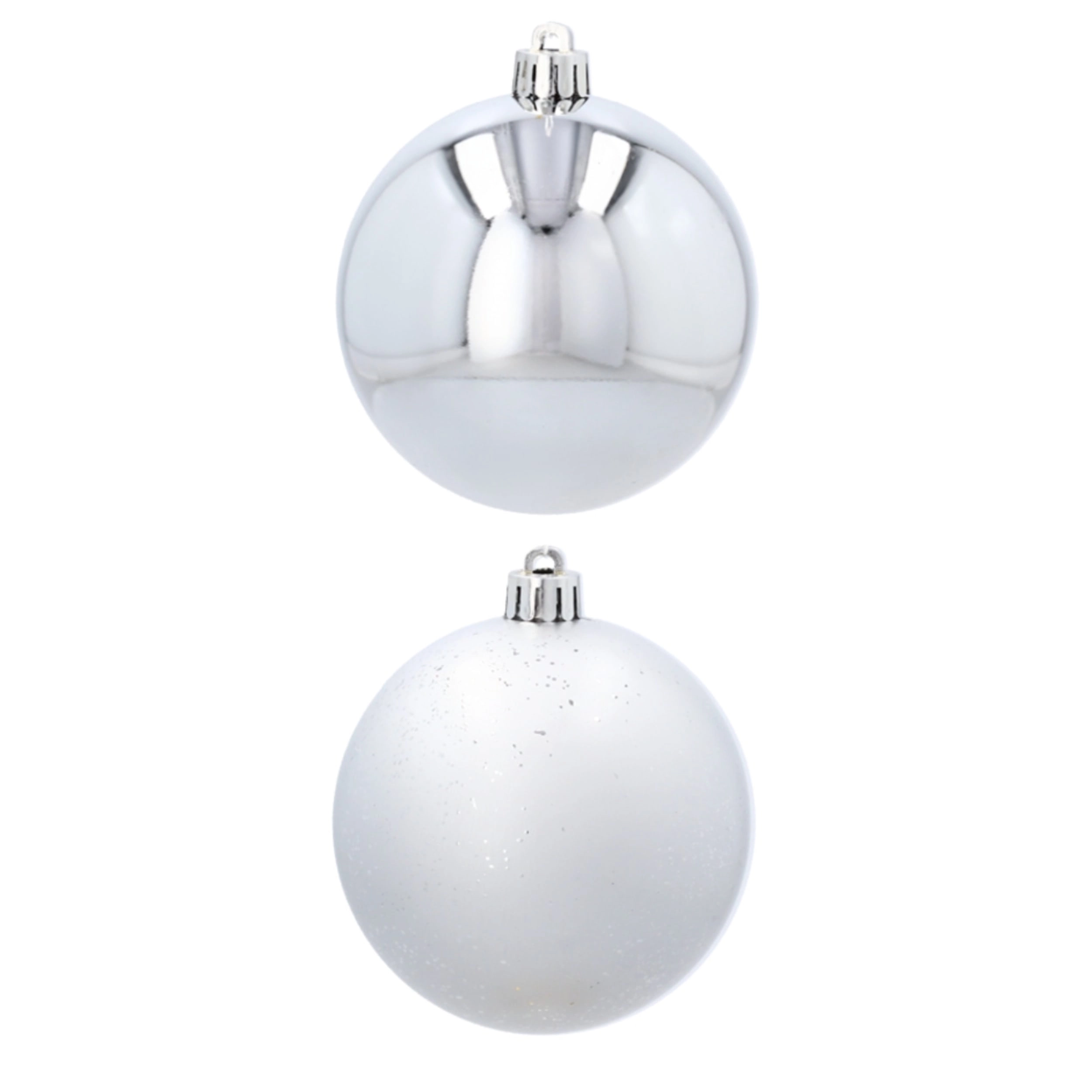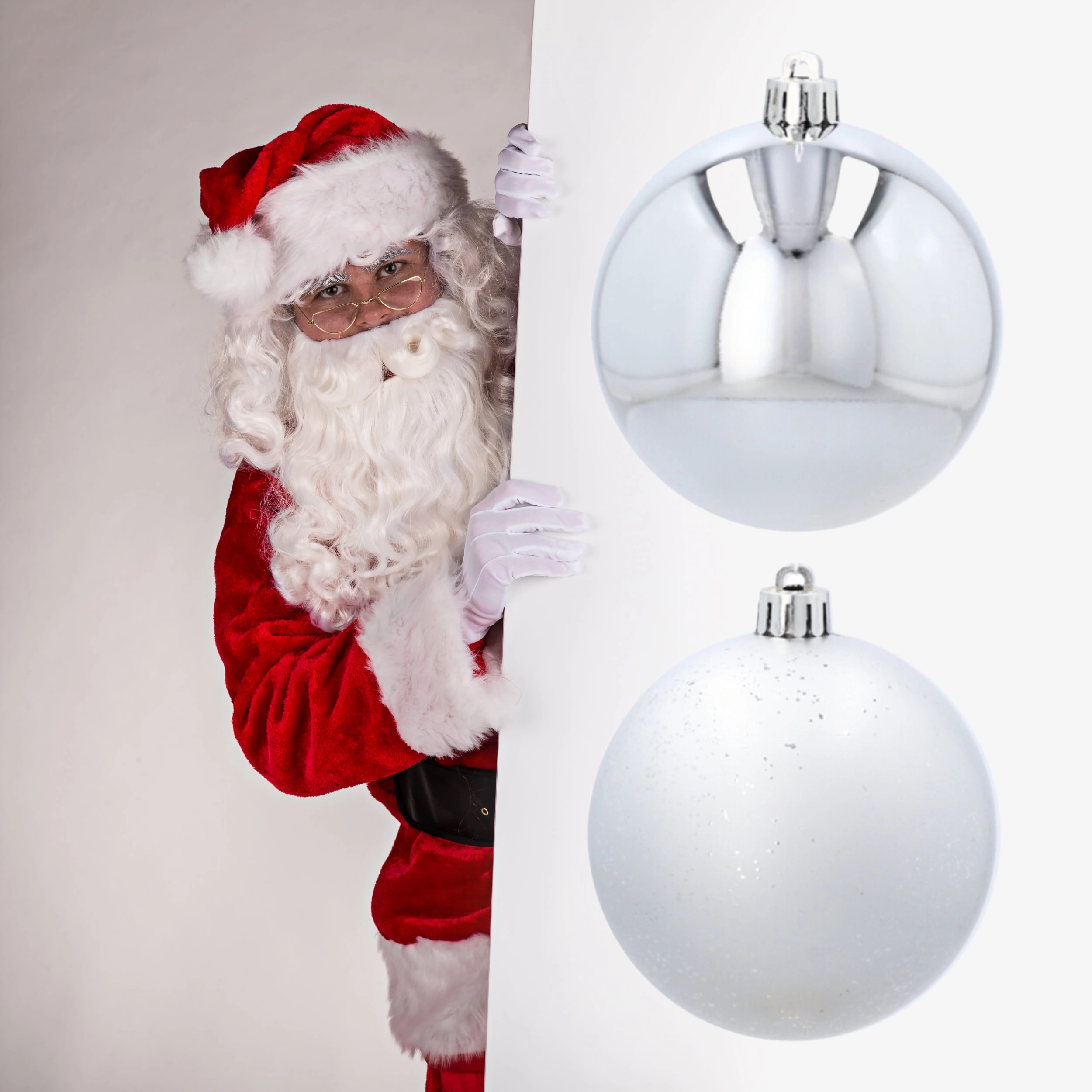 Stwórz magiczną, świąteczną atmosferę z zestawem czterech srebrnych bombek choinkowych o średnicy 8 cm. Dwie sztuki mają gładką, błyszczącą powierzchnię, a dwie delikatnie ziarnistą, matową dla zrównoważonego wyglądu bez przesycenia jednym stylem. Bombki wykonane są z nietłukącego się materiału i wyposażone w srebrne sznureczki do łatwego zawieszenia.