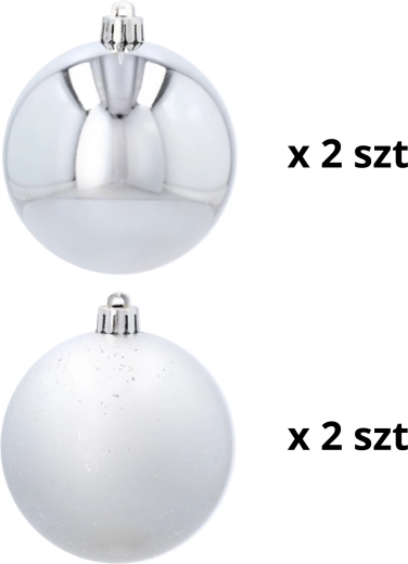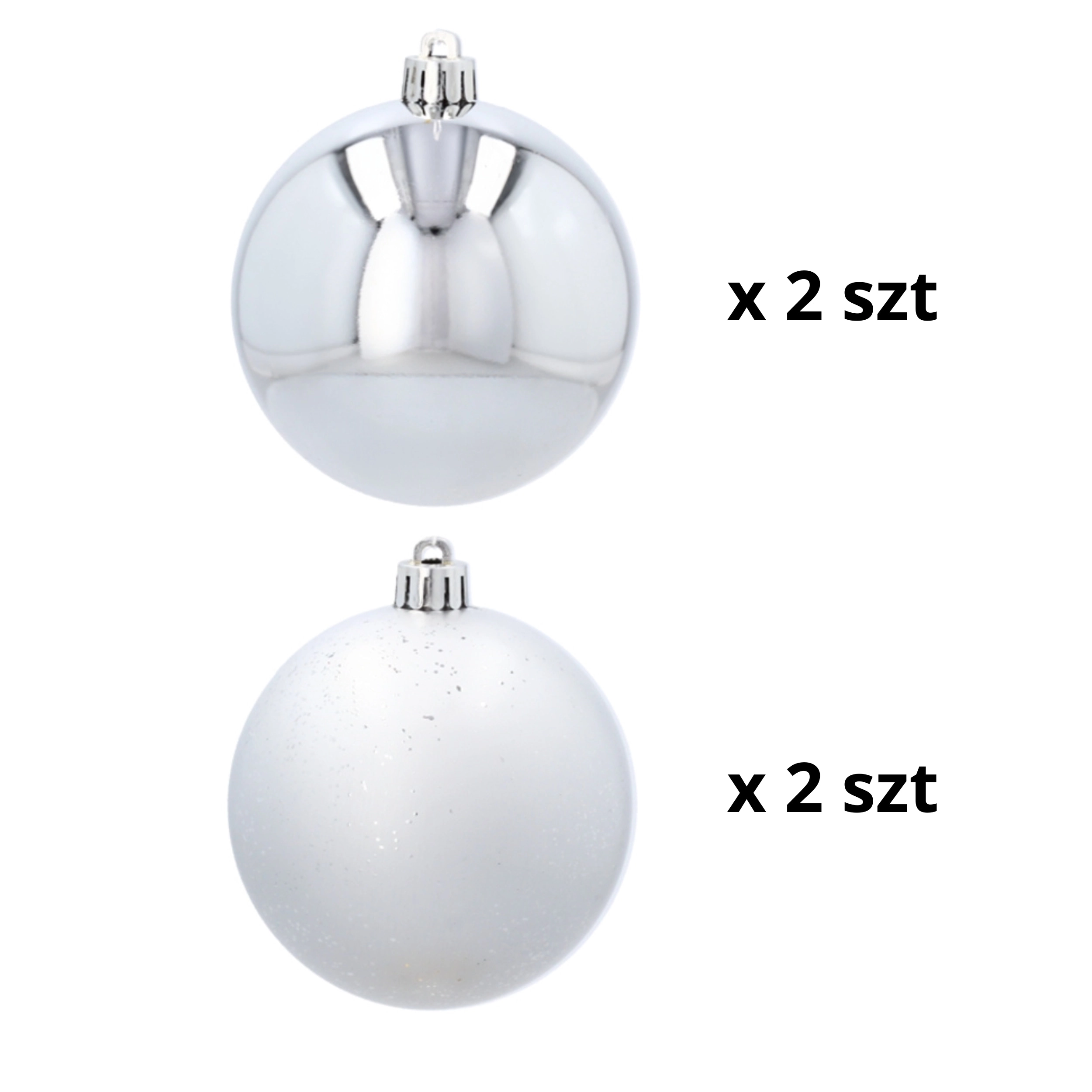 Zestaw łączy 2 bombki błyszczące i 2 delikatnie połyskujące matowe, dzięki czemu choinka wygląda harmonijnie i nie jest zdominowana jednym stylem.