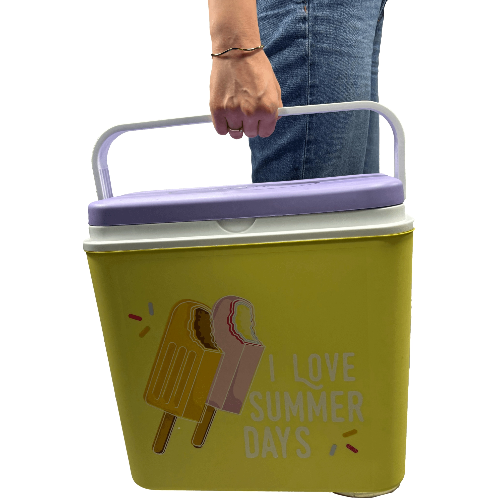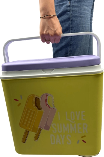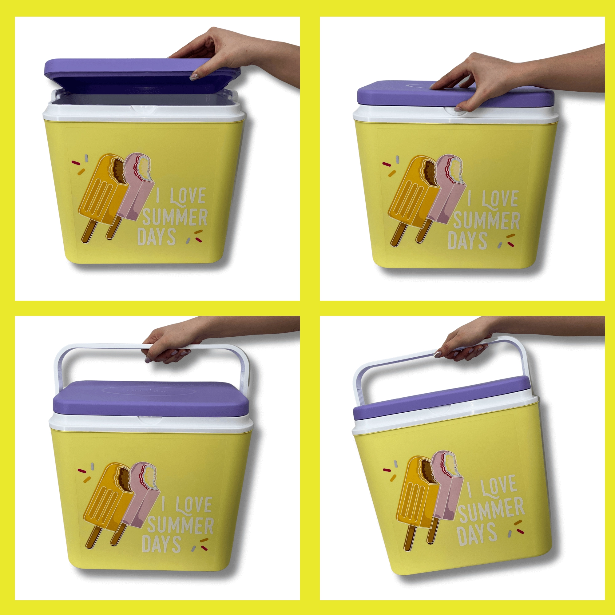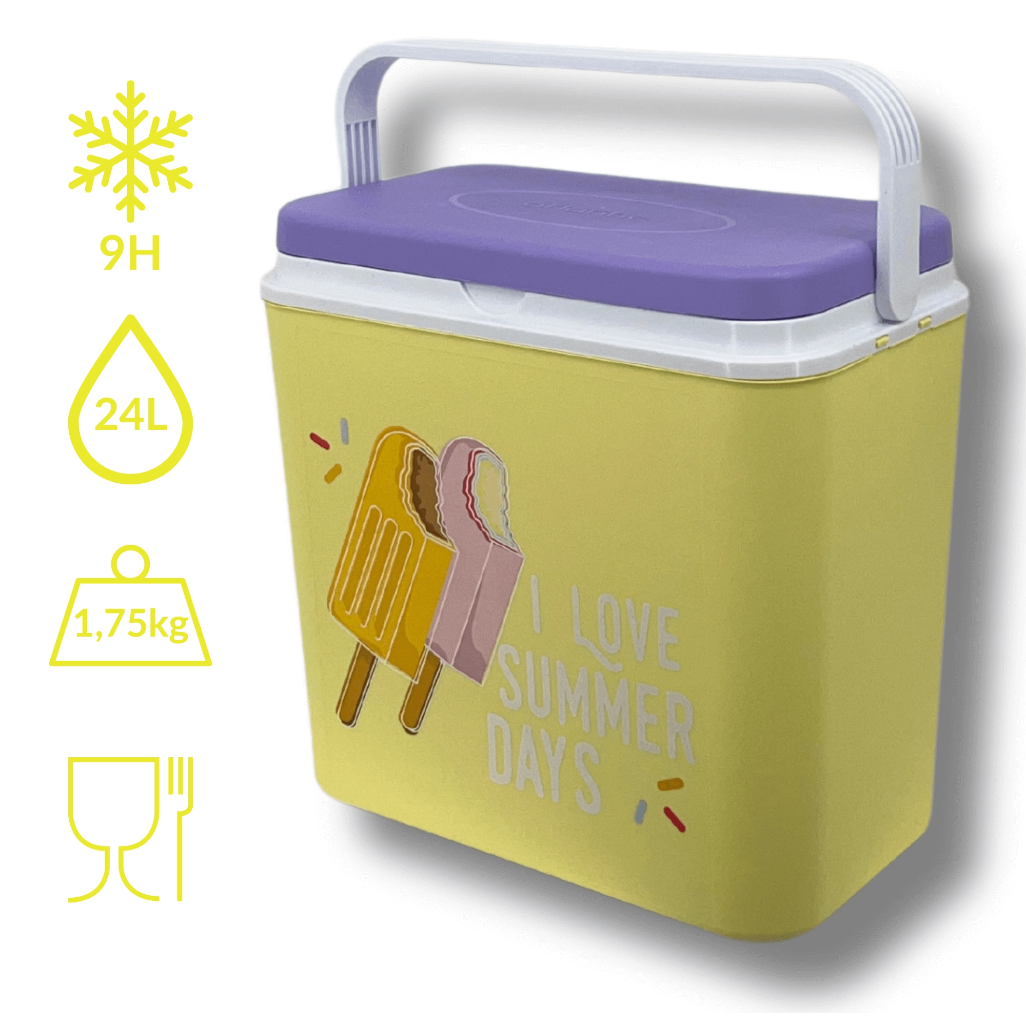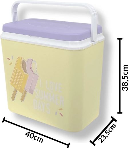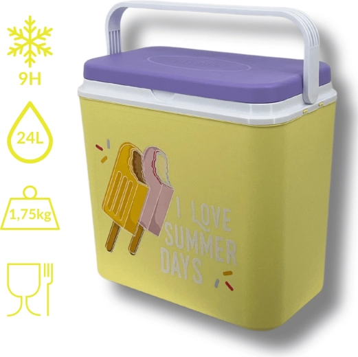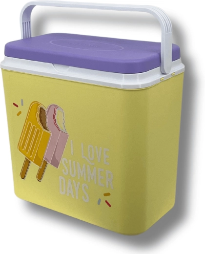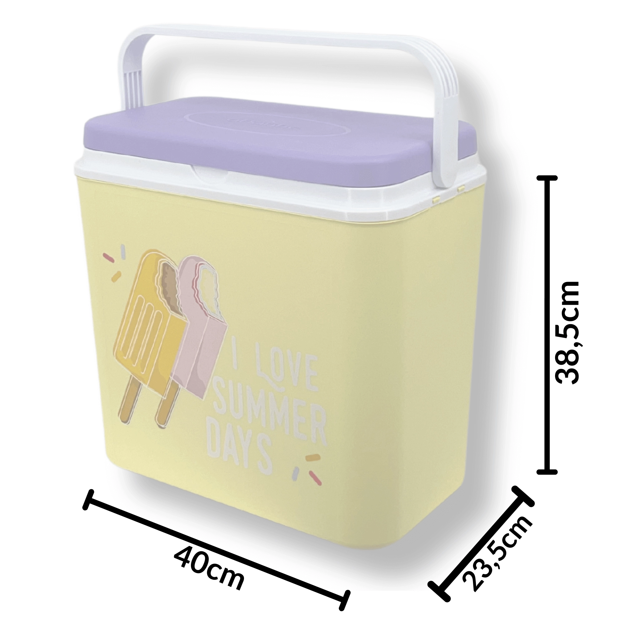 Stylowa przenośna lodówka na wkłady o pojemności 24 l utrzyma Twoje napoje i żywność długo świeże na wycieczkach, piknikach i nad morzem. Dzięki wysokiej jakości europejskiej produkcji, skutecznej izolacji i solidnemu uchwytowi jest idealna na weekendowe wypady i dłuższe podróże. Letni nadruk „I LOVE SUMMER DAYS” i pastelowo fioletowa pokrywa dodają każdej wyprawie świeżej atmosfery. Pojemność 24 l, wydajna izolacja, łatwe czyszczenie, solidny uchwyt i jakość UE.