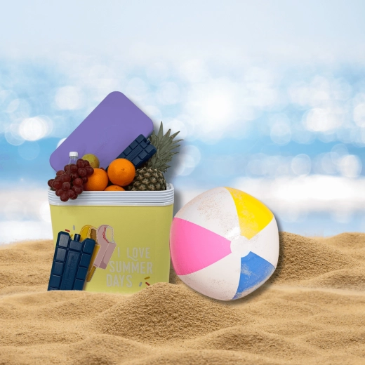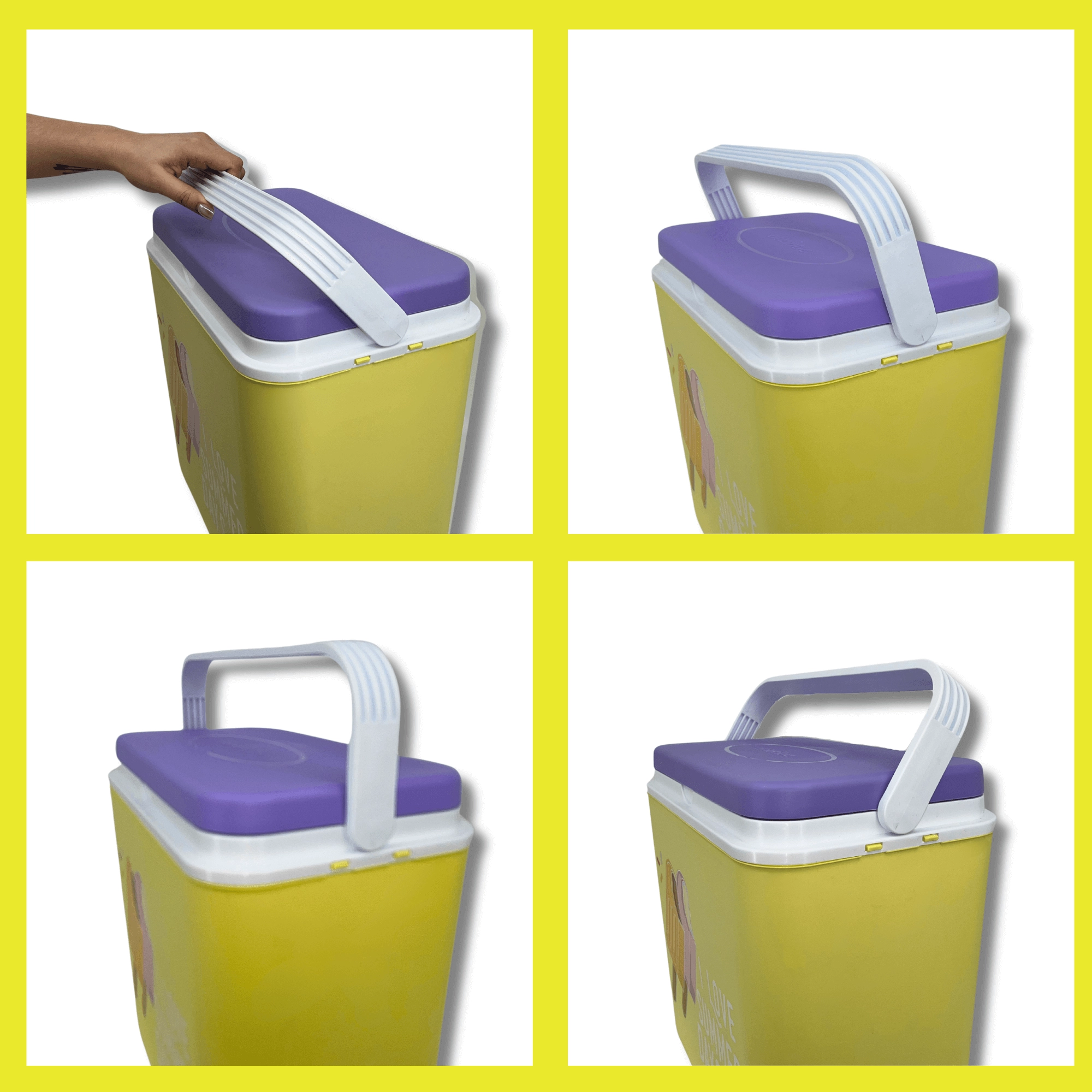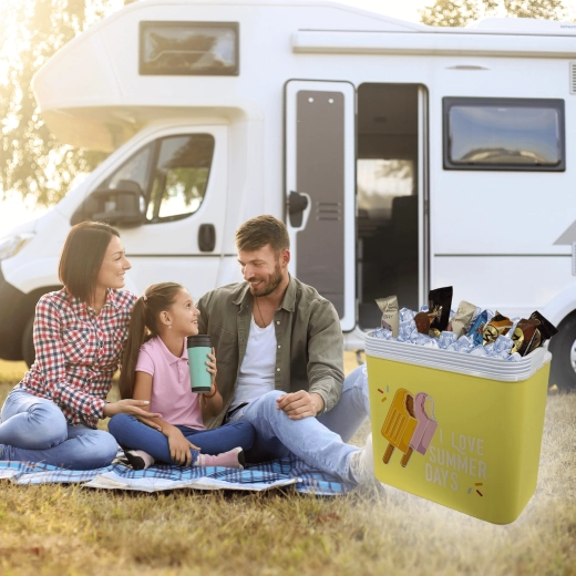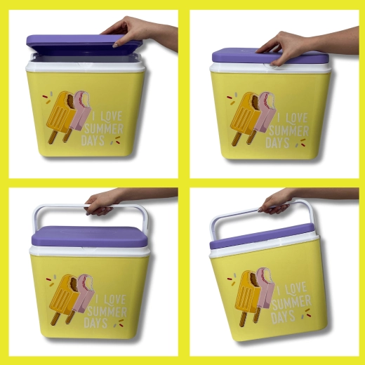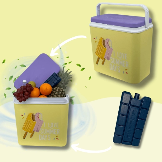 Ciesz się chłodnymi napojami i świeżymi przysmakami przez cały dzień. Ta pasywna lodówka z pojemnością 24 l działa z wkładami mrożącymi, ma zaawansowaną izolację termiczną, a dzięki kompaktowym wymiarom z łatwością mieści się w aucie, kamperze czy na łodzi. Pastelowo żółty korpus z wysokiej jakości cyfrowym nadrukiem i fioletowa pokrywa podkreślają letni styl.