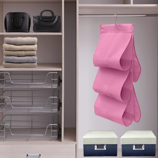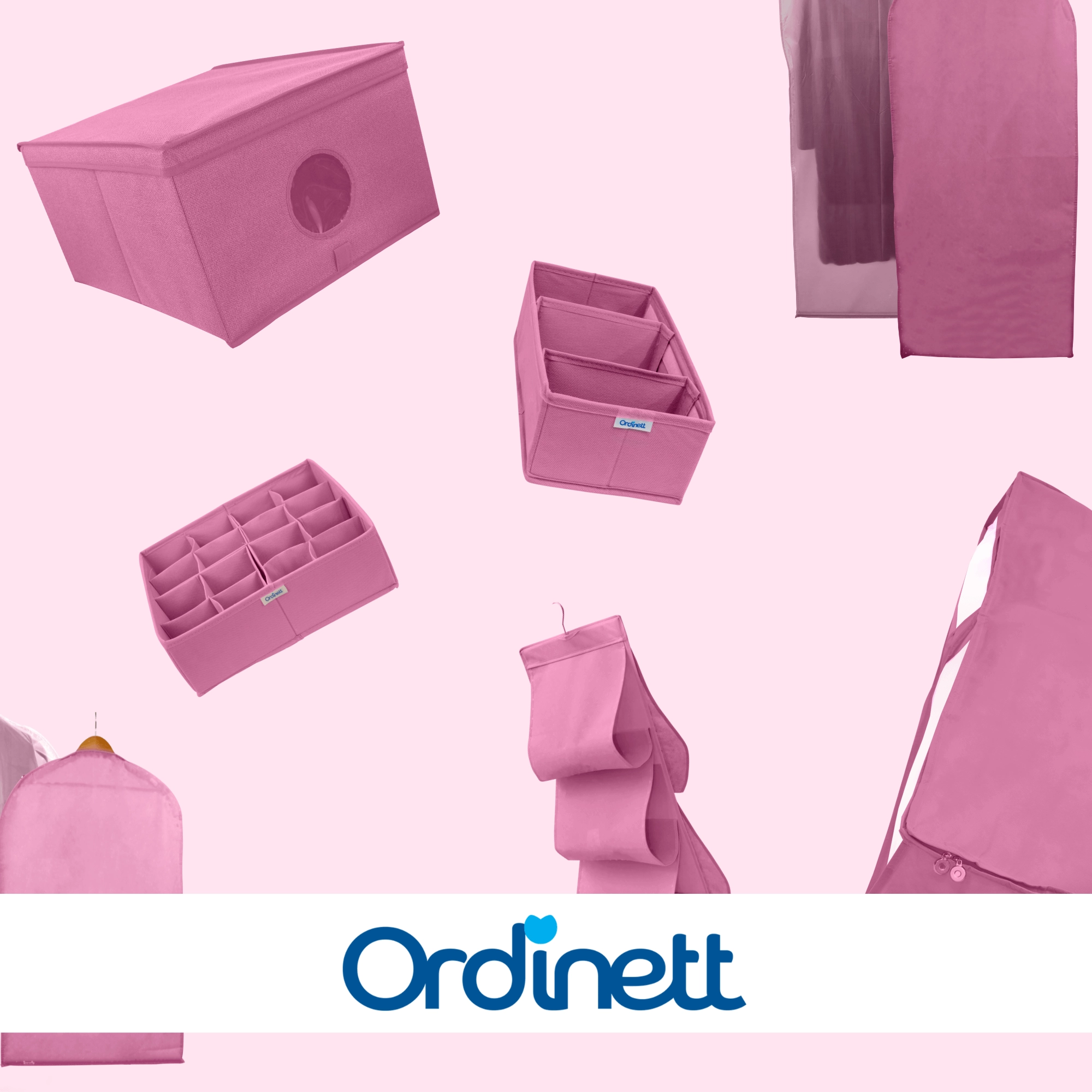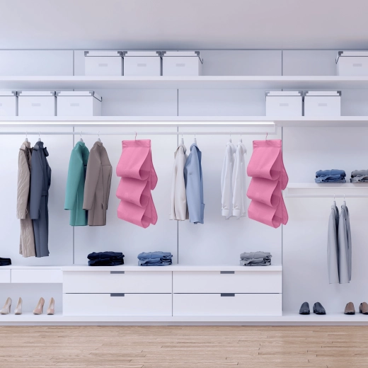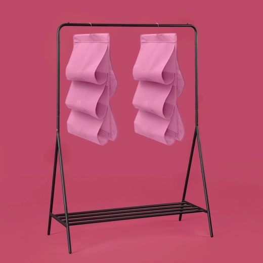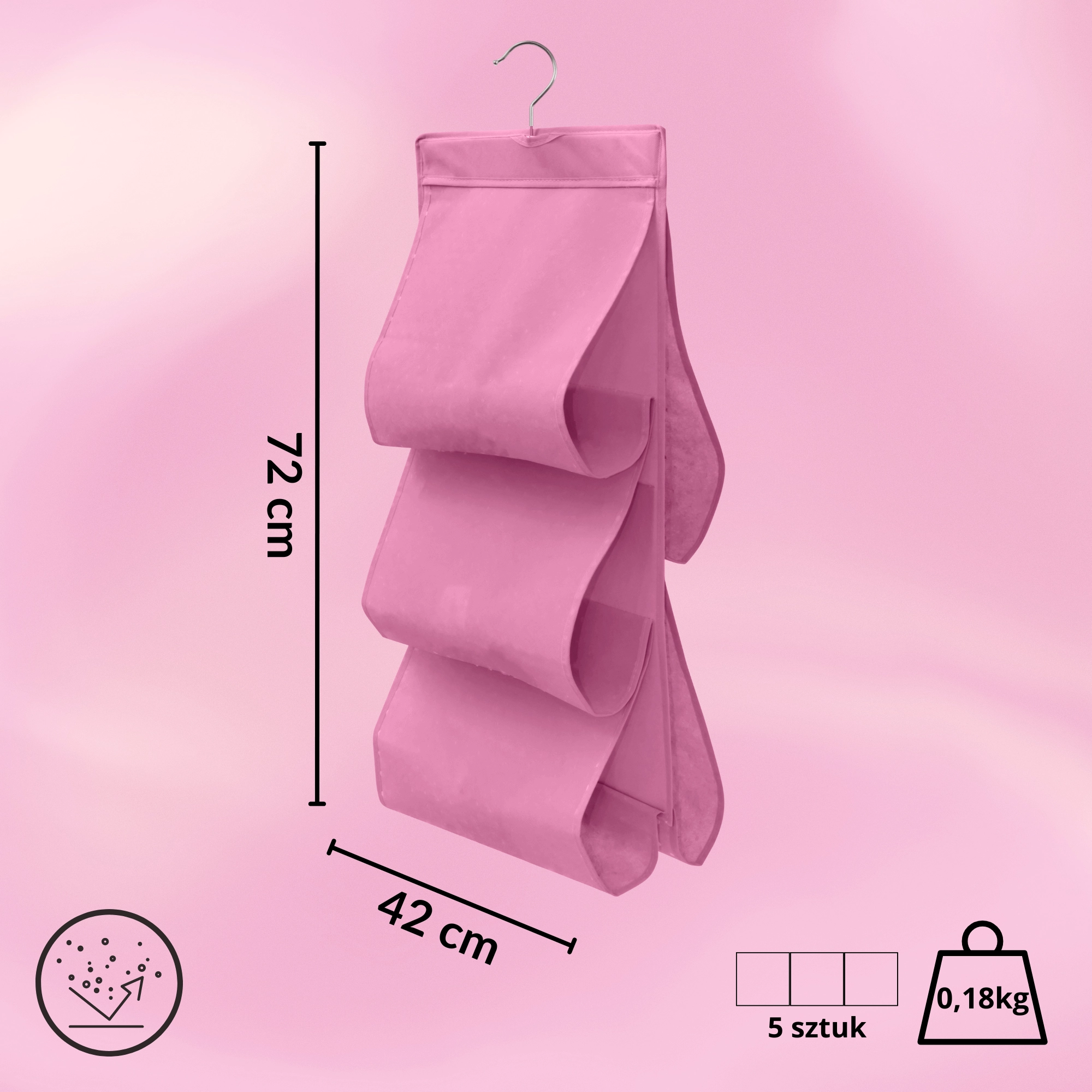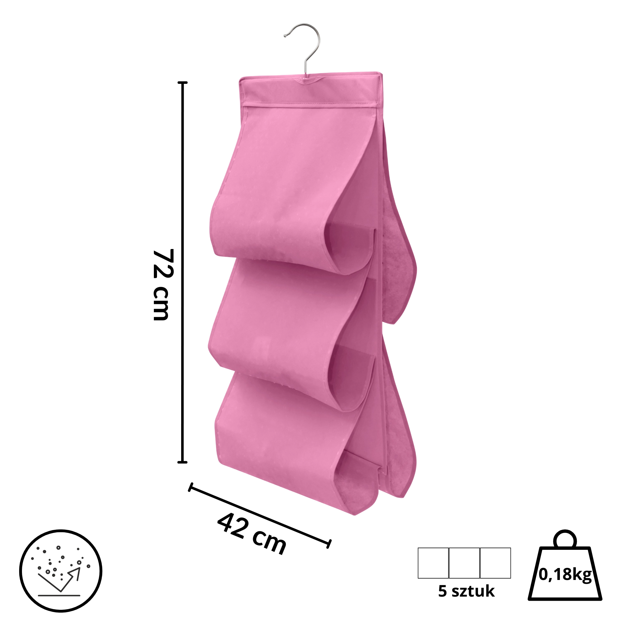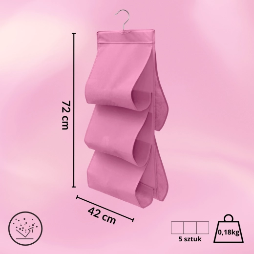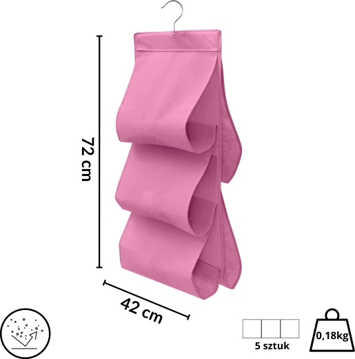 Wytrzymała włóknina (poliester) jest lekka, oddychająca i łatwa w pielęgnacji. Różowe wykończenie dodaje wnętrzu szafy świeżego akcentu i pomaga w utrzymaniu porządku w codziennych rzeczach.
